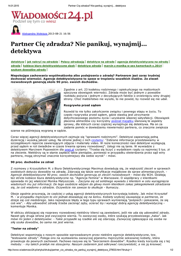 14.01.2015 Partner Cię zdradza? Nie panikuj, wynajmij... detektywa Aleksandra Wołejsza 20130821 16:56 Partner Cię zdradza? Nie panikuj, wynajmij... detektywa jak nakryć na zdradzie Polacy zdradzają detektyw na zdrade agencja detektywistyczna na zdradę kobiece biuro detektywistyczne slask detektyw zdrada marcin z moniką w sex kamerkach x.2014 detektyw zdrada szukam dowodów zdrady Niepokojące zachowania współmałżonka albo podejrzenia o zdradę? Partnerom jest coraz trudniej dochować wierności. Agencje detektywistyczne to spece w tropieniu wszelkich śladów. Ze zleceń rozwodowych generują około 90 proc. swoich dochodów. Zgodnie z art. 23 kodeksu rodzinnego i opiekuńczego na małżonkach spoczywa obowiązek wierności. Zdrada może być jednym z powodów rozkładu pożycia i jednym z decydujących faktów o orzeknięciu winy drugiej strony. Choć małżeństwo nie wyszło, to nie powód, by rozwód się nie udał. Rozgrywka przed sądem Rozwód to nie tylko zakończenie związku i pewnego etapu w życiu. To często rozgrywka przed sądem, gdzie stawką jest utrzymanie dotychczasowego poziomu życia i uzyskanie własnej satysfakcji. Obowiązek płacenia alimentów czy korzystny podział majątku stanowią te aspekty sprawy, dla których coraz częściej wynajmuje się detektywa. Ma on za zadanie pomóc w dowiedzeniu niewierności partnera, co znacznie zwiększa szanse na późniejszą wygraną w sądzie. Coraz więcej agencji detektywistycznych zajmuje się "sprawami rodzinnymi". Detektywi zapewniają pełną dyskrecję i wysoką jakość usług. Na stronie jednej z nich czytamy: "Zebrane informacje przedstawiamy w szczegółowym raporcie zawierającym zdjęcia i materiały video. W razie konieczności nasi detektywi występują przed sądem w roli świadków w czasie trwania sprawy rozwodowej". Usługi nie są tanie. W wywiadzie z detektywem Marcinem Popowskim dla onet.pl czytamy: "Trzeba się liczyć z wydatkiem rzędu co najmniej 5 tys. zł na zlecenie. Niektórzy są w stanie zapłacić takie pieniądze, ponieważ w przypadku stwierdzenia przez sąd winy partnera, mogą otrzymać znacznie korzystniejszy dla siebie wyrok" mówi. 90 proc. dochodów ze zdrad Z rozmowy z Krzysztofem M. z Biura Detektywistycznego Maximus dowiaduję się, że większość zleceń w sprawach osobistych dotyczy dowodów na zdradę. Zdarzają się także weryfikacje majątkowe do spraw alimentacyjnych. Agencje detektywistyczne 90 proc. swoich dochodów generują ze zleceń rozwodowych mówi dla W24. Działają też stricte kobiece biura detektywistyczne np. "Agencja Femina" w Warszawie. O współpracy z klientkami opowiada mi jej właściciel Monika Matyszczak. Zaczyna się od solidnego wywiadu z klientem w celu wyciągnięcia wiadomych mu już informacji. Do tego osobiście wbijam do głowy moim klientkom zakaz jakiegokolwiek zdradzania się, że coś wiadomo o zdradzie. Oczywiście nie zawsze to skutkuje tłumaczy. Oboje zgodnie przyznają, że częściej z usług agencji detektywistycznych korzystają kobiety. Jak mówi Krzysztof M. w przypadku mężczyzn to oni jednak dowiadują się na końcu. Kobiety szybciej zauważają w partnerze, że dzieje się coś niedobrego. Jako największe błędy w tego typu sprawach wymieniają "pośpiech i pokazanie, że się coś wie". Aby udowodnić zdradę trzeba zacisnąć zęby, ocierać łzy i wynająć dobrą agencję detektywistyczną komentuje Monika. W obliczu zbliżającej się rozprawy rozwodowej niektórzy klienci są zawiedzeni, jeśli nie uda się udowodnić zdrady. Nawet gdy druga strona jest zwyczajnie wierna. To zazwyczaj osoby, które szukają przysłowiowego „haka”. Jak mówi mi jeden z detektywów: Takie przypadki są rzadkie ale się zdarzają. Zazwyczaj zgłaszająca się osoba na siłę szuka dowodów, bo sama nie jest wierna. "Tester na zdrady" Detektywi wspominają o nowym sposobie wprowadzanym przez niektóre agencje detektywistyczne, tzw. "testowanie zdrady". Polega ono na wystawieniu zazwyczaj pijanemu mężczyźnie seksownej kobiety, która prowokuje do pewnych zachowań. Fachowo nazywa się to "tworzeniem dowodów". Rzadko kiedy korzysta się z tej metody: my takich praktyk nie stosujemy. Naszym zadaniem jest odkrywać rzeczywistość, a nie ją kreować. http://www.wiadomosci24.pl/artykul/drukuj/partner_cie_zdradza_nie_panikuj_wynajmij_detektywa_279533.html?drukuj=1 1/2 14.01.2015 Partner Cię zdradza? Nie panikuj, wynajmij... detektywa Tester jest to osoba w różny sposób prowokująca, namawiająca do spotkań opowiada mi pracownik agencji Honester. Zdania detektywów co do istnienia standardowych schematów zdrad wśród Polaków są podzielone. Agencja Femina i Maximus mówi przede wszystkim o "syndromie telefonu". Częste ukradkowe smsy, blokowanie go hasłami i pilnowanie jak twierdzy bardzo rzuca się w oczy wspominają. Ponadto częstsze niż zazwyczaj dbanie o siebie oraz typowe zostawanie po godzinach w pracy. Przeczy temu przedstawiciel Honester. Praca detektywa jest ciekawa przede wszystkim dlatego, że spotykamy się ze skrajnie różnymi przypadkami sytuacjami życiowymi. Nigdy nie ma takich samych spraw, nie ma prostych schematów zdrady oraz schematów na zdradę wyjaśnia. Jak nie złamać prawa Konstytucja niesie pewne ograniczenia w pracy detektywa, gwarantuje m.in. wszystkim obywatelom prawo do prywatności. Pracownicy biur detektywistycznych zdradzają, jak sobie z tym radzą. Zdarza się, że doradzamy zdradzanemu małżonkowi, jakie czynności w tym czynności techniczne np. urządzenia może wykorzystać we własnym mieszkaniu, samochodzie, a które to mogą udokumentować zdradę małżonka mówi jeden z detektywów. Zakładanie np: kamer w mieszkaniu nie wchodzi w grę tego nie może zrobić detektyw, ale małżonek, który przeczuwa zdradę, może takową kamerę zainstalować dodaje Monika Matyszczak. Ponadto, gdy detektywi fotografują obserwowana parę w miejscu publicznym typu restauracja ni
