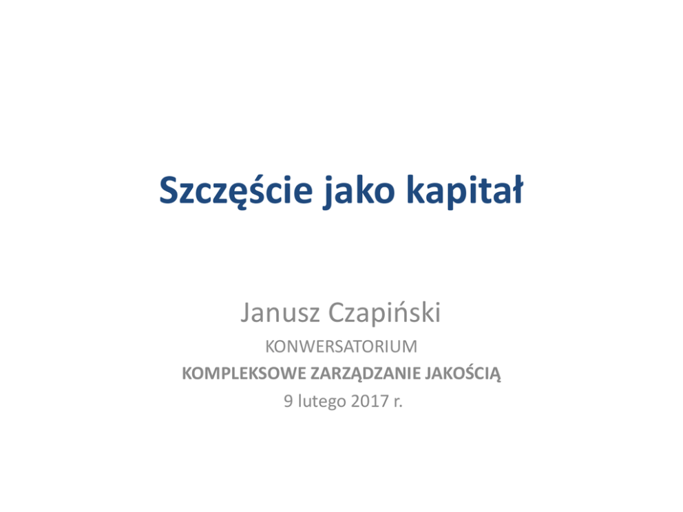 Szczęściejakokapitał JanuszCzapiński KONWERSATORIUM KOMPLEKSOWEZARZĄDZANIEJAKOŚCIĄ 9lutego2017r. Rosnąceznaczenieproblematykidobrostanu psychicznegoiszczęściawpsychologiiiekonomii Główne teorie subiektywnego dobrostanu Zakładającestały potencjalnypoziom szczęścia(setpoint) Niezakładającestałego potencjalnego poziomuszczęścia (Lykken) Teoriepotrzeb(teorie warunkówżycia;teorie motywacjiiaktywności; Teorieadaptacji (Brickmaniin., Lewenstein) Teorieporównańi aspiracji(Easterlin, Frank) Teorie„szczęśliwego” atraktora(Headey i Wearing;Czapiński) Teoriaobiektywnego szczęścia (Kahneman) Teoriegenetyczne Veenhoven) Zależnośćwielkościkorelacjimiędzydwomapomiaramiwskaźników depresji,poczuciaszczęściaizadowoleniazcałegożyciaodczasu odroczeniapomiarów 0,8 0,7 Współczynnikkorelacji 0,6 0,5 0,4 0,3 Poczucieszcześcia 0,2 Ocenacałegożycia 0,1 0 Depresja 3 5 7 9 11 Długoścodroczeniapomiarówwlatach 13 15 Czy stałość dobrostanu wyklucza, lub osłabia jego reaktywność i czy reaktywność dobrostanu wyklucza, lub osłabia jego znaczenie adaptacyjne oraz sprawcze jako czynnika sprzyjającego powodzeniu życiowemu? Ogólnie: jak pogodzić zmienność ze stałością dobrostanu? Cebulowa teoria szczęścia poleeudajmonizmu poznawcze procesy wyjaśniania, integracji i interpretacji zdarzeń satysfakcje cząstkowe surowe doznania emocjionalne pole hedonizmu ogólny dobrostan subiektywny (bilans afektywny i oceny poznawcze) wola życia (atraktor szczęścia) Struktura dobrostanu psychicznego i kierunki zależności według cebulowej teorii szczęścia Wolażycia (zasóbadaptacyjny) „szczęśliwy” atraktor Ogólnydobrostan subiektywny satysfakcjecząstkowe (reaktywnywskaźnik sytuacjiżyciowej warunki życia Regresjacząstkowadobrostanusubiektywnegonarozpowszechnieniewpopulacji66 krajówgenuszczęściazdominującymiallelamiAprzykontroliPKBnamieszkańca R2=0,27 Zależność między wiekiem a standaryzowanymi wskaźnikami woli życia, ogólnego dobrostanu subiektywnego i zadowolenia ze zdrowia 0,8 0,6 Wolażycia Dobrostansubiektywny Zadowoleniezezdrowia 0,4 0,2 0 -0,2 -0,4 -0,6 -0,8 -1 16-20 21-25 26-30 31-35 36-40 41-45 Wiek 46-50 51-55 56-60 61-65 66-70 71-75 76-80 81+ Efektywność„szczęśliwego”atraktorawzakresieróżnychwskaźników dobrostanupsychicznego, czyliwartośćpredyktywna(procentwyjaśnionejwariancji)wyjściowegopoziomumiardobrostanudla pozytywnejzmianyczterechwskaźnikówdobrostanupsychicznego(woliżycia,ogólnegodobrostanu subiektywnego,zadowoleniazezdrowiaizadowoleniazsytuacjifinansowejrodziny)między2003a2009 rokiemwróżnychgrupachwieku(wiekw2003r.) Proc. 0 10 20 30 16-25 Wiek 50 60 56 30 41 26-40 25 41-55 24 56-65 66+ 40 80 90 100 81 62 72 53 72 34 34 77 42 15 7 70 25 37 72 22 Wolażycia Ogólnydobrostansubiektywny Zadowoleniezezdrowia Zadowoleniezsytuacjifinansowej Efektywność„szczęśliwego”atraktorawzakresieróżnychwskaźnikówdobrostanu psychicznego, czyliwartośćpredyktywna(procentspecyficzniewyjaśnionejwariancji)czynnikówzewnętrznych (zmianynatężeniastresużyciowego,wyjściowegopoziomustresu,zmianywysokościdochodui wyjściowegopoziomudochodu)iczynnikówwewnętrznych(wyjściowegopoziomuodpowiednichmiar dobrostanu)dlaspadkuiwzrostudwóchsyntetycznychwskaźnikówdobrostanupsychicznego(woliżycia iogólnegodobrostanusubiektywnego)orazdlasatysfakcjicząstkowej(zadowoleniazdochodów rodziny)między2003a2009rokiem(czynnikiwewnętrznewchodządorównaniaregresjijakopierwsze) 5,2 3,4 Spadekwoliżycia 0,06 Wzrostwoliżycia 65,9 7 Spadekdobrostanusubiektywnego 1,5 1,9 Wzrostdobrostanusubiektywnego 53 9,2 Spadekzadowoleniazsytuacjifinansowej 5,8 3,4 Wzrostzadowoleniazsytuacjifinansowej 26 Spadekzadowoleniazezdrowia 5,2 czynnikiwewnętrzne 4,5 Wzrostzadowoleniazezdrowia 26,9 0 UWAGI: Istotne są wielkości powyżej 0,5. czynnikizewnętrzne 9,9 10 20 30 40 50 60 70 80 90 100 Dobrostan subiektywny, wola życia i poczucie osamotnienia w różnym czasie przed i po śmierci małżonka 1,5 Wolażycia Dobrostansubiektywny 1 Poczucieosamotnienia 0,5 0 -0,5 -1 -1,5 -6 -4 Liczbalatprzedipośmierciwspółmałżonka 0 2 -2 4 6 Dobrostan subiektywny i wola życia w różnym czasie przed i po rozwodzie -0,1 -0,4 Wolażycia Dobrostansubiektywny -0,7 -1 -6 -4 -2 0 Liczbalatprzediporozwodzie 2 4 Dobrostan subiektywny i wola życia w różnym czasie przed i po zawarciu małżeństwa 0,8 0,7 Dobrostansubiektywny 0,6 Wolażycia 0,5 0,4 0,3 0,2 0,1 0 -6 -5 -4 -3 -2 -1 0 1 2 3 Liczbalatprzedipozawarciumałżeństwa 4 5 6 Prawdopodobieństwomałżeństwa Prawdopodobieństwo zawarcia małżeństwa między 2005 i 2013 rokiem wśród osób stanu wolnego w 2005 r. w zależności od poczucia szczęścia w 2005 r. 0,3 0,27 0,25 0,19 0,2 0,15 0,1 0,04 0,05 0 0 Bardzoszczęśliwi Dosyćszczęśliwi Niezbytszczęśliwi Poczucieszczęścia Nieszczęśliwy Prawdopodobieństwo rozwodu między 2005 i 2013 rokiem w zależności od poczucia szczęścia w różnym czasie przed rozwodem w próbie panelowej 0,25 0,21 Przwdopodobieństworozwodu 0,2 2lata 4lata 0,15 6lat 0,1 0,06 0,05 0,03 0,01 0 Bardzoszczęśliwi Dosyćszczęśliwi Niezbytszczęśliwi Nieszczęśliwi 0,7 0,17 0,15 0,6 Wyleczenie Zachorowanie 0,5 0,13 0,11 0,09 0,07 0,4 0,05 Niski Umiarkowany Poziomdobrostanu Wysoki Bardzowysoki Prawdopodobieństwowyleczenia Prawdopodobieństwozachorowania Prawdopodobieństwo zachorowania i wyleczenia z choroby między 2013 i 2015 rokiem w zależności od poziomu ogólnego dobrostanu subiektywnego w 2013 r Prawdopodobieństwopoważnejchoroby Prawdopodobieństwo poważnej choroby w 2015 roku w zależności od poziomu ogólnego dobrostanu subiektywnego w 2011 r. przy kontroli wieku i poważnej choroby w 2011 r. 0,18 0,16 0,14 Mężczyźni 0,12 Kobiety 0,1 Bardzoniski Niski Średni Poziomdobrostanusubiektywnego Wysoki Prawdopodobieństwozgonu Prawdopodobieństwo zgonu między 2011 i 2015 rokiem w zależności od poziomu depresji w 2011 r. przy kontroli wieku i stanu 