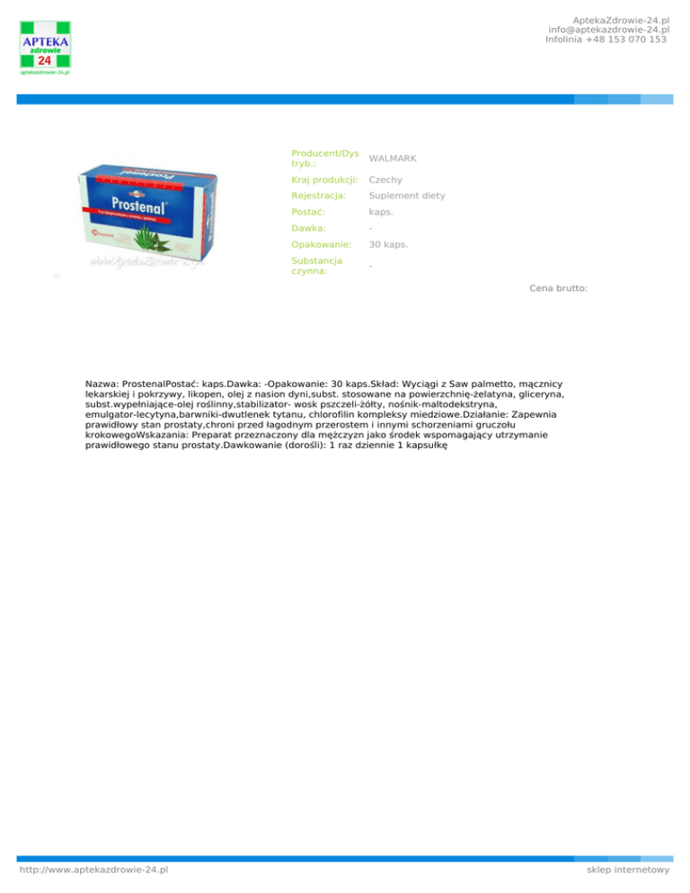 AptekaZdrowie-24.pl [email protected] Infolinia +48 153 070 153 Producent/Dys tryb.: WALMARK Kraj produkcji: Czechy Rejestracja: Suplement diety Postać: kaps. Dawka: - Opakowanie: 30 kaps. Substancja czynna: Cena brutto: Nazwa: ProstenalPostać: kaps.Dawka: -Opakowanie: 30 kaps.Skład: Wyciągi z Saw palmetto, mącznicy lekarskiej i pokrzywy, likopen, olej z nasion dyni,subst. stosowane na powierzchnię-żelatyna, gliceryna, subst.wypełniające-olej roślinny,stabilizator- wosk pszczeli-żółty, nośnik-maltodekstryna, emulgator-lecytyna,barwniki-dwutlenek tytanu, chlorofilin kompleksy miedziowe.Działanie: Zapewnia prawidłowy stan prostaty,chroni przed łagodnym przerostem i innymi schorzeniami gruczołu krokowegoWskazania: Preparat przeznaczony dla mężczyzn jako środek wspomagający utrzymanie prawidłowego stanu prostaty.Dawkowanie (dorośli): 1 raz dziennie 1 kapsułkę http://www.aptekazdrowie-24.pl sklep internetowy