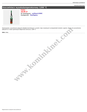 Informacje o produkcie Utworzono 08-03-2017 Uszczelniacz wysokotemperaturowy 1200 °C Cena : 18,00 zł Nr katalogowy : sylikon1200C Dostępność : Dostępny et .c om Zastosowanie: uszczelnienie połączeń wkładów kominkowych ,szczelin i złącz narażonych na bezpośredni kontakt z ogniem. Idealny do uszczelniania połączeń rur i kolan spalinowych.Odporność termiczna 1200 °C w w w .k om in ki n stan: nowy Wygenerowano w programie www.oscGold.com