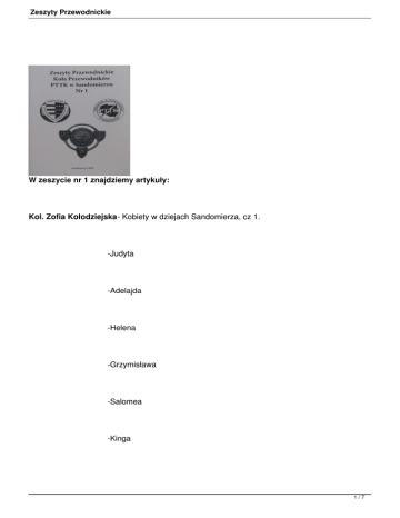 Zeszyty Przewodnickie W zeszycie nr 1 znajdziemy artykuły: Kol. Zofia Kołodziejska- Kobiety w dziejach Sandomierza, cz 1. -Judyta -Adelajda -Helena -Grzymisława -Salomea -Kinga 1/7 Zeszyty Przewodnickie -Gryfina -Halina Krępianka -Jolenta / Helena / -Jadwiga -Adelajda -Jadwiga Andegaweńska -Zofia Drucka -Barbara-cesarzowa Kol. Tomisław Giergiel - Średniowieczne rycerstwo w krajobrazie Sandomierza Kol. Marek Juszczyk - Kościół pw. Nawrócenia św. Pawła w Sandomierzu 2/7 Zeszyty Przewodnickie Zeszyt nr 2 w całości poświęcony wspomnieniu śp. Ks. Bpa Mariana Zimałka. W zeszycie nr 3 znajdziemy artykuły: 3/7 Zeszyty Przewodnickie Kol. Andrzej Cebula - Materiał szkoleniowy- Historia zmagań wojennych 1809 roku w Sandomierzu. Bitwa pod Wrzawami. Kol. Jolanta Leszczyńska - Materiał szkoleniowy - Kościół pw. św. Józefa i zespół poreformacki. W zeszycie nr 4 znajdziemy artykuły: Kol. Marek Juszczyk - Trześń Dr Marek Florek - Zagadki grodów zawichojskich Kol. Marek Juszczyk - Przewodniku czy wiesz? Czy pamiętasz? 4/7 Zeszyty Przewodnickie - 10 zasad dobrego mówcy - 10 zasad dobrego słowa w przekazie przewodnickim - jak jesteśmy postrzegani przez uczestników imprezy - strefa kontaktu - 10 cech przewodnika - odpowiedzialność prawna przewodników. Kol. Marek Juszczyk - Dekoracja malarska o tematyce sejmikowej w kolegiacie opatowskiej Archiwalne zdjęcia naszych koleżanek i kolegów. 5/7 Zeszyty Przewodnickie W zeszycie nr --5Staniek znajdziemy artykuły: Kol. Krzysztof -- Sanktuaria Maryjne diecezji Sandomierskiej Sulisławice Ziemi Sandomierskiej, Ożarów Różańcowa Rodzin, Tarnobrzeg - Pani Różańcowa Matka Boża Dzikowska, Radomyśl - -Matka Boża Bolesna, Janów Lubelski -Czarny Łaskawa Różańcowa Matka legenda Bożadla Janowska. Andrzej Cebula oprowadzania wycieczek ---- Rola turystyki wKrólowa życiu osób niepełnosprawnych. Metodyka Kol. Marek Juszczyk Uwagi na temat dostępności osób niepełnosprawnych Marian Więcław Zawisza zpracowników Garbowa - Sandomierza człowiek W 100 lecie zorganizowanego krajoznawstwa w Sandomierzu Kol. Marek Juszczyk pochowanych na cmentarzach Lista działaczy, w Sandomierzu i okolicy i przewodników PTK-PTTK Janusz Pawłowski - Medale i odznaki Kol. Jakub Wrześniak Cichy kącik piosenki turystycznej Marek Juszczyk - Minął Roczek! - Pośpiewanki turystyczne. W zeszycie nr Podstawowe 6 znajdziemy artykuły: -Tomisław Giergiel -"caput Średniowieczny fryz dlapielgrzymkowy heraldyczny przewodników w bazylice turystycznych. katedralnej w Krzysztof Staniek Sandomierski szlak -Sandomierzu. Marek Łygas Aniołowie iinformacje putta Juszczyk budowle Zawichostu. Terrae sandomiriensis"głowa ziemi sandomierskiej. Halina Stec-Kwaśniewicz Gombrowiczowie w Jakubowicach. -Monumentalne Marek Juszczyk Dworek Skorupskich. Halina Stec-Kwaśniewicz szkoleniowej. Śmiłów i współczesność. Na marginesie -wycieczki Sylwia Mironiuk "Blachowanie" czyliprzeszłość otrzęsiny przewodnickie 2011. Odeszli nas... -Z kronikiod Koła 6/7 Zeszyty Przewodnickie W zeszycie nr 7 artykuły: -Agnieszka Krzesimowska -Sandomierskie Soplicowo, dwór, gospodarze, goście -Krzysztof Staniek Najświętszej Maryiznajdziemy Panny Efez czy Jerozolima? Tradycje dotyczące ostatnich dni ariańskim ziemskiego życia -Elżbieta Juszczyk Kamienica-dwór w Ublinku k/Włostowa zwana zborem -Sylwia MironiukOtrzęsiny przewodnickie 2013 Z Kroniki Koła Odeszli od nas Zeszyty przewodnickie można zakupić w PTTK, ul.Rynek 12 w Sandomierzu 7/7