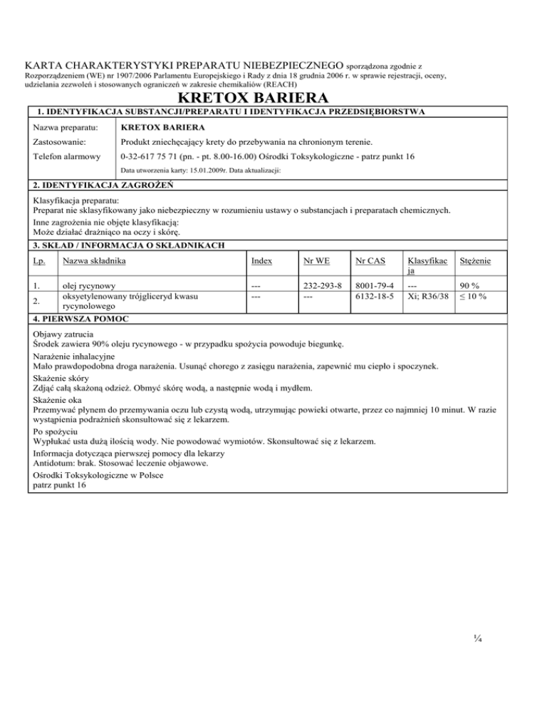 KARTA CHARAKTERYSTYKI PREPARATU NIEBEZPIECZNEGO sporządzona zgodnie z Rozporządzeniem (WE) nr 1907/2006 Parlamentu Europejskiego i Rady z dnia 18 grudnia 2006 r. w sprawie rejestracji, oceny, udzielania zezwoleń i stosowanych ograniczeń w zakresie chemikaliów (REACH) KRETOX BARIERA 1. IDENTYFIKACJA SUBSTANCJI/PREPARATU I IDENTYFIKACJA PRZEDSIĘBIORSTWA Nazwa preparatu: KRETOX BARIERA Zastosowanie: Produkt zniechęcający krety do przebywania na chronionym terenie. Telefon alarmowy 0-32-617 75 71 (pn. - pt. 8.00-16.00) Ośrodki Toksykologiczne - patrz punkt 16 Data utworzenia karty: 15.01.2009r. Data aktualizacji: 2. IDENTYFIKACJA ZAGROŻEŃ Klasyfikacja preparatu: Preparat nie sklasyfikowany jako niebezpieczny w rozumieniu ustawy o substancjach i preparatach chemicznych. Inne zagrożenia nie objęte klasyfikacją: Może działać drażniąco na oczy i skórę. 3. SKŁAD / INFORMACJA O SKŁADNIKACH Lp. Nazwa składnika Index Nr WE Nr CAS Klasyfikac ja Stężenie 1. olej rycynowy oksyetylenowany trójgliceryd kwasu rycynolowego ----- 232-293-8 --- 8001-79-4 6132-18-5 --Xi; R36/38 90 % ≤ 10 % 2. 4. PIERWSZA POMOC Objawy zatrucia Środek zawiera 90% oleju rycynowego - w przypadku spożycia powoduje biegunkę. Narażenie inhalacyjne Mało prawdopodobna droga narażenia. Usunąć chorego z zasięgu narażenia, zapewnić mu ciepło i spoczynek. Skażenie skóry Zdjąć całą skażoną odzież. Obmyć skórę wodą, a następnie wodą i mydłem. Skażenie oka Przemywać płynem do przemywania oczu lub czystą wodą, utrzymując powieki otwarte, przez co najmniej 10 minut. W razie wystąpienia podrażnień skonsultować się z lekarzem. Po spożyciu Wypłukać usta dużą ilością wody. Nie powodować wymiotów. Skonsultować się z lekarzem. Informacja dotycząca pierwszej pomocy dla lekarzy Antidotum: brak. Stosować leczenie objawowe. Ośrodki Toksykologiczne w Polsce patrz punkt 16 ¼ 5. POSTĘPOWANIE W PRZYPADKU POŻARU Zalecenie ogólne Usunąć z zagrożonego obszaru osoby niepowołane, niebiorące udziału w likwidowaniu pożaru. Usunąć źródła zapłonu, nie palić. W razie potrzeby wezwać Straż Pożarną tel. 998 Właściwe środki gaśnicze Gaśnice pianowe, śniegowe (CO2),proszkowe lub mgła wodna. Niewłaściwe środki gaśnicze Zwarty strumień wody. Środki ochrony indywidualnej dla strażaków Zalecana ochrona dróg oddechowych 6. POSTĘPOWANIE W PRZYPADKU NIEZAMIERZONEGO UWOLNIENIA DO ŚRODOWISKA Osobiste środki ostrożności Unikać kontaktu ze skórą i oczami. Stosować odzież ochronną (roboczą), rękawice (odporne na oleje). Środki ostrożności w zakresie ochrony środowiska: Nie dopuszczać, aby substancja przedostała się do ścieków, kanalizacji i cieków wodnych. Metody oczyszczania Zlokalizować i zatrzymać wyciek. Zebrać uszkodzone opakowania do pojemnika na odpady - oznakować. Miejsce skażenia zmyć wodą. 7. POSTĘPOWANIE Z SUBSTANCJĄ/PREPARATEM I JEJ/JEGO MAGAZYNOWANIE Obchodzenie się z preparatem Przed zastosowaniem preparatu zapoznać się z tekstem etykiety. Zapobiegać jakiemukolwiek kontaktowi z ustami oraz ze skórą i oczami. Podczas pracy nie jeść, nie pić i nie palić. Przed jedzeniem, piciem lub paleniem umyć ręce i twarz. Przechowywanie Przechowywać pojemnik szczelnie zamknięty w wentylowanym pomieszczeniu, w miejscu suchym i chłodnym, z dala od dzieci, żywności, napojów i pasz dla zwierząt. Zabezpieczyć przed działaniem wysokich temperatur i promieni słonecznych. Preparat zachowuje swoje właściwości fizyczne i chemiczne co najmniej przez okres 3 lat, jeśli jest magazynowany w oryginalnych, nieotwieranych pojemnikach, w temperaturze 0-30oC. 8. KONTROLA NARAŻENIA I ŚRODKI OCHRONY INDYWIDUALNEJ Narażenia w miejscu pracy NDS, NDSCh, NDSP – nie oznaczono Rozporządzenie Ministra Pracy i Polityki Społecznej z dnia 29 listopada 2002 r. w sprawie najwyższych dopuszczalnych stężeń i natężeń czynników szkodliwych dla zdrowia w środowisku pracy (Dz.U. 2002 Nr 217, poz. 1833) Ochrona dróg oddechowych: brak specjalnych zaleceń Ochrona rąk: zaleca się stosowanie rękawic ochronnych (odpornych na oleje). Ochrona oczu: zaleca się stosowanie gogli ochronnych podczas oprysku Ochrona ciała: brak specjalnych zaleceń 9. WŁAŚCIWOŚCI FIZYCZNE I CHEMICZNE Postać fizyczna i barwa: Zapach: pH: Temperatura wrzenia: Temperatura topnienia / zastygania: Temperatura zapłonu: Temperatura samozapłonu: Palność: lepka ciecz barwy słomkowej bez zapachu ~7,0 > 300oC (rozkład, polimeryzuje) < -10oC 230oC nie oznaczona niepalny 2/4 Właściwości wybuchowe: Właściwości utleniające: Lepkość: Gęstość względna: Rozpuszczalność w wodzie: Rozpuszczalność w innych rozpuszczalnikach: Współczynnik podziału n-oktanol / woda nie posiada nie posiada 6.5-8.0 mm2/s 0,97 kg/dm3 trudnorozpuszczalny – tworzy mikro i makro emulsję bezwodny etanol, oleje roślinne nie oznaczony 10. STABILNOŚĆ I REAKTYWNOŚĆ Warunki, których należy unikać: wysoka temperatura, silne nasłonecznienie Materiały, których należy unikać: silne utleniacze Produkty rozkładu: tlenek węgla, dwutlenek węgla. 11. INFORMACJE TOKSYKOLOGICZNE Toksyczność doustna: LD50 dla szczura wynosi ponad 2000 mg/kg (kalkulowane) Toksyczność dermalna: brak danych Toksyczność inhalacyjna: Mało prawdopodobne, aby preparat w normalnych warunkach stosowania i obchodzenia się z nim, powodował szkodliwe skutki. Drażnienie skóry Może powodować podrażnienie Drażnienie oka Może działać drażniąco 12. INFORMACJE EKOLOGICZNE Brak badań ekotoksykologicznych. Zgodnie z kryteriami klasyfikacji preparatów na podstawie zawartości niebezpiecznych składników: w przypadku zagrożenia dla środowiska preparat KRETOX REPELENT nie klasyfikuje się jako niebezpieczny. 13. POSTĘPOWANIE Z ODPADAMI Usuwanie odpadów Niszczyć przez spalenie w specjalnie przeznaczonych do tego urządzeniach odpowiadających przepisom w zakresie utylizacji odpadów