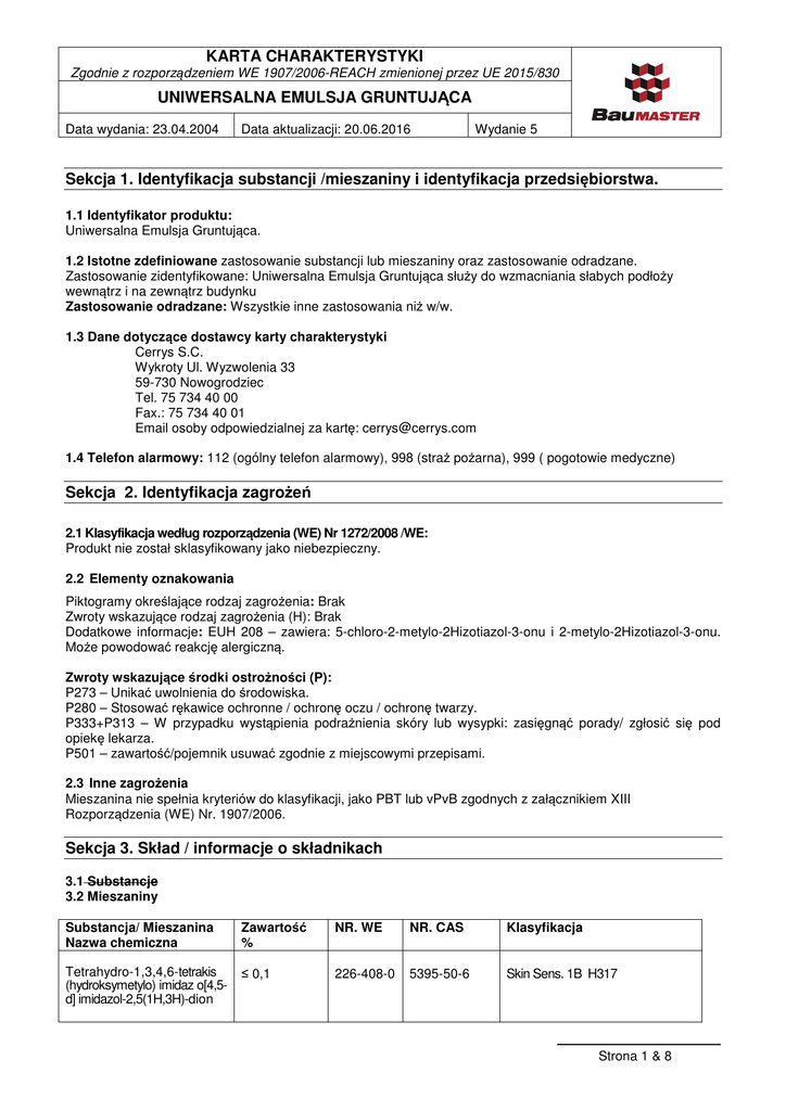 KARTA CHARAKTERYSTYKI Zgodnie z rozporządzeniem WE 1907/2006-REACH zmienionej przez UE 2015/830 UNIWERSALNA EMULSJA GRUNTUJĄCA Data wydania: 23.04.2004 Data aktualizacji: 20.06.2016 Wydanie 5 Sekcja 1. Identyfikacja substancji /mieszaniny i identyfikacja przedsiębiorstwa. 1.1 Identyfikator produktu: Uniwersalna Emulsja Gruntująca. 1.2 Istotne zdefiniowane zastosowanie substancji lub mieszaniny oraz zastosowanie odradzane. Zastosowanie zidentyfikowane: Uniwersalna Emulsja Gruntująca służy do wzmacniania słabych podłoży wewnątrz i na zewnątrz budynku Zastosowanie odradzane: Wszystkie inne zastosowania niż w/w. 1.3 Dane dotyczące dostawcy karty charakterystyki Cerrys S.C. Wykroty Ul. Wyzwolenia 33 59-730 Nowogrodziec Tel. 75 734 40 00 Fax.: 75 734 40 01 Email osoby odpowiedzialnej za kartę: [email protected] 1.4 Telefon alarmowy: 112 (ogólny telefon alarmowy), 998 (straż pożarna), 999 ( pogotowie medyczne) Sekcja 2. Identyfikacja zagrożeń 2.1 Klasyfikacja według rozporządzenia (WE) Nr 1272/2008 /WE: Produkt nie został sklasyfikowany jako niebezpieczny. 2.2 Elementy oznakowania Piktogramy określające rodzaj zagrożenia: Brak Zwroty wskazujące rodzaj zagrożenia (H): Brak Dodatkowe informacje: EUH 208 – zawiera: 5-chloro-2-metylo-2Hizotiazol-3-onu i 2-metylo-2Hizotiazol-3-onu. Może powodować reakcję alergiczną. Zwroty wskazujące środki ostrożności (P): P273 – Unikać uwolnienia do środowiska. P280 – Stosować rękawice ochronne / ochronę oczu / ochronę twarzy. P333+P313 – W przypadku wystąpienia podrażnienia skóry lub wysypki: zasięgnąć porady/ zgłosić się pod opiekę lekarza. P501 – zawartość/pojemnik usuwać zgodnie z miejscowymi przepisami. 2.3 Inne zagrożenia Mieszanina nie spełnia kryteriów do klasyfikacji, jako PBT lub vPvB zgodnych z załącznikiem XIII Rozporządzenia (WE) Nr. 1907/2006. Sekcja 3. Skład / informacje o składnikach 3.1 Substancje 3.2 Mieszaniny Substancja/ Mieszanina Nazwa chemiczna Zawartość % NR. WE NR. CAS Klasyfikacja Tetrahydro-1,3,4,6-tetrakis (hydroksymetylo) imidaz o[4,5d] imidazol-2,5(1H,3H)-dion ≤ 0,1 226-408-0 5395-50-6 Skin Sens. 1B H317 Strona 1 & 8 KARTA CHARAKTERYSTYKI Zgodnie z rozporządzeniem WE 1907/2006-REACH zmienionej przez UE 2015/830 UNIWERSALNA EMULSJA GRUNTUJĄCA Data wydania: 23.04.2004 Mieszanina 5-chloro-2-metylo2H-izotiazol-3-onu [nr WE: 247-500-7] i 2-metylo-2H-izotiazol-3-onu [nr WE 220-239-6] (3:1) Data aktualizacji: 20.06.2016 ≤ 0,0013 220-239-9 55965-84-9 - 50-00-0 Acute Tox. 3, H301 Acute Tox. 3, H311 Acute Tox. 3, H331 SkinCorr. 1B, H314 Aquatic Acute 1,H400 Aquatic Chronic 1,H410 Skin Sens.1A, H317 Acute Tox. 3, H301 Acute Tox. 3, H311 Acute Tox. 3, H331 Muta. 2, H341 Carc.1B, H350 SkinCorr. 1B, H314 Skin Sens.1A, H317 * - substancje posiadające najwyższe dopuszczalne wartości stężenia w środowisku pracy. Znaczenie zwrotów – sekcja 16 Formaldehyd ≤ 0,02 Wydanie 5 Sekcja 4. Środki pierwszej pomocy 4.1 Opis środków pierwszej pomocy W przypadku wdychania Osobę poszkodowaną wyprowadzić/wynieść na świeże powietrze i pozwolić odpocząć w pozycji ułatwiającej oddychanie. W przypadku utrzymywania się dolegliwości zasięgnąć porady lekarza. W przypadku kontaktu ze skórą Zdjąć zabrudzoną odzież oraz obuwie. Zanieczyszczoną skórę umyć dużą ilością wody z mydłem lub innym odpowiednim środkiem myjącym. Zasięgnąć porady lekarza w przypadku utrzymywania się cech podrażnienia skóry. W przypadku kontaktu z oczami Wyjąć soczewki kontaktowe, jeśli są. Otworzyć szeroko powieki i dokładnie płukać oczy dużą ilości czystej wody. Zasięgnąć porady lekarza w przypadku utrzymującego się podrażnienia. W przypadku połknięcia. Wypłukać jamę ustną. Niezwłocznie zasięgnąć porady lekarza i przedstawić opakowanie/etykietę lub kartę charakterystyki preparatu. 4.2 Najważniejsze ostre i opóźnione objawy oraz skutki narażenia. Brak danych 4.3 Wskazania dotyczące wszelkiej natychmiastowej pomocy lekarskiej i szczególnego postępowania z poszkodowanym. Decyzję o sposobie postępowania podejmuje lekarz po ocenie stanu poszkodowanego. Sekcja 5. Postępowanie w przypadku pożaru Preparat nie jest palny. 5.1 Środki gaśnicze: Mgła wodna, piana gaśnicza, gaśnice CO2, gaśnice proszkowe z środkiem gaszącym ABC lub BC oraz inne powszechnie stosowane środki gaśnicze w zależności od otoczenia. Nieodpowiednie środki gaśnicze: Unikać stosowania strumienia wody pod wysokim ciśnieniem. 5.2 Szczególne zagrożenia związane z substancją lub mieszaniną. Nie wdychać dymów i gazów wytwarzanych podczas pożaru. Produkty spalania mogą zawierać tlenki węgla, Strona 2 & 8 KARTA CHARAKTERYSTYKI Zgodnie z rozporządzeniem WE 1907/2006-REACH zmienionej przez UE 2015/830 UNIWERSALNA EMULSJA GRUNTUJĄCA Data wydania: 23.04.2004 Data aktualizacji: 20.06.2016 Wydanie 5 tlenki azotu oraz inne niebezpieczne gazy oraz dymy. 5.3 Informacje dla straży pożarnej: Stosować aparat chroniący drogi oddechowe, odzież ochronną. Nie dopuścić do przedostania się ścieków po gaszeniu pożaru do kanalizacji i wód. Ścieki oraz pozostałości po pożarze usuwać zgodnie z obowiązującymi przepisami. Sekcja 6. Postępowanie w przypadku niezamierzonego uwolnienia do środowiska 6.1 Indywidualne środki ostrożności, wyposażenie ochronne i procedury w sytuacjach awaryjnych. 6.1.1 Dla osób nie należących do personelu udzielającego pomocy. Zawiadomić o awarii odpowiednie służby, usunąć osoby nie biorące udziału w likwidacji awarii. 6.1.2 Dla osób udzielających pomocy. Zadbać o odpowiednią wentylację. Podczas likwidacji korzystać ze środków ochrony indywidualnej. Stosować odzież ochronną, rękawice, nosić maskę gazową. 6.2 Środki ostrożności w zakresie ochrony środowiska Zapobiegać uwolnieniu preparatu do środowiska – wód powierzchniowych, kanalizacji, gleby lub upraw rolnych i leśnych. 6.3 Metody 