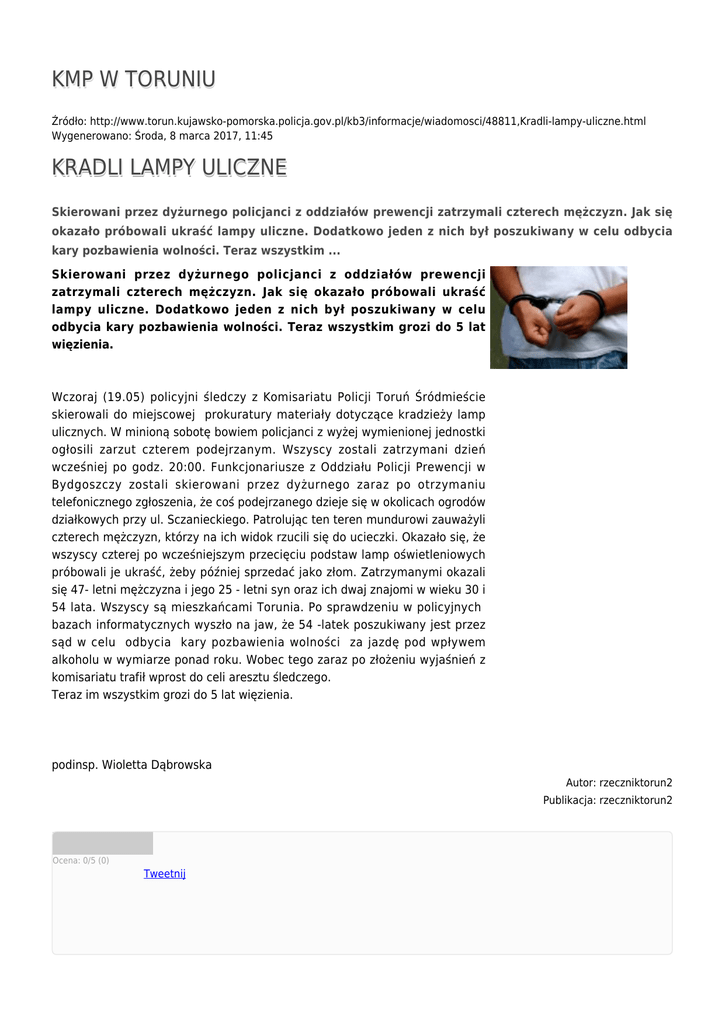 KMP W TORUNIU Źródło: http://www.torun.kujawsko-pomorska.policja.gov.pl/kb3/informacje/wiadomosci/48811,Kradli-lampy-uliczne.html Wygenerowano: Środa, 8 marca 2017, 11:45 KRADLI LAMPY ULICZNE Skierowani przez dyżurnego policjanci z oddziałów prewencji zatrzymali czterech mężczyzn. Jak się okazało próbowali ukraść lampy uliczne. Dodatkowo jeden z nich był poszukiwany w celu odbycia kary pozbawienia wolności. Teraz wszystkim ... Skierowani przez dyżurnego policjanci z oddziałów prewencji zatrzymali czterech mężczyzn. Jak się okazało próbowali ukraść lampy uliczne. Dodatkowo jeden z nich był poszukiwany w celu odbycia kary pozbawienia wolności. Teraz wszystkim grozi do 5 lat więzienia. Wczoraj (19.05) policyjni śledczy z Komisariatu Policji Toruń Śródmieście skierowali do miejscowej prokuratury materiały dotyczące kradzieży lamp ulicznych. W minioną sobotę bowiem policjanci z wyżej wymienionej jednostki ogłosili zarzut czterem podejrzanym. Wszyscy zostali zatrzymani dzień wcześniej po godz. 20:00. Funkcjonariusze z Oddziału Policji Prewencji w Bydgoszczy zostali skierowani przez dyżurnego zaraz po otrzymaniu telefonicznego zgłoszenia, że coś podejrzanego dzieje się w okolicach ogrodów działkowych przy ul. Sczanieckiego. Patrolując ten teren mundurowi zauważyli czterech mężczyzn, którzy na ich widok rzucili się do ucieczki. Okazało się, że wszyscy czterej po wcześniejszym przecięciu podstaw lamp oświetleniowych próbowali je ukraść, żeby później sprzedać jako złom. Zatrzymanymi okazali się 47- letni mężczyzna i jego 25 - letni syn oraz ich dwaj znajomi w wieku 30 i 54 lata. Wszyscy są mieszkańcami Torunia. Po sprawdzeniu w policyjnych bazach informatycznych wyszło na jaw, że 54 -latek poszukiwany jest przez sąd w celu odbycia kary pozbawienia wolności za jazdę pod wpływem alkoholu w wymiarze ponad roku. Wobec tego zaraz po złożeniu wyjaśnień z komisariatu trafił wprost do celi aresztu śledczego. Teraz im wszystkim grozi do 5 lat więzienia. podinsp. Wioletta Dąbrowska Autor: rzeczniktorun2 Publikacja: rzeczniktorun2 Ocena: 0/5 (0) Tweetnij