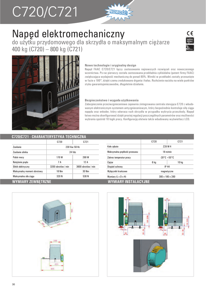 C720/C721 NOWOąÙ! Napãd elektromechaniczny do uĚytku przydomowego dla skrzydwa o maksymalnym ciãĚarze 400 kg (C720) – 800 kg (C721) Nowe technologie i oryginalny design Napúd FAAC C720/C721 đæczy zastosowanie najnowszych rozwiæzaē oraz nowoczesnego wzornictwa. Po raz pierwszy zostađa zastosowana przekđadnia cykloidalna (patent Þrmy FAAC) zwiúkszajæca wydajnoħè mechanicznæ do ponad 80%. Wirniki w przekđadni zostađy przesuniúte w fazie o 180°, dziúki czemu zredukowano drgania i hađas. Rozđoľenie nacisku na wiele punktów styku gwarantujeniezawodne, dđugoletnie dziađanie. Bezpieczeöstwo i wygoda uĚytkowania Zabezpieczenie przeciwzgnieceniowe zapewnia zintegrowana centrala sterujæca E720 z wbudowanym elektronicznym systemem antyzgnieceniowym, który bezpoħrednio kontroluje siđú ciægu napúdu oraz enkoder, który odwraca ruch skrzydđa w przypadku wykrycia przeszkody. Napúd đatwo moľna skonÞgurowaè dziúki prostej regulacji poszczególnych parametrów oraz moľliwoħci wybrania spoħród 10 logik pracy. KonÞguracjú uđatwia takľe wbudowany wyħwietlacz LCD. C720/C721 - CHARAKTERYSTYKA TECHNICZNA C720 Zasilanie 230 Vac 50 Hz Zasilanie silnika 24 Vdc Pobór mocy C720 C721 C721 Kođo zúbate Z28 M 4 Maksymalna prúdkoħè przesuwu 18 m/min 170 W 290 W Natúľenie prædu 7A 12 A Silnik elektryczny 3200 obrotów / min 3600 obrotów / min Maksymalny moment obrotowy 18 Nm 30 Nm Wyđæczniki kraēcowe magnetyczne Maksymalna siđa ciægu 320 N 530 N Wymiary (L x D x H) 300 x 180 x 280 WYMIARY ZEWNùTRZNE 30 Zakres temperatur pracy Ciúľar Stopieē ochrony WYMIARY INSTALACYJNE -20°C +55°C 6 kg 10 kg IP 44