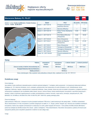 Słoneczne Baleary PL PILOT Statek / Linia: Costa neoRiviera / Costa Cruises Termin: 16.09 - 25.09.2017 Do portu W morze Dzień 1 - 2017-09-16 Dzień Przejazd autokarem Katowice-Savona Port --- --- Dzień 2 - 2017-09-17 Savona (Włochy) --- 17:00 Dzień 3 - 2017-09-18 Porto Torres (Sardynia) Włochy 9:00 18:00 Dzień 4 - 2017-09-19 Port Mahon/Minorka (Hiszpania) 9:00 18:00 Dzień 5 - 2017-09-20 Ibiza (Hiszpania) 9:00 --- Dzień 6 - 2017-09-21 Palma de Majorka (Hiszpania) 10:00 21:00 Dzień 6 - 2017-09-21 Ibiza (Hiszpania) Dzień 7 - 2017-09-22 Tarragona (Hiszpania) Dzień 8 - 2017-09-23 Tarragona (Hiszpania) Dzień 9 - 2017-09-24 Savona (Włochy) Dzień 10 - 2017-09-25 Powrót autokarem do kraju --- 4:00 9:00 --- --- 2:00 9:00 --- --- --- Ceny Kabina: Cena za osobę w kabinie dwuosobowej od: wewnętrzna classic wewnętrzna premium z oknem classic z oknem premium 813 Euro 893 Euro 983 Euro 1063 Euro Przejazd Katowice-Savona-Katowice: 70 Euro Opłaty portowe: 140 Euro Ceny orientacyjne. Aby uzyskać cenę aktualną w danym dniu, zadzwoń na nr tel. 511 757 511 Dodatkowe uwagi Cena obejmuje rejs statkiem Costa neoRiviera (zakwaterowanie w kabinie wybranej kategorii), 7 noclegów; pełne wyżywienie - do dyspozycji restauracja bufetowa działająca ok. 10 h dziennie (śniadanie, lunch, przekąski, podwieczorek) oraz restauracja a la carte (śniadanie, lunch, obiadokolacja); serwis bagażowy i kabinowy; napoje z dystrybutorów w restauracji bufetowej - kawa, herbata, woda oraz soki do śniadań; korzystanie z urządzeń sportowo rekreacyjnych znajdujących się na pokładzie statku (basen, jacuzzi, centrum fitness, boiska wielofunkcyjne); korzystanie z ręczników basenowych i leżaków; udział w imprezach organizowanych na statku (przedstawienia w teatrze, koncerty, nauka tańca, animacje); ubezpieczenie KL, NW, BAGAŻU; KL 30 000Euro, KR 6000 PLN, NWI 16 000 PLN, BP 1 800 PLN; opiekę polskiego pilota. Cena nie obejmuje opłat portowych 140Euro/os.; transportu do portu (przejazd autokarem 70Euro/os.); opłat serwisowych dla załogi statku - 10,00Euro osoba/dzień, 5Euro dziecko/dzień (3-14 lat); korzystania z punktów usługowych na statku m. in.: (fryzjer, pralnia, fotograf, spa, internet) oraz wydatków osobistych; korzystania z barów oraz napojów zamawianych w restauracji a la carte; pakiet napojów All Inclusive - Cena pakietu 26,50Euro/dzień (Brindiamo pakiet bez koktajli) lub 28,50Euro/dzień (Piu Giusto - pakiet z koktajlami), 17Euro/dzień/dziecko. Warunkiem skorzystania z pakietu all inclusive jest wykupienie pakietu przez wszystkich pasażerów w kabinie na czas całego rejsu. Uwagi Kabiny 3/4 osobowe nie są dostępne we wszystkich kategoriach, a ich liczba jest ograniczona - sprzedaż tylko po potwierdzeniu. Grupa realizowana przy min. 20 osobach. Przejazd autokarem: W przypadku oferty przejazdu autokarem wyjazd następuje z Katowic dzień wcześniej, natomiast przyjazd do Katowic dzień później. Dla chętnych możliwość skorzystania z antenek do miejsca wyjazdu autokaru: z Krakowa 25Euro/osoba/dwie strony z Wrocławia 30Euro/osoba/dwie strony