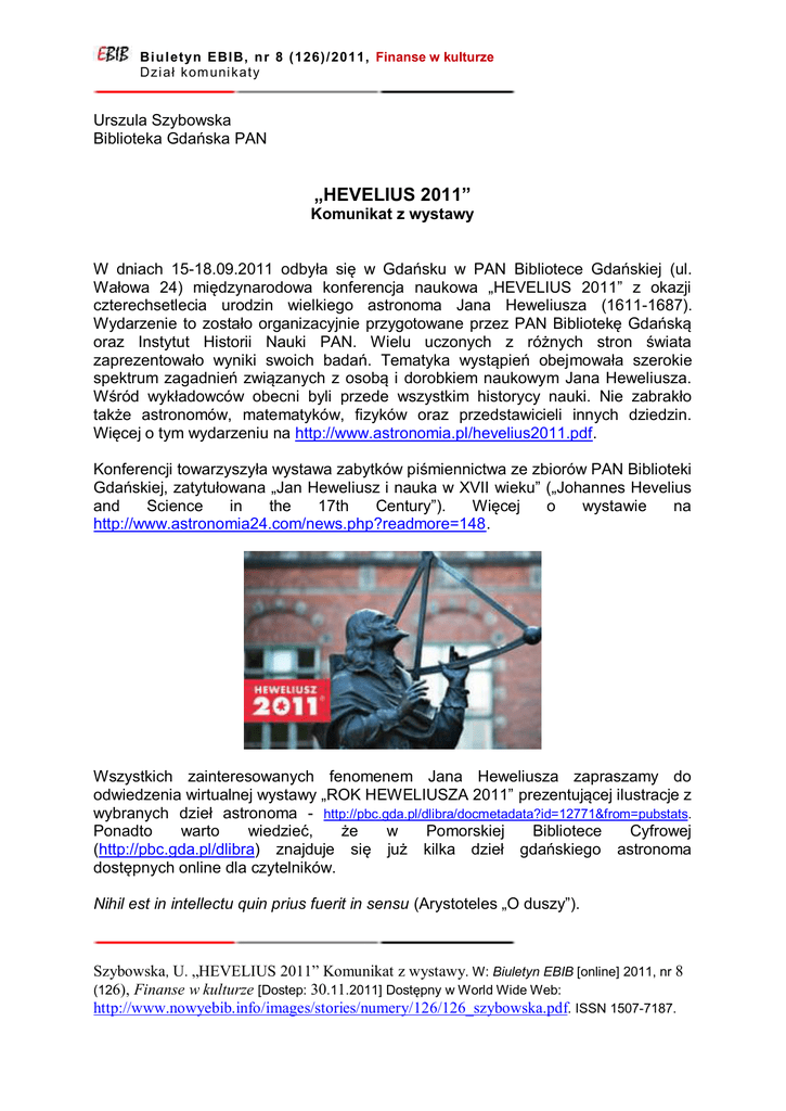 Bi u l etyn EBI B, n r 8 (126)/ 2011, Finanse w kulturze Dzi ał kom uni kat y Urszula Szybowska Biblioteka Gdańska PAN „HEVELIUS 2011” Komunikat z wystawy W dniach 15-18.09.2011 odbyła się w Gdańsku w PAN Bibliotece Gdańskiej (ul. Wałowa 24) międzynarodowa konferencja naukowa „HEVELIUS 2011” z okazji czterechsetlecia urodzin wielkiego astronoma Jana Heweliusza (1611-1687). Wydarzenie to zostało organizacyjnie przygotowane przez PAN Bibliotekę Gdańską oraz Instytut Historii Nauki PAN. Wielu uczonych z różnych stron świata zaprezentowało wyniki swoich badań. Tematyka wystąpień obejmowała szerokie spektrum zagadnień związanych z osobą i dorobkiem naukowym Jana Heweliusza. Wśród wykładowców obecni byli przede wszystkim historycy nauki. Nie zabrakło także astronomów, matematyków, fizyków oraz przedstawicieli innych dziedzin. Więcej o tym wydarzeniu na http://www.astronomia.pl/hevelius2011.pdf. Konferencji towarzyszyła wystawa zabytków piśmiennictwa ze zbiorów PAN Biblioteki Gdańskiej, zatytułowana „Jan Heweliusz i nauka w XVII wieku” („Johannes Hevelius and Science in the 17th Century”). Więcej o wystawie na http://www.astronomia24.com/news.php?readmore=148. Wszystkich zainteresowanych fenomenem Jana Heweliusza zapraszamy do odwiedzenia wirtualnej wystawy „ROK HEWELIUSZA 2011” prezentującej ilustracje z wybranych dzieł astronoma - http://pbc.gda.pl/dlibra/docmetadata?id=12771&from=pubstats. Ponadto warto wiedzieć, że w Pomorskiej Bibliotece Cyfrowej (http://pbc.gda.pl/dlibra) znajduje się już kilka dzieł gdańskiego astronoma dostępnych online dla czytelników. Nihil est in intellectu quin prius fuerit in sensu (Arystoteles „O duszy”). Szybowska, U. „HEVELIUS 2011” Komunikat z wystawy. W: Biuletyn EBIB [online] 2011, nr 8 (126), Finanse w kulturze [Dostep: 30.11.2011] Dostępny w World Wide Web: http://www.nowyebib.info/images/stories/numery/126/126_szybowska.pdf. ISSN 1507-7187.