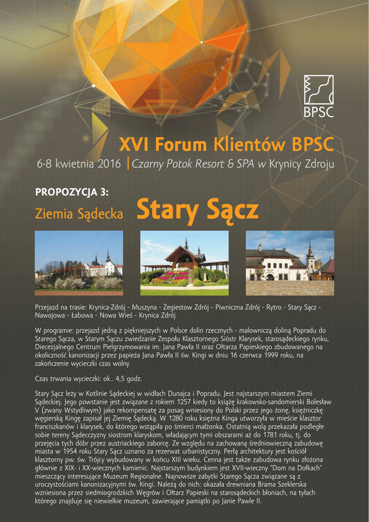 XVI Forum Klientów BPSC 6-8 kwietnia 2016 Czarny Potok Resort & SPA w Krynicy Zdroju PROPOZYCJA 3: Ziemia S¹decka Stary S¹cz Przejazd na trasie: Krynica-Zdrój - Muszyna - ¯egiestow Zdrój - Piwniczna Zdrój - Rytro - Stary S¹cz Nawojowa - £abowa - Nowa Wieœ - Krynica Zdrój W programie: przejazd jedn¹ z piêkniejszych w Polsce dolin rzecznych - malownicz¹ dolin¹ Popradu do Starego S¹cza, w Starym S¹czu zwiedzanie Zespo³u Klasztornego Sióstr Klarysek, staros¹deckiego rynku, Diecezjalnego Centrum Pielgrzymowania im. Jana Paw³a II oraz O³tarza Papieskiego zbudowanego na okolicznoœæ kanonizacji przez papie¿a Jana Paw³a II œw. Kingi w dniu 16 czerwca 1999 roku, na zakoñczenie wycieczki czas wolny Czas trwania wycieczki: ok.. 4,5 godz. Stary S¹cz le¿y w Kotlinie S¹deckiej w wid³ach Dunajca i Popradu. Jest najstarszym miastem Ziemi S¹deckiej. Jego powstanie jest zwi¹zane z rokiem 1257 kiedy to ksi¹¿ê krakowsko-sandomierski Boles³aw V (zwany Wstydliwym) jako rekompensatê za posag wniesiony do Polski przez jego ¿onê, ksiê¿niczkê wêgiersk¹ Kingê zapisa³ jej Ziemiê S¹deck¹. W 1280 roku ksiê¿na Kinga utworzy³a w mieœcie klasztor franciszkanów i klarysek, do którego wst¹pi³a po œmierci ma³¿onka. Ostatni¹ wol¹ przekaza³a podleg³e sobie tereny S¹decczyzny siostrom klaryskom, w³adaj¹cym tymi obszarami a¿ do 1781 roku, tj. do przejêcia tych dóbr przez austriackiego zaborcê. Ze wzglêdu na zachowan¹ œredniowieczn¹ zabudowê miasta w 1954 roku Stary S¹cz uznano za rezerwat urbanistyczny. Per³¹ architektury jest koœció³ klasztorny pw. œw. Trójcy wybudowany w koñcu XIII wieku. Cenna jest tak¿e zabudowa rynku z³o¿ona g³ównie z XIX- i XX-wiecznych kamienic. Najstarszym budynkiem jest XVII-wieczny "Dom na Do³kach" mieszcz¹cy interesuj¹ce Muzeum Regionalne. Najnowsze zabytki Starego S¹cza zwi¹zane s¹ z uroczystoœciami kanonizacyjnymi œw. Kingi. Nale¿¹ do nich: okaza³a drewniana Brama Szeklerska wzniesiona przez siedmiogrodzkich Wêgrów i O³tarz Papieski na staros¹deckich b³oniach, na ty³ach którego znajduje siê niewielkie muzeum, zawieraj¹ce pami¹tki po Janie Pawle II.