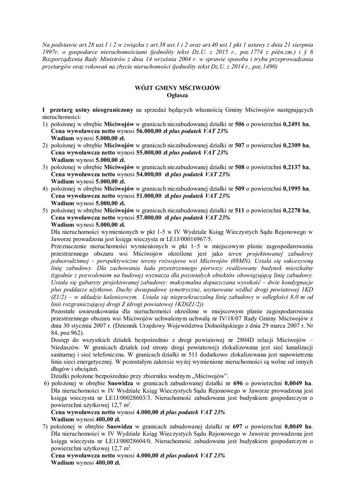 Na podstawie art.28 ust.1 i 2 w związku z art.38 ust.1 i 2 oraz art.40 ust.1 pkt 1 ustawy z dnia 21 sierpnia 1997r. o gospodarce nieruchomościami (jednolity tekst Dz.U. z 2015 r., poz.1774 z późn.zm.) i § 6 Rozporządzenia Rady Ministrów z dnia 14 września 2004 r. w sprawie sposobu i trybu przeprowadzania przetargów oraz rokowań na zbycie nieruchomości (jednolity tekst Dz.U. z 2014 r., poz.1490) WÓJT GMINY MŚCIWOJÓW Ogłasza I przetarg ustny nieograniczony na sprzedaż będących własnością Gminy Mściwojów następujących nieruchomości: 1) położonej w obrębie Mściwojów w granicach niezabudowanej działki nr 506 o powierzchni 0,2491 ha, Cena wywoławcza netto wynosi 56.000,00 zł plus podatek VAT 23% Wadium wynosi 5.000,00 zł. 2) położonej w obrębie Mściwojów w granicach niezabudowanej działki nr 507 o powierzchni 0,2309 ha, Cena wywoławcza netto wynosi 55.000,00 zł plus podatek VAT 23% Wadium wynosi 5.000,00 zł. 3) położonej w obrębie Mściwojów w granicach niezabudowanej działki nr 508 o powierzchni 0,2137 ha, Cena wywoławcza netto wynosi 54.000,00 zł plus podatek VAT 23% Wadium wynosi 5.000,00 zł. 4) położonej w obrębie Mściwojów w granicach niezabudowanej działki nr 509 o powierzchni 0,1995 ha, Cena wywoławcza netto wynosi 51.000,00 zł plus podatek VAT 23% Wadium wynosi 5.000,00 zł. 5) położonej w obrębie Mściwojów w granicach niezabudowanej działki nr 511 o powierzchni 0,2278 ha, Cena wywoławcza netto wynosi 57.000,00 zł plus podatek VAT 23% Wadium wynosi 5.000,00 zł. Dla nieruchomości wymienionych w pkt 1-5 w IV Wydziale Ksiąg Wieczystych Sądu Rejonowego w Jaworze prowadzona jest księga wieczysta nr LE1J/00016967/5. Przeznaczenie nieruchomości wymienionych w pkt 1–5 w miejscowym planie zagospodarowania przestrzennego obszaru wsi Mściwojów określone jest jako teren projektowanej zabudowy jednorodzinnej – perspektywiczne tereny rozwojowe wsi Mściwojów (88MN). Ustala się sukcesywną linię zabudowy. Dla zachowania ładu przestrzennego pierwszy realizowany budynek mieszkalny (zgodnie z pozwoleniem na budowę) wyznacza dla pozostałych obiektów obowiązującą linię zabudowy. Ustala się gabaryty projektowanej zabudowy: maksymalna dopuszczana wysokość – dwie kondygnacje plus poddasze użytkowe. Dachy dwuspadowe symetryczne, usytuowane wzdłuż drogi powiatowej 1KD (Z1/2) – w układzie kalenicowym. Ustala się nieprzekraczalną linię zabudowy w odległości 8,0 m od linii rozgraniczającej drogi Z (drogi powiatowej 1KD(Z1/2)) Pozostałe uwarunkowania dla nieruchomości określone w miejscowym planie zagospodarowania przestrzennego obszaru wsi Mściwojów uchwalonym uchwałą nr IV/18/07 Rady Gminy Mściwojów z dnia 30 stycznia 2007 r. (Dziennik Urzędowy Województwa Dolnośląskiego z dnia 29 marca 2007 r. Nr 84, poz.962). Dostęp do wszystkich działek bezpośrednio z drogi powiatowej nr 2804D relacji Mściwojów – Niedaszów. W granicach działek (od strony drogi powiatowej) zlokalizowana jest sieć kanalizacji sanitarnej i sieć telefoniczna. W granicach działki nr 511 dodatkowo zlokalizowana jest napowietrzna linia sieci energetycznej. W pozostałym zakresie wyżej wymienione nieruchomości są wolne od innych długów i obciążeń. Działki położone bezpośrednio przy zbiorniku wodnym „Mściwojów”. 6) położonej w obrębie Snowidza w granicach zabudowanej działki nr 696 o powierzchni 0,0049 ha. Dla nieruchomości w IV Wydziale Ksiąg Wieczystych Sądu Rejonowego w Jaworze prowadzona jest księga wieczysta nr LE1J/00028603/3. Nieruchomość zabudowana jest budynkiem gospodarczym o powierzchni użytkowej 12,7 m2. Cena wywoławcza netto wynosi 4.000,00 zł plus podatek VAT 23% Wadium wynosi 400,00 zł. 7) położonej w obrębie Snowidza w granicach zabudowanej działki nr 697 o powierzchni 0,0049 ha. Dla nieruchomości w IV Wydziale Ksiąg Wieczystych Sądu Rejonowego w Jaworze prowadzona jest księga wieczysta nr LE1J/00028604/0. Nieruchomość zabudowana jest budynkiem gospodarczym o powierzchni użytkowej 12,7 m2. Cena wywoławcza netto wynosi 4.000,00 zł plus podatek VAT 23% Wadium wynosi 400,00 zł. Przeznaczenie nieruchomości wymienionych w pkt 6 – 7 w miejscowym planie zagospodarowania przestrzennego obszaru wsi Snowidza określone jest jako teren zabudowy mieszkaniowej wielorodzinnej. Istniejąca zabudowa do zachowania – 3MW. Pozostałe uwarunkowania dla nieruchomości określone w miejscowym planie zagospodarowania przestrzennego obszaru wsi Snowidza uchwalonym uchwałą nr IV/1607 Rady Gminy Mściwojów z dnia 30 stycznia 2007 r. (Dziennik Urzędowy Województwa Dolnośląskiego z dnia 29 marca 2007 r. Nr 84, poz.960). Dostęp do działek z wewnętrznej gruntowej drogi gminnej. Budynki gospodarcze na działkach nr 696 i 697 obręb Snowidza do chwili sprzedaży działek objęte umowami najmu. W pozostałym zakresie wyżej wymienione nieruchomości są wolne od innych długów i obciążeń. Postąpienie wynosi nie mniej niż 1% ceny wywoławczej dla poszczególnych działek, z zaokrągleniem w górę do pełnych dziesiątek złotych. Przetarg przeprowadza się na każdą działkę oddzielnie. W przetargu mogą uczestniczyć osoby fizyczne i prawne, jeżeli wniosą wadium, na każdą działkę oddzielnie, w pieniądzu na konto Gminy Mściwojów - BS Jawor O/Mściwojów 74 8647 1020 0210 0003 2002 0001 w terminie najpóźniej do dnia 16 maja 2016 r. Za datę wniesienia wadium uważa się datę wpływu środków pieniężnych na w/w konto. Na dowodzie wpłaty wadium należy wpisać nazwę obrębu i numer działki będącej przedmiotem przetargu. Uczestnicy przystępujący do przetargu zobowiązani są do przedłożenia komisji przetargowej przed otwarciem przetargu dokumenty stwierdzające tożsamość a także do okazania dowodu wpłaty wadium, a w przypadku występowania w imieniu osoby fizycznej lub prawnej również dokumentu w formie aktu notarialnego upoważniającego do 