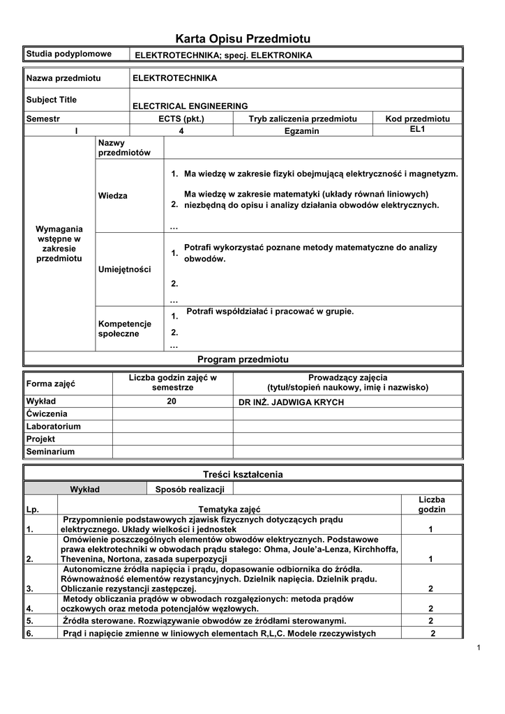 Karta Opisu Przedmiotu Studia podyplomowe ELEKTROTECHNIKA; specj. ELEKTRONIKA Nazwa przedmiotu ELEKTROTECHNIKA Subject Title ELECTRICAL ENGINEERING ECTS (pkt.) Tryb zaliczenia przedmiotu 4 Egzamin Semestr I Kod przedmiotu EL1 Nazwy przedmiotów 1. Ma wiedzę w zakresie fizyki obejmującą elektryczność i magnetyzm. Ma wiedzę w zakresie matematyki (układy równań liniowych) 2. niezbędną do opisu i analizy działania obwodów elektrycznych. Wiedza … Wymagania wstępne w zakresie przedmiotu 1. Potrafi wykorzystać poznane metody matematyczne do analizy obwodów. Umiejętności 2. … Kompetencje społeczne 1. Potrafi współdziałać i pracować w grupie. 2. … Program przedmiotu Forma zajęć Wykład Ćwiczenia Laboratorium Projekt Liczba godzin zajęć w semestrze 20 Prowadzący zajęcia (tytuł/stopień naukowy, imię i nazwisko) DR INŻ. JADWIGA KRYCH Seminarium Treści kształcenia Wykład Lp. 1. 2. 3. 4. 5. 6. Sposób realizacji Tematyka zajęć Przypomnienie podstawowych zjawisk fizycznych dotyczących prądu elektrycznego. Układy wielkości i jednostek Omówienie poszczególnych elementów obwodów elektrycznych. Podstawowe prawa elektrotechniki w obwodach prądu stałego: Ohma, Joule’a-Lenza, Kirchhoffa, Thevenina, Nortona, zasada superpozycji Autonomiczne źródła napięcia i prądu, dopasowanie odbiornika do źródła. Równoważność elementów rezystancyjnych. Dzielnik napięcia. Dzielnik prądu. Obliczanie rezystancji zastępczej. Metody obliczania prądów w obwodach rozgałęzionych: metoda prądów oczkowych oraz metoda potencjałów węzłowych. Źródła sterowane. Rozwiązywanie obwodów ze źródłami sterowanymi. Prąd i napięcie zmienne w liniowych elementach R,L,C. Modele rzeczywistych Liczba godzin 1 1 2 2 2 2 1 7. 8. 9. 10. 11. cewek i kondensatorów. Zależności energetyczne w elementarnych obwodach liniowych przy wymuszeniu sinusoidalnym. Analiza obwodów ze źródłami sinusoidalnymi. Zjawiska rezonansowe w obwodach elektrycznych. Obwody magnetycznie sprzężone. Transformator - budowa, zasada działania. Model transformatora powietrznego. Układy trójfazowe, pojęcia podstawowe. Pomiar mocy w układach trójfazowych. Zasady działania i podstawowe charakterystyki filtrów pasywnych reaktancyjnych. Bezpieczeństwo w użytkowaniu urządzeń elektrycznych. Podstawowe zagrożenia związane z prądem elektrycznym. Ochrona przeciwporażeniowa. Wpływ pola elektromagnetycznego na organizmy żywe. 12. Omówienie formy i zakresu egzaminu. Liczba godzin zajęć w semestrze Sposoby sprawdzenia zamierzonych efektów kształcenia 2 2 2 2 1 1 20 Prace domowe, kolokwia, egzamin pisemny Ma podstawową, uporządkowaną wiedzę w zakresie zjawisk 1. występujących w obwodach elektrycznych prądu stałego i zmiennego (W). Wiedza Ma uporządkowaną wiedzę w zakresie metodologii rozwiązywania obwodów elektrycznych w stanach 2. ustalonych - metoda prądów oczkowych i metoda potencjałów węzłowych (W). Ma podstawową wiedzę w zakresie zjawisk rezonansowych 3. (W). Ma wiedzę w zakresie filtrów reaktancyjnych (W). … Efekty kształcenia dla przedmiotu - po zakończonym cyklu kształcenia 1. Umiejętności Potrafi rozwiązać prosty obwód elektryczny prądu stałego i prądu sinusoidalnie zmiennego (W). Potrafi powiązać podstawowe prawa elektrotechniki z z ich 2. zastosowaniem w praktyce (W). 3. … 1. Kompetencje społeczne Rozumie potrzebę i zna możliwości ciągłego dokształcania się (W). Ma świadomość odpowiedzialności za pracę własną oraz gotowość podporządkowania się zasadom pracy w zespole i 2. ponoszenia odpowiedzialności za wspólnie realizowane zadania (W). 3. … Metody dydaktyczne: Wykłady wspomagane prezentacjami wyników symulacji obwodów w programie PSpice. Rozwiązywanie zadań na ćwiczeniach tablicowych, dyskusja nad sposobami rozwiązania, prace domowe. Konsultacje. 2 Forma i warunki zaliczenia przedmiotu: Pozytywne oceny za prace domowe oraz zaliczenie kolokwiów z poszczególnych działów; egzamin pisemny. Literatura podstawowa: CICHOWSKA Z.: Wykłady z elektrotechniki teoretycznej, cz. I. Wyd. Politechniki Śląskiej, Gliwice, 2000 [1] CICHOWSKA Z., PASKO M.: Wykłady z elektrotechniki teoretycznej, cz. II. Wyd. Politechniki Śląskiej, Gliwice, 2000 [2] BOLKOWSKI S., BROCIEK W., RAWA H.: Teoria obwodów elektrycznych. Zadania. WNT, W-wa 1995 [3] OSIOWSKI J., SZABATIN J.: Podstawy teorii obwodów. Tom I i II. WNT, Warszawa, 1995 [4] FILIPOWICZ Z.: Zadania z teorii obwodów. Oficyna Wydawnicza Politechniki Warszawskiej, Warszawa, 2009 [5] OSOWSKI S., SIWEK K., ŚMIAŁEK M.: Teoria obwodów. Oficyna Wydawnicza Politechniki Warszawskiej, Warszawa, 2006 [6] [7] [8] Literatura uzupełniająca: MIKOŁAJUK K.: Podstawy analizy obwodów energoelektronicznych, PWN, W-wa 1998 [1] KURDZIEL R.: Podstawy elektrotechniki. WNT, W-wa 1972 [2] PRZYTULSKI A.: Zbiór zadań z podstaw elektrotechniki dla studentów studiów zaocznych, cz. I i II, skrypt Politechniki Opolskiej, Opole 1999 [3] KRYCH J., KOLAŃSKA J.: Zadania z teorii obwodów dla studiujących zaocznie na kierunku Informatyka, skrypt Politechniki Opolskiej nr 213 (lub 200 z 1997 r.), Opole 1999 [4] JONSON D.E., JONSON J.R., SCOTT P.D.: Electric Circuit Analysis. John Wiley & Sons, Inc., 1999 [5] GROCHOWICZ B., JAGIEŁA M., KOLAŃSKA – PŁUSKA J., KRYCH J. Pod red. KRYCH J.: Laboratorium komputerowe z teorii obwodów. Skrypt Politechniki Opolskiej nr 238. Opole 2001 [6] [7] ______________ * niewłaściwe przekreślić ………………………………………………….. ………………………………………………………. (kierownik jednostki organizacyjnej/bezpośredni przełożony: (Dziekan Wydziału pieczęć/podpis pieczęć/podpis) 3