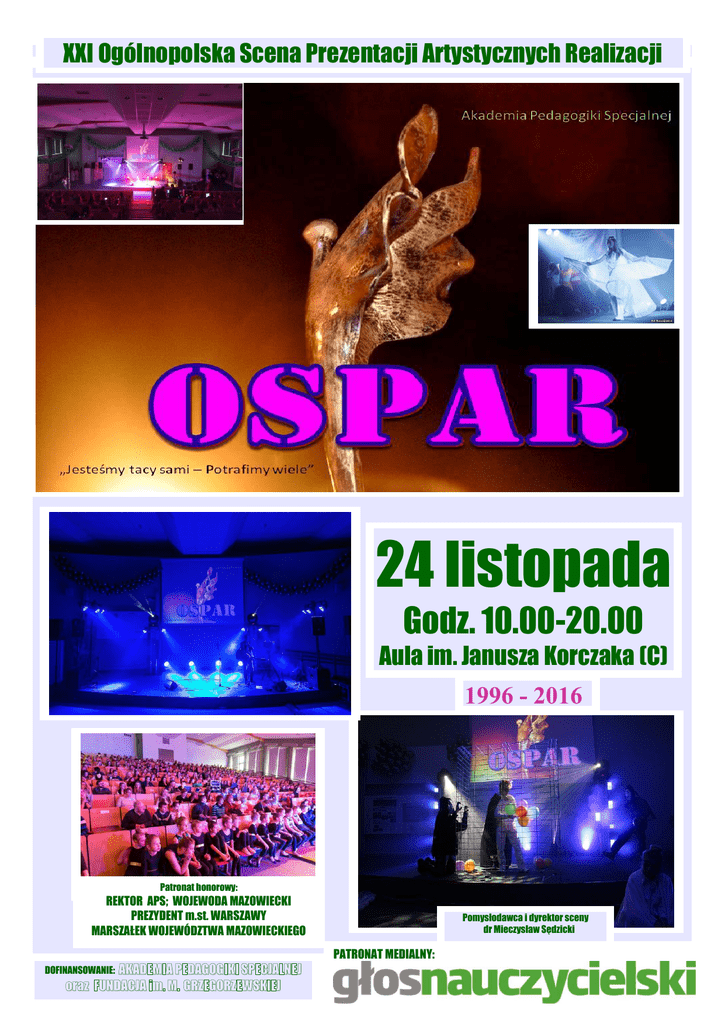 XXI Ogólnopolska Scena Prezentacji Artystycznych Realizacji 24 listopada Godz. 10.00-20.00 Aula im. Janusza Korczaka (C) 1996 - 2016 Patronat honorowy: REKTOR APS; WOJEWODA MAZOWIECKI PREZYDENT m.st. WARSZAWY MARSZAŁEK WOJEWÓDZTWA MAZOWIECKIEGO Pomysłodawca i dyrektor sceny dr Mieczysław Sędzicki PATRONAT MEDIALNY: AKADEMIA PEDAGOGIKI SPECJALNEJ oraz FUNDACJA im. M. GRZEGORZEWSKIEJ DOFINANSOWANIE: