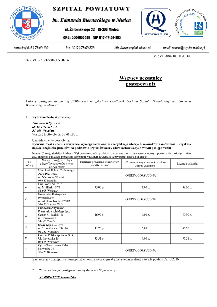 SZPITAL POWIATOWY im. Edmunda Biernackiego w Mielcu ul. Żeromskiego 22 39-300 Mielec KRS: 0000002538 NIP 817-17-50-893 centrala ( 017 ) 78 00 100 fax. ( 017 ) 78 00 273 http://www.szpital.mielec.pl email: [email protected] Mielec, dnia 18.10.2016r. SzP VIII-2233-73P-XXIII/16 Wszyscy uczestnicy postępowania Dotyczy: postępowanie poniżej 30 000 euro na „dostawę świetlówek LED do Szpitala Powiatowego im. Edmunda Biernackiego w Mielcu”. 1. wybrano ofertę Wykonawcy: Fair Inwest Sp. z o.o. ul. M. Hłaski 67/3 54-608 Wrocław Wartość brutto oferty: 37.465,80 zł Uzasadnienie wyboru oferty: wybrana oferta spełnia wszystkie wymogi określone w specyfikacji istotnych warunków zamówienia i uzyskała największą liczbę punktów na podstawie kryteriów oceny ofert zastosowanych w tym postępowaniu Nazwy (firmy), siedziby i adresy Wykonawców, którzy złożyli oferty wraz ze streszczeniem oceny i porównania złożonych ofert zawierającym punktację przyznaną oferentom w każdym kryterium oceny ofert i łączną punktację: Nazwy (firmy), siedziby i Nr Punktacja przyznana w kryterium Punktacja przyznana w kryterium adresy Wykonawców którzy Łączna punktacja oferty „najniższa cena” „okres gwarancji” złożyli oferty MatroLed Poland Technology Anna Ponichtera ul. Wieczorka 9,Laski 05-080 Izabelin Fair Inwest Sp. zo. o. ul. M. Hłaski 67/3 54-608 Wrocław Hurtownia Elektryczna Ryszard Łach ul. Al. .Jana Pawła II 7/102 37-450 Stalowa Wola Hurtownia Artykułów Przemysłowych Mega Sp. J. Centar K. Budzik B. ul. Towarowa 11 33-100 Tarnów Shake Kajus W. Pyrz ul. Szczęśliwicka 19m.86 02-352 Warszawa Greenie Polska Sp. zo. o. Sp.k. Ul. Wołowska 16 02-675 Warszawa Cybor-Tech Iwona Halat Karwiniec 78 56-420 Bierutów 1 2 3 4 5 6 7 OFERTA ODRZUCONA 95,00 p. 3,00 p. OFERTA ODRZUCONA 46,99 p. 4,00 p. 50,99 p. 41,70 p. 5,00 p. 46,70 p. 53,51 p. 4,00 p. 57,51 p. OFERTA ODRZUCONA Zamawiający uprzejmie informuje, że umowa z wybranym Wykonawcom zostanie zawarta po dniu 28.10.2016 r. 2. W prowadzonym postępowaniu wykluczono Wykonawcę: „CYBOR-TECH” Iwona Halat 98,00 p. Karwiniec 78 56-420 Bierutów Uzasadnienie: Z postępowania o udzielenie zamówienia wyklucza się Wykonawców, którzy nie wykazali spełnienia warunków udziału w postępowaniu . Uzasadnienie faktyczne: Wykonawca na wezwanie Zamawiającego z dnia 29.09.2016r. znak SzP VIII-2233-73P-XIV/16 uzupełnił wydruk z centralnej ewidencji i informacji o działalności gospodarczej z datą 29.09.2016 r. co oznacza że nie jest on ważny na dzień składania ofert tj. 28.09.2016 r. Hurtownia Elektryczna Ryszard Łach Al. Jana Pawła II 7/102 37-450 Stalowa Wola Uzasadnienie: Z postępowania o udzielenie zamówienia wyklucza się Wykonawców, którzy nie wykazali spełnienia warunków udziału w postępowaniu . Uzasadnienie faktyczne: Wykonawca na wezwanie Zamawiającego z dnia 29.09.2016r. znak SzP VIII-2233-73P-IX/16 uzupełnił wydruk z centralnej ewidencji i informacji o działalności gospodarczej z datą 12.07.2014 r. co oznacza że na dzień składania ofert tj. 28.09.2016 r. utracił on ważność. 3. W prowadzonym postępowaniu nie odrzucono Wykonawcę: „CYBOR-TECH” Iwona Halat Karwiniec 78 56-420 Bierutów Ofertę Wykonawcy wykluczonego uznaje się za odrzuconą. Hurtownia Elektryczna Ryszard Łach Al. Jana Pawła II 7/102 37-450 Stalowa Wola Ofertę Wykonawcy wykluczonego uznaje się za odrzuconą. MatroLED Poland Technology Anna Ponichtera ul. Wieczorka 9, Laski 05-080 Izabelin Uzasadnienie: Zamawiający odrzuca ofertę jeżeli jej treść nie odpowiada treści specyfikacji istotnych warunków zamówienia. Uzasadnienie faktyczne: Zgodnie z dyspozycją Zaproszenia Zamawiający wymagał żywotność świetlówek min. 70.000 godzin, natomiast z załączonych przez Wykonawcę dokumentów wynika, iż zaproponował on świetlówki o żywotności 30 000 godzin. Oznacza to, iż zaproponowany asortyment nie odpowiada wymaganiom Zamawiającego zawartym w Zaproszeniu do złożenia oferty cenowej. W związku z powyższym należało podjąć decyzję jak na wstępie.
