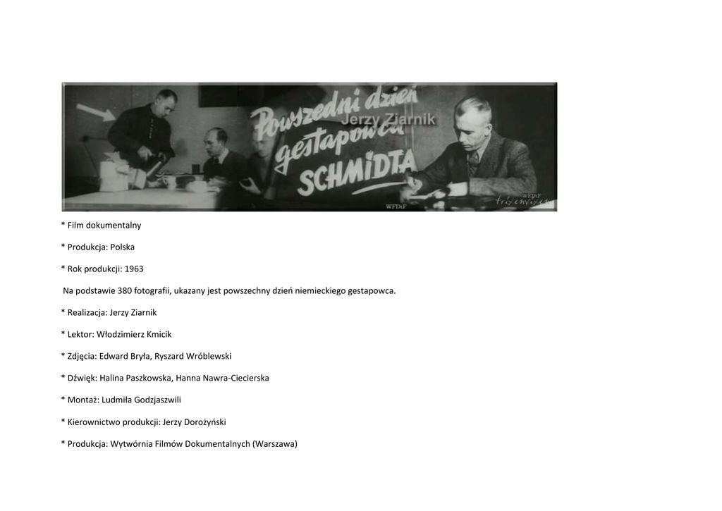 * Film dokumentalny * Produkcja: Polska * Rok produkcji: 1963 Na podstawie 380 fotografii, ukazany jest powszechny dzień niemieckiego gestapowca. * Realizacja: Jerzy Ziarnik * Lektor: Włodzimierz Kmicik * Zdjęcia: Edward Bryła, Ryszard Wróblewski * Dźwięk: Halina Paszkowska, Hanna Nawra-Ciecierska * Montaż: Ludmiła Godzjaszwili * Kierownictwo produkcji: Jerzy Dorożyński * Produkcja: Wytwórnia Filmów Dokumentalnych (Warszawa)