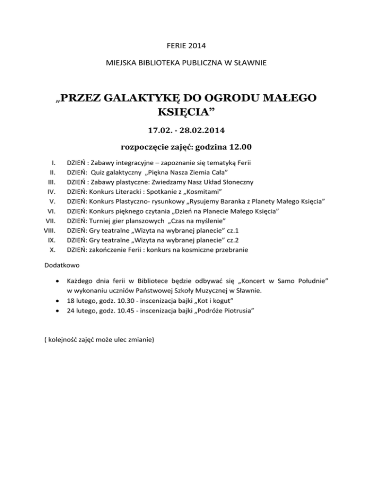 FERIE 2014 MIEJSKA BIBLIOTEKA PUBLICZNA W SŁAWNIE „PRZEZ GALAKTYKĘ DO OGRODU MAŁEGO KSIĘCIA” 17.02. - 28.02.2014 rozpoczęcie zajęć: godzina 12.00 I. II. III. IV. V. VI. VII. VIII. IX. X. DZIEŃ : Zabawy integracyjne – zapoznanie się tematyką Ferii DZIEŃ: Quiz galaktyczny „Piękna Nasza Ziemia Cała” DZIEŃ : Zabawy plastyczne: Zwiedzamy Nasz Układ Słoneczny DZIEŃ: Konkurs Literacki : Spotkanie z „Kosmitami” DZIEŃ: Konkurs Plastyczno- rysunkowy „Rysujemy Baranka z Planety Małego Księcia” DZIEŃ: Konkurs pięknego czytania „Dzień na Planecie Małego Księcia” DZIEŃ: Turniej gier planszowych „Czas na myślenie” DZIEŃ: Gry teatralne „Wizyta na wybranej planecie” cz.1 DZIEŃ: Gry teatralne „Wizyta na wybranej planecie” cz.2 DZIEŃ: zakończenie Ferii : konkurs na kosmiczne przebranie Dodatkowo Każdego dnia ferii w Bibliotece będzie odbywać się „Koncert w Samo Południe” w wykonaniu uczniów Państwowej Szkoły Muzycznej w Sławnie. 18 lutego, godz. 10.30 - inscenizacja bajki „Kot i kogut” 24 lutego, godz. 10.45 - inscenizacja bajki „Podróże Piotrusia” ( kolejność zajęć może ulec zmianie)