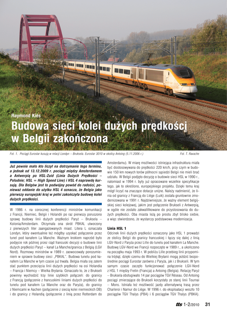 Raymond Kiés Budowa sieci kolei dużych prędkości w Belgii zakończona Fot. 1. Pociągi Eurostar kusują w relacji Londyn – Bruksela. Eurostar 3010 w okolicy Antoing (5.11.2006 r.) Już pewnie mało kto liczył na dotrzymanie tego terminu, a jednak od 13.12.2009 r. pociągi między Amsterdamem a Antwerpią po HSL‑Zuid (Linia Dużych Prędkości – Południe; HSL = High Speed Line) i HSL 4 naprawdę kur‑ sują. Dla Belgów jest to podwójny powód do radości, po‑ nieważ oddanie do użytku HSL 4 oznacza, że Belgia jako pierwszy europejski kraj w pełni zakończyła budowę kolei dużych prędkości. W 1986 r. na corocznej konferencji ministrów komunikacji z Francji, Niemiec, Belgii i Holandii po raz pierwszy poruszono sprawę budowy linii dużych prędkości Paryż – Bruksela – Kolonia/Amsterdam. Otrzymała ona skrót PBKAL utworzony z pierwszych liter zaangażowanych miast. Litera L oznaczała Londyn, który ewentualnie też mógłby uzyskać połączenie przez tunel pod kanałem La Manche. Ważnym krokiem naprzód było podjęcie rok później przez rząd francuski decyzji o budowie linii dużych prędkości Paryż – kanał La Manche/granica z Belgią (LGV Nord). Rozmowy ministrów w 1989 r. zaowocowały porozumieniem w sprawie budowy sieci „PBKAL”. Budowa tunelu pod kanałem La Manche w tym czasie już trwała. Belgia miała się zatem stać punktem przecięcia linii dużych prędkości na osi Holandia – Francja i Niemcy – Wielka Brytania. Oznaczało to, że z Brukseli powinny wychodzić trzy linie szybkich połączeń: do granicy z Francją (połączenie z francuskimi liniami dużych prędkości do tunelu pod kanałem La Manche oraz do Paryża), do granicy z Niemcami w Aachen (połączenie z siecią kolei niemieckich DB) i do granicy z Holandią (połączenie z linią przez Rotterdam do Fot. T. Ravache Amsterdamu). W miarę możliwości istniejąca infrastruktura miała być dostosowywana do prędkości 220 km/h, przy czym w budowie 150 km nowych torów północni sąsiedzi Belgii nie mieli brać udziału. W Belgii podjęto decyzję o budowie sieci HSL w 1990 r., natomiast w 1994 r. były już opracowane wszelkie specyfikacje tego, jak to określono, europejskiego projektu. Dzięki temu kraj mógł liczyć na znaczące dotacje unijne. Należy nadmienić, że linia od granicy z Francją do Liège (Luik) została gruntownie zmodernizowana w 1991 r. Najdziwniejsze, że ważny element belgijskiej sieci kolejowej, jakim jest połączenie Brukseli z Antwerpią, w ogóle nie zostało zakwalifikowane do przystosowania do dużych prędkości. Oba miasta leżą po prostu zbyt blisko siebie, a więc stwierdzono, że wystarczy podstawowa modernizacja. Linia HSL 1 Odcinek linii dużych prędkości oznaczony jako HSL 1 prowadzi ze stolicy Belgii do granicy francuskiej i łączy się dalej z linią LGV‑Nord z Paryża przez Lille do tunelu pod kanałem La Manche. Budowę LGV‑Nord we Francji rozpoczęto w 1989 r., a ukończono na początku maja 1993 r. W pobliżu Lille przebieg linii przypomina trójkąt, dzięki czemu do Wielkiej Brytanii mogą jeździć bezpośrednie pociągi Eurostar zarówno z Paryża, jak i z Brukseli. W tym samym czasie zaczęło funkcjonować połączenie LGV‑Nord z HSL 1 między Fretin (Francja) a Antoing (Belgia). Relację Paryż – Bruksela obsługiwało 14 par pociągów TGV Réseau. Od Antoing pociągi zmierzające do Brukseli korzystały ze starej linii Tournai – Mons. Istniała też możliwość jazdy alternatywną trasą przez Charleroi i Namur do Liège. W 1996 r. do eksploatacji weszło 10 pociągów TGV Thalys (PBA) i 6 pociągów TGV Thalys (PBKA). 1-2/2010 31 Rys. 1. Schemat linii dużych prędkości w Belgii Rys. op de Rails Fot. 2. Jednostka TGV 4331 inaugurująca otwarcie linii dużych prędkości w Belgii; skład zatrzymał się przed granicą holenderską, gdzie przedstawiciele Infrabel, SNCB i Thalys zasadzili drzewka ozdobione hasłem „aby utrzymać naturalną równowagę CO2” (8.12.2009 r.) Fot. R. Kiés Minęło jeszcze półtora roku i 14.12.1997 r. HSL 1 była gotowa w całości. Odcinek od granicy do Lembeek (na południe od Halle) miał 72 km i łączył się z linią Bruksela – Hautmont (Francja). Dodatkowo odcinek Ruisbroek (6 km na południe od Brussel Zuid/Midi) – Lembeek został przystosowany do prędkości 160 km/h. Odcinek z Brussel Zuid/Midi do Ruisbroek do tej prędkości został przystosowany dopiero w 2006 r. Obecnie rozważane jest zwiększenie prędkości między Brukselą a Lembeek do 220 km/h. Uruchomienie HSL 1 skróciło czas podróży między Brukselą a Paryżem do 82 min, co oznaczało skrócenie czasu podróży aż o 1 godz. 18 min. Fot. 3. Połączenia w relacji Bruksela – Niemcy obsługują niemieckie zespoły ICE3; zespól nr 4604 w okolicy Leuven (10.03.2007 r.) Fot. T. Ravache Linie HSL 2 i HSL 3 Linia między Brukselą a granicą z Niemcami, długości 147 km, jest najdłuższą linią dużych prędkości w Belgii. Do Liège nosi ona oznaczenie HSL 2, zaś od Liège do granicy z Niemcami HSL 3. W rzeczywistości składa się ona z trzech odcinków: Schaerbeek – Leuven, Bierbeek (na południe od Leuven) – Bierset (na zachód od Liège) oraz Chênée (na wschód od Liège) – Walhorn i dalej przez Aachen, gdzie włącza się w sieć kolei niemieckich. Linia Aachen – Kolonia została również zmodernizowana i w znacznej części przystosowana do dużych prędkości. Jednak pociągi TGV Thalys (PBKA) docierają tylko do Kolonii. Aby podróżować dalej trzeba przesiąść się na niemieckie pociągi ICE3 kursujące po nowo wybudowanych liniach z prędkością 300 km/h. Między Schaarbeek a Leuven pociągi wykorzystują ist- 32 1-2/2010 niejącą wcześniej linię, która została rozbudowana do czterotorowej. Zasilana jest standardowym napięciem SNCB/NMBS 3 kV, a prędkość szlakowa wynosi 200 km/h. Ten odcinek HSL 2 oddano do eksploatacji w grudniu 2006 r. Odcinek od Leuv