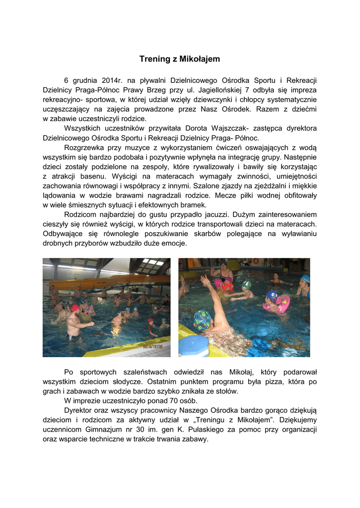 Trening z Mikołajem 6 grudnia 2014r. na pływalni Dzielnicowego Ośrodka Sportu i Rekreacji Dzielnicy Praga-Północ Prawy Brzeg przy ul. Jagiellońskiej 7 odbyła się impreza rekreacyjno- sportowa, w której udział wzięły dziewczynki i chłopcy systematycznie uczęszczający na zajęcia prowadzone przez Nasz Ośrodek. Razem z dziećmi w zabawie uczestniczyli rodzice. Wszystkich uczestników przywitała Dorota Wajszczak- zastępca dyrektora Dzielnicowego Ośrodka Sportu i Rekreacji Dzielnicy Praga- Północ. Rozgrzewka przy muzyce z wykorzystaniem ćwiczeń oswajających z wodą wszystkim się bardzo podobała i pozytywnie wpłynęła na integrację grupy. Następnie dzieci zostały podzielone na zespoły, które rywalizowały i bawiły się korzystając z atrakcji basenu. Wyścigi na materacach wymagały zwinności, umiejętności zachowania równowagi i współpracy z innymi. Szalone zjazdy na zjeżdżalni i miękkie lądowania w wodzie brawami nagradzali rodzice. Mecze piłki wodnej obfitowały w wiele śmiesznych sytuacji i efektownych bramek. Rodzicom najbardziej do gustu przypadło jacuzzi. Dużym zainteresowaniem cieszyły się również wyścigi, w których rodzice transportowali dzieci na materacach. Odbywające się równolegle poszukiwanie skarbów polegające na wyławianiu drobnych przyborów wzbudziło duże emocje. Po sportowych szaleństwach odwiedził nas Mikołaj, który podarował wszystkim dzieciom słodycze. Ostatnim punktem programu była pizza, która po grach i zabawach w wodzie bardzo szybko znikała ze stołów. W imprezie uczestniczyło ponad 70 osób. Dyrektor oraz wszyscy pracownicy Naszego Ośrodka bardzo gorąco dziękują dzieciom i rodzicom za aktywny udział w „Treningu z Mikołajem”. Dziękujemy uczennicom Gimnazjum nr 30 im. gen K. Pułaskiego za pomoc przy organizacji oraz wsparcie techniczne w trakcie trwania zabawy.