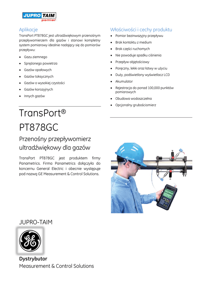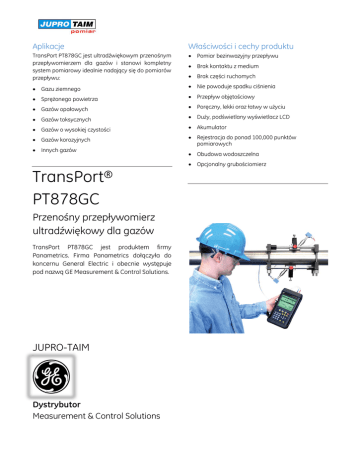 Aplikacje Właściwości i cechy produktu TransPort PT878GC jest ultradźwiękowym przenośnym przepływomierzem dla gazów i stanowi kompletny system pomiarowy idealnie nadający się do pomiarów przepływu: Pomiar bezinwazyjny przepływu Gazu ziemnego Nie powoduje spadku ciśnienia Sprężonego powietrza Przepływ objętościowy Gazów opałowych Poręczny, lekki oraz łatwy w użyciu Gazów toksycznych Duży, podświetlany wyświetlacz LCD Gazów o wysokiej czystości Akumulator Gazów korozyjnych Rejestracja do ponad 100,000 punktów pomiarowych Innych gazów TransPort® PT878GC Przenośny przepływomierz ultradźwiękowy dla gazów TransPort PT878GC jest produktem firmy Panametrics. Firma Panametrics dołączyła do koncernu General Electric i obecnie występuje pod nazwą GE Measurement & Control Solutions. JUPRO-TAIM G Dystrybutor Measurement & Control Solutions Brak kontaktu z medium Brak części ruchomych Obudowa wodoszczelna Opcjonalny grubościomierz GE Measurement & Control Solutions Przenośny pomiar przepływu Przepływomierz PT878GC jest wszechstronnym, przenośnym systemem posiadającym opcje i akcesoria pozwalające mierzyć przepływ gazu w wielu aplikacjach, również niemożliwych do zmierzenia innymi metodami pomiarowymi. Przepływomierze bezinwazyjne dotychczas były wykorzystywane tylko do pomiaru przepływu cieczy ponieważ istniejące metody pomiarowe nie pozwalały mierzyć przepływu gazu w rurociągach metalowych. Kilkanaście lat temu firma General Electric wprowadziła nową technologię, która rozszerza możliwości zastosowania przepływomierzy bezinwazyjnych również do pomiaru przepływu gazu. Przepływomierz PT878GC może być wykorzystywany do pomiaru przepływu każdego gazu. Jest niezastąpiony w pomiarze gazów agresywnych, toksycznych, o wysokiej czystości i sterylnych, a także w każdej aplikacji nie pozwalającej na ingerowaniu w rurociąg. Brak konieczności cięcia lub wiercenia w rurociągu znacząco zmniejsza koszty instalacji. Przepływomierz nie posiada części ruchomych, a żadne jego części nie są w kontakcie z medium, nie powoduje spadku ciśnienia, a także ma wysoką zakresowość. Przepływomierz zaprojektowany został do pomiaru na rurociągach od 20 do 600mm. Brak spadku ciśnienia, niski koszt eksploatacji Ponieważ sensory przepływomierza montowane są na zewnętrznej powierzchni rurociągu nie powodują one spadku ciśnienia charakterystycznego dla większości innych metod pomiarowych. PT878GC nie posiada części które powodują zawirowania w przepływie, ani części zużywających się. W rezultacie przepływomierz nie potrzebuje smarowania, a także nie wymaga żadnej innej konserwacji. Technologia głowic bezinwazyjnych Jednym z największych wyzwań przy projektowaniu przepływomierzy bezinwazyjnych do gazu jest trudność w przesyłaniu sygnału ultradźwiękowego przez metalową ściankę rurociągu, gaz a następnie ponownie znowu poprzez ściankę rurociągu do drugiego sensora. W układach gazowych tylko 4,9×10-7 procent energii dźwięku jest dostarczane do sensora odbiorczego. Jest to zbyt niska wartość do wykonania wiarygodnego pomiaru. Nowa linia sensorów bezinwazyjnych generuje sygnał, który jest pięć do dziesięciu razy mocniejszy niż w tradycyjnych sondach ultradźwiękowych. Czujniki wysyłają czysty, kodowany sygnał z bardzo niskim poziomem szumów. Rezultatem zastosowania nowych sensorów jest wiarygodny pomiar przepływu gazów nawet o bardzo małej gęstości. Ultradźwiękowe bezinwazyjne głowice pomiarowe System pomiaru przepływu TransPort PT 878GC wraz z walizkami transportowymi . Autoryzowany Dystrybutor GE Measurement & Control Solutions GE Measurement & Control Solutions Prosty montaż, łatwy w użyciu PT878GC jest łatwy w użyciu, a jego prosty montaż pozwoli w kilka minut uruchomić urządzenie i dokonać pomiar przepływu. Montaż głowic pomiarowych nie wymaga użycia żądnych narzędzi. Wystarczy wprowadzić parametry rurociągu, rodzaj gazu, założyć sensory na rurociąg w odpowiedniej odległości. Doświadczony użytkownik potrafi przeprowadzić wiele różnych rodzajów pomiarów w ciągu jednego dnia. Przepływomierz nadaje się idealnie do wykonywania różnego rodzaju inspekcji i kontroli przepływu. Ekonomiczne rozwiązanie Przepływomierz przenośny by być przydatnym musi być tani w użytkowaniu oraz prosty w obsłudze. PT878GC został zaprojektowany w taki sposób aby korzystać z niego przez wiele lat. Solidne wykonanie urządzenia minimalizuje koszty serwisowe oraz konserwacyjne. Grubościomierz Grubość ścianki rurociągu jest krytycznym parametrem przy bezinwazyjnych pomiarach przepływu. Opcjonalny grubościomierz pozwala na dokładne zmierzenie grubości ścianki z zewnątrz rurociągu. Technika pomiaru czasu przejścia fali ultradźwiękowej Pomiar czasu przejścia fali ultradźwiękowej W tej metodzie pomiaru wykorzystywana jest para lub opcjonalnie dwie pary przetworników pomiarowych. Każdy z nich jest równocześnie odbiornikiem jak i nadajnikiem sygnału ultradźwiękowego o odpowiedniej częstotliwości, przechodzącego przez medium. Podczas pracy każdy z przetworników generuje określoną liczbę impulsów ultradźwiękowych jak i odbiera identyczną liczbę impulsów. Kiedy impulsy ultradźwiękowe przepuszczane są poprzez poruszający się gaz, impulsy poruszające się w tym samy kierunku co przepływający gaz (downstream), przebywają odległość między przetwornikami szybciej niż impulsy wysłane w przeciwnym kierunku (upstream). Różnica czasu przejścia sygnałów ultradźwiękowych przez medium jest proporcjonalna do prędkości przepływu. Kiedy gaz nie porusza się różnica czasu przejścia fali ultradźwiękowej w obu kierunkach równa się zero. Alfanumeryczny i graficzny wyświetlacz LCD Opcjonalny grubościomierz Duży, wielofunkcyjny wyświetlacz LCD wyświetla dane pomiarowe w postaci alfanumerycznej oraz grafic