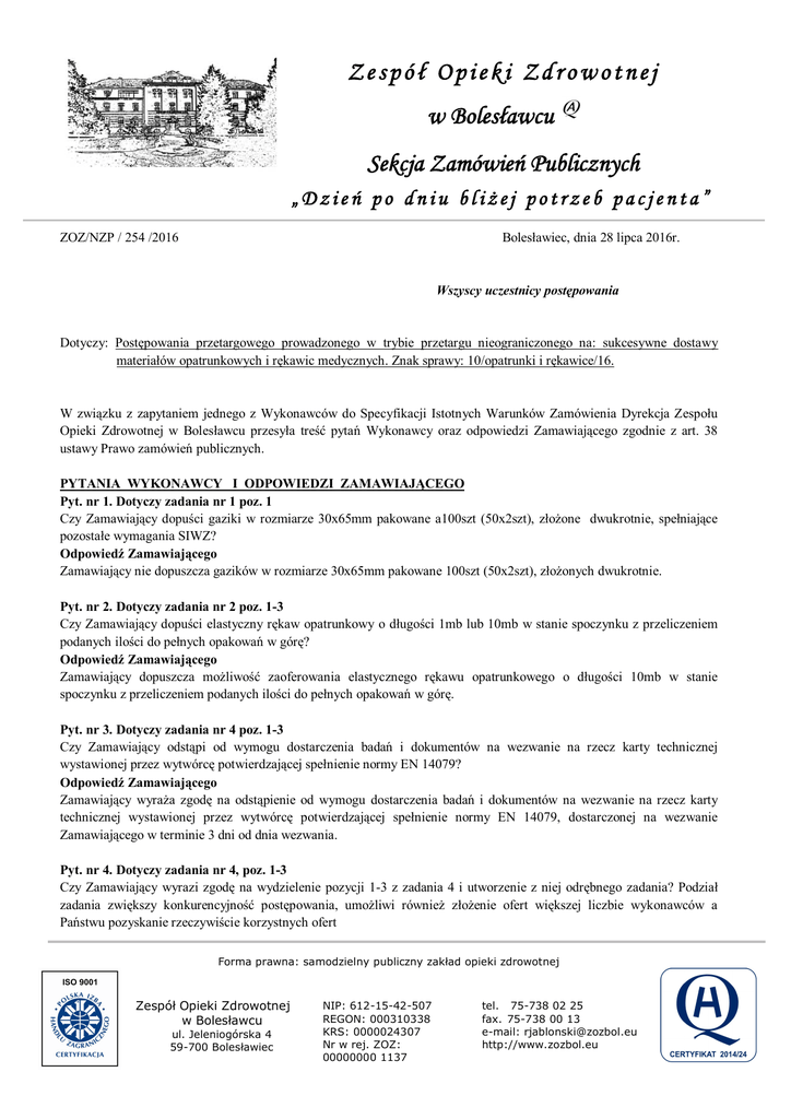 Zespół Opieki Zdrowotnej w Bolesławcu Sekcja Zamówień Publicznych „Dzień po dniu bliżej potrzeb pacjenta” ZOZ/NZP / 254 /2016 Bolesławiec, dnia 28 lipca 2016r. Wszyscy uczestnicy postępowania Dotyczy: Postępowania przetargowego prowadzonego w trybie przetargu nieograniczonego na: sukcesywne dostawy materiałów opatrunkowych i rękawic medycznych. Znak sprawy: 10/opatrunki i rękawice/16. W związku z zapytaniem jednego z Wykonawców do Specyfikacji Istotnych Warunków Zamówienia Dyrekcja Zespołu Opieki Zdrowotnej w Bolesławcu przesyła treść pytań Wykonawcy oraz odpowiedzi Zamawiającego zgodnie z art. 38 ustawy Prawo zamówień publicznych. PYTANIA WYKONAWCY I ODPOWIEDZI ZAMAWIAJĄCEGO Pyt. nr 1. Dotyczy zadania nr 1 poz. 1 Czy Zamawiający dopuści gaziki w rozmiarze 30x65mm pakowane a100szt (50x2szt), złożone dwukrotnie, spełniające pozostałe wymagania SIWZ? Odpowiedź Zamawiającego Zamawiający nie dopuszcza gazików w rozmiarze 30x65mm pakowane 100szt (50x2szt), złożonych dwukrotnie. Pyt. nr 2. Dotyczy zadania nr 2 poz. 1-3 Czy Zamawiający dopuści elastyczny rękaw opatrunkowy o długości 1mb lub 10mb w stanie spoczynku z przeliczeniem podanych ilości do pełnych opakowań w górę? Odpowiedź Zamawiającego Zamawiający dopuszcza możliwość zaoferowania elastycznego rękawu opatrunkowego o długości 10mb w stanie spoczynku z przeliczeniem podanych ilości do pełnych opakowań w górę. Pyt. nr 3. Dotyczy zadania nr 4 poz. 1-3 Czy Zamawiający odstąpi od wymogu dostarczenia badań i dokumentów na wezwanie na rzecz karty technicznej wystawionej przez wytwórcę potwierdzającej spełnienie normy EN 14079? Odpowiedź Zamawiającego Zamawiający wyraża zgodę na odstąpienie od wymogu dostarczenia badań i dokumentów na wezwanie na rzecz karty technicznej wystawionej przez wytwórcę potwierdzającej spełnienie normy EN 14079, dostarczonej na wezwanie Zamawiającego w terminie 3 dni od dnia wezwania. Pyt. nr 4. Dotyczy zadania nr 4, poz. 1-3 Czy Zamawiający wyrazi zgodę na wydzielenie pozycji 1-3 z zadania 4 i utworzenie z niej odrębnego zadania? Podział zadania zwiększy konkurencyjność postępowania, umożliwi również złożenie ofert większej liczbie wykonawców a Państwu pozyskanie rzeczywiście korzystnych ofert Forma prawna: samodzielny publiczny zakład opieki zdrowotnej Zespół Opieki Zdrowotnej w Bolesławcu ul. Jeleniogórska 4 59-700 Bolesławiec NIP: 612-15-42-507 REGON: 000310338 KRS: 0000024307 Nr w rej. ZOZ: 00000000 1137 tel. 75-738 02 25 fax. 75-738 00 13 e-mail: [email protected] http://www.zozbol.eu Odpowiedź Zamawiającego Zamawiający nie wyraża zgody na wydzielenie pozycji 1-3 z zadania 4 i utworzenie z nich odrębnego zadania. Pyt. nr 5. Dotyczy zadania nr 6, poz. 1-3 Czy Zamawiający dopuści opaski gipsowe szybkowiążące nawinięte na plastikowy trzpień/krzyżak, spełniające pozostałe wymagania SIWZ? Odpowiedź Zamawiającego Zamawiający dopuszcza możliwość zaoferowania opaski gipsowej szybkowiążącej nawiniętej na plastikowy trzpień/krzyżak, spełniające pozostałe wymagania SIWZ. Pyt. nr 6. Dotyczy zadania nr 10 poz. 1-3 Czy Zamawiający dopuści opatrunek pokryty miękką parafiną bez zawartości wazeliny, kwasów tłuszczowych oraz wosku? Odpowiedź Zamawiającego Zamawiający dopuszcza możliwość zaoferowania opatrunku pokrytego miękką parafiną bez zawartości wazeliny, kwasów tłuszczowych oraz wosku. Pyt. nr 7. Dotyczy zadania nr 13 poz. 1 Czy Zamawiający dopuści watę celulozową pakowaną a’5 kg z przeliczeniem podanych ilości? Odpowiedź Zamawiającego Zamawiający dopuszcza możliwość zaoferowania waty celulozowej pakowanej a’5 kg, pod warunkiem odpowiedniego przeliczenia zamawianych ilości. W przypadku gdy zaokrąglona ilość wyjdzie po przecinku, należy zawsze zaokrąglić w górę do pełnego opakowania. Pyt. nr 8. Dotyczy zadania nr 14 poz. 1-2 Czy Zamawiający odstąpi od wymogu posiadania badań wykonanych w niezależnym akredytowanym laboratorium? Odpowiedź Zamawiającego Zamawiający nie wyraża zgody na odstąpienie od wymogu posiadania badań wykonanych w niezależnym akredytowanym laboratorium. Pyt. nr 9. Dotyczy zadania nr 14 poz. 1-2 Czy Zamawiający odstąpi od wymogu dodatkowego opakowania foliowego zawartości kartonu zbiorczego? Odpowiedź Zamawiającego Zamawiający wyraża zgodę na odstąpienie od wymogu dodatkowego opakowania foliowego zawartości kartonu zbiorczego. Pyt. nr 10. Dotyczy zadania nr 14 poz. 1-4 Czy Zamawiający dopuści opatrunki w opakowaniu papierowym foliowanym od środka? Odpowiedź Zamawiającego Zamawiający nie dopuszcza opatrunków w opakowaniu papierowym foliowanym od środka. Pyt. nr 11. Dotyczy zadania nr 14 poz. 2 Czy Zamawiający dopuści opatrunek w zbiorczym kartoniku a’100szt? Odpowiedź Zamawiającego Zamawiający dopuszcza możliwość zaoferowania opatrunków w zbiorczym kartoniku a’100szt, pod warunkiem odpowiedniego przeliczenia zamawianych ilości. W przypadku gdy zaokrąglona ilość wyjdzie po przecinku, należy zawsze zaokrąglić w górę do pełnego opakowania. Pyt. nr 12. Dotyczy zadania nr 14 poz. 3-5 Czy Zamawiający dopuści opatrunek o wadze 50g/m2? Odpowiedź Zamawiającego Zamawiający dopuszcza możliwość zaoferowania opatrunku o wadze 50g/m2, pod warunkiem spełnienia pozostałych warunków SIWZ. Pyt. nr 13. Dotyczy zadania nr 14 poz. 6-11 Czy Zamawiający odstąpi od wymogu dodatkowego opakowania foliowego zawartości kartonu zbiorczego? Odpowiedź Zamawiającego Zamawiający nie wyraża zgody na odstąpienie od wymogu dodatkowego opakowania foliowego zawartości kartonu zbiorczego. Pyt. nr 14. Dotyczy zadania nr 14 poz. 7-9 Czy Zamawiający dopuści przylepiec na tkaninie bawełnianej z ząbkowanym brzegiem? Odpowiedź Zamawiającego Zamawiający nie dopuszcza przylepca na tkaninie bawełnianej z ząbkowanym brzegiem. Pyt. nr 15. Dotyczy zadania nr 14 poz. 7-9 Czy Zamawiający dopu