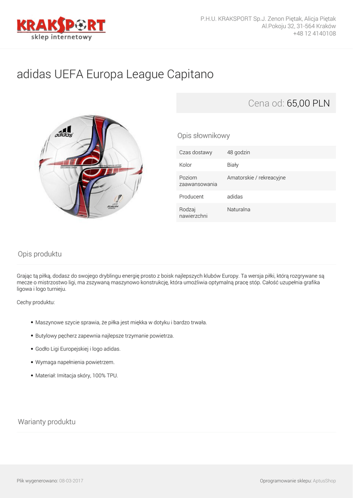 P.H.U. KRAKSPORT Sp.J. Zenon Piętak, Alicja Piętak Al.Pokoju 32, 31-564 Kraków +48 12 4140108 adidas UEFA Europa League Capitano Cena od: 65,00 PLN Opis słownikowy Czas dostawy 48 godzin Kolor Biały Poziom zaawansowania Amatorskie / rekreacyjne Producent adidas Rodzaj nawierzchni Naturalna Opis produktu Grając tą piłką, dodasz do swojego dryblingu energię prosto z boisk najlepszych klubów Europy. Ta wersja piłki, którą rozgrywane są mecze o mistrzostwo ligi, ma zszywaną maszynowo konstrukcję, która umożliwia optymalną pracę stóp. Całość uzupełnia grafika ligowa i logo turnieju. Cechy produktu: Maszynowe szycie sprawia, że piłka jest miękka w dotyku i bardzo trwała. Butylowy pęcherz zapewnia najlepsze trzymanie powietrza. Godło Ligi Europejskiej i logo adidas. Wymaga napełnienia powietrzem. Materiał: Imitacja skóry, 100% TPU. Warianty produktu Plik wygenerowano: 08-03-2017 Oprogramowanie sklepu: AptusShop P.H.U. KRAKSPORT Sp.J. Zenon Piętak, Alicja Piętak Al.Pokoju 32, 31-564 Kraków +48 12 4140108 5 Plik wygenerowano: 08-03-2017 Powered by TCPDF (www.tcpdf.org) 65,00 PLN Oprogramowanie sklepu: AptusShop