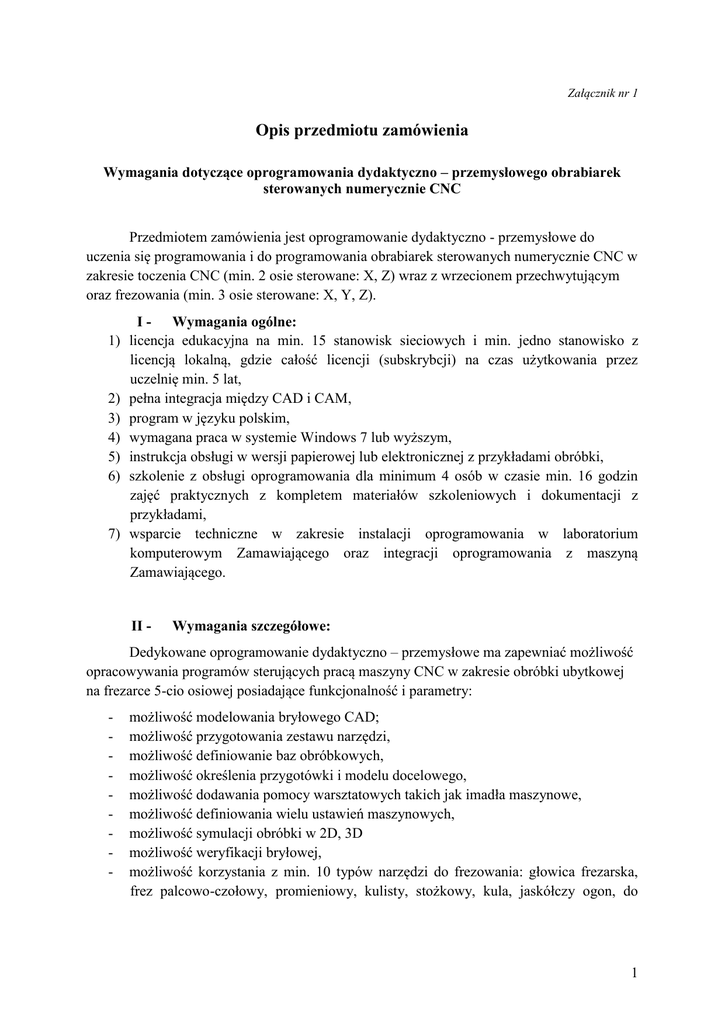 Załącznik nr 1 Opis przedmiotu zamówienia Wymagania dotyczące oprogramowania dydaktyczno – przemysłowego obrabiarek sterowanych numerycznie CNC Przedmiotem zamówienia jest oprogramowanie dydaktyczno - przemysłowe do uczenia się programowania i do programowania obrabiarek sterowanych numerycznie CNC w zakresie toczenia CNC (min. 2 osie sterowane: X, Z) wraz z wrzecionem przechwytującym oraz frezowania (min. 3 osie sterowane: X, Y, Z). 1) 2) 3) 4) 5) 6) 7) I - Wymagania ogólne: licencja edukacyjna na min. 15 stanowisk sieciowych i min. jedno stanowisko z licencją lokalną, gdzie całość licencji (subskrybcji) na czas użytkowania przez uczelnię min. 5 lat, pełna integracja między CAD i CAM, program w języku polskim, wymagana praca w systemie Windows 7 lub wyższym, instrukcja obsługi w wersji papierowej lub elektronicznej z przykładami obróbki, szkolenie z obsługi oprogramowania dla minimum 4 osób w czasie min. 16 godzin zajęć praktycznych z kompletem materiałów szkoleniowych i dokumentacji z przykładami, wsparcie techniczne w zakresie instalacji oprogramowania w laboratorium komputerowym Zamawiającego oraz integracji oprogramowania z maszyną Zamawiającego. II - Wymagania szczegółowe: Dedykowane oprogramowanie dydaktyczno – przemysłowe ma zapewniać możliwość opracowywania programów sterujących pracą maszyny CNC w zakresie obróbki ubytkowej na frezarce 5-cio osiowej posiadające funkcjonalność i parametry: - możliwość modelowania bryłowego CAD; możliwość przygotowania zestawu narzędzi, możliwość definiowanie baz obróbkowych, możliwość określenia przygotówki i modelu docelowego, możliwość dodawania pomocy warsztatowych takich jak imadła maszynowe, możliwość definiowania wielu ustawień maszynowych, możliwość symulacji obróbki w 2D, 3D możliwość weryfikacji bryłowej, możliwość korzystania z min. 10 typów narzędzi do frezowania: głowica frezarska, frez palcowo-czołowy, promieniowy, kulisty, stożkowy, kula, jaskółczy ogon, do 1 - - - rowków teowych, do gwintów prostych i stożkowych, a także narzędzie grawerskie i do frezowania faz możliwość korzystania z narzędzi do zabiegów wiertarskich takie jak: wiertło zwykłe, do nakiełków, nawiertak, gwintownik, rozwiertak i wytaczadło. import/export plików w formatach: ACIS® (SAT), AutoCAD (DWG), CSV, DXF™, Autodesk Inventor®, IGES, Mechanical Desktop®, Parasolid®, (X_B, X_T), Solid Edge®, SolidWorks®, TXT, VDA-FS, możliwość zapisu danych w formatach: Esp, est, ect, DXF, DWG, X_B, X_T, bmp, IGES, SAL, 3dm, STEP, STL, automatyczne wyszukiwanie i zaznaczanie geometrii do obróbki (tworzenie tzw. struktur) skrawaniem i cięcia elektroerozyjnego drutem (EDM) określenie narzędzi i określenie parametrów obróbki sprawdzenie poprawności technologii poprzez symulację obróbki (tokarskiej, frezarskiej, EDM), generowanie kodu na obrabiarki przy użyciu dostarczonych postprocesorów na maszynę CNC, tworzenie Raportów, możliwość modelowania obróbki na maszynach CNC w zakresie:  obróbki frezarskiej 2,5D,  obróbki frezarskiej do równoczesnego 3-osiowego frezowania,  obróbki frezarskiej kształtowej 5-osiowej,  dla obróbki elektroerozyjnej 2-3 osi,  obróbki drutem EDM 5-osiowej,  obróbki tokarskiej 2 wrzecionowej,  obróbki tokarskiej do toczenia wielowrzecionowego i wielogłowicowego  obróbki tokarsko-frezarskiej z napędzanymi narzędziami 5-osiowa, możliwość generowania kodu NC i przesyłania go bezpośrednio do maszyny lub poprzez zapis do pliku, możliwość edycji kodu oraz komunikacji w szczególności: o brak ograniczeń odnośnie objętości kodu NC; o numerowanie/ renumerowanie linii, o obsługę typowych znaczących kodów, o funkcjonalność wymaganą dla nowoczesnego edytora, m.in. edycję typu "przeciągnij i upuść”. 2