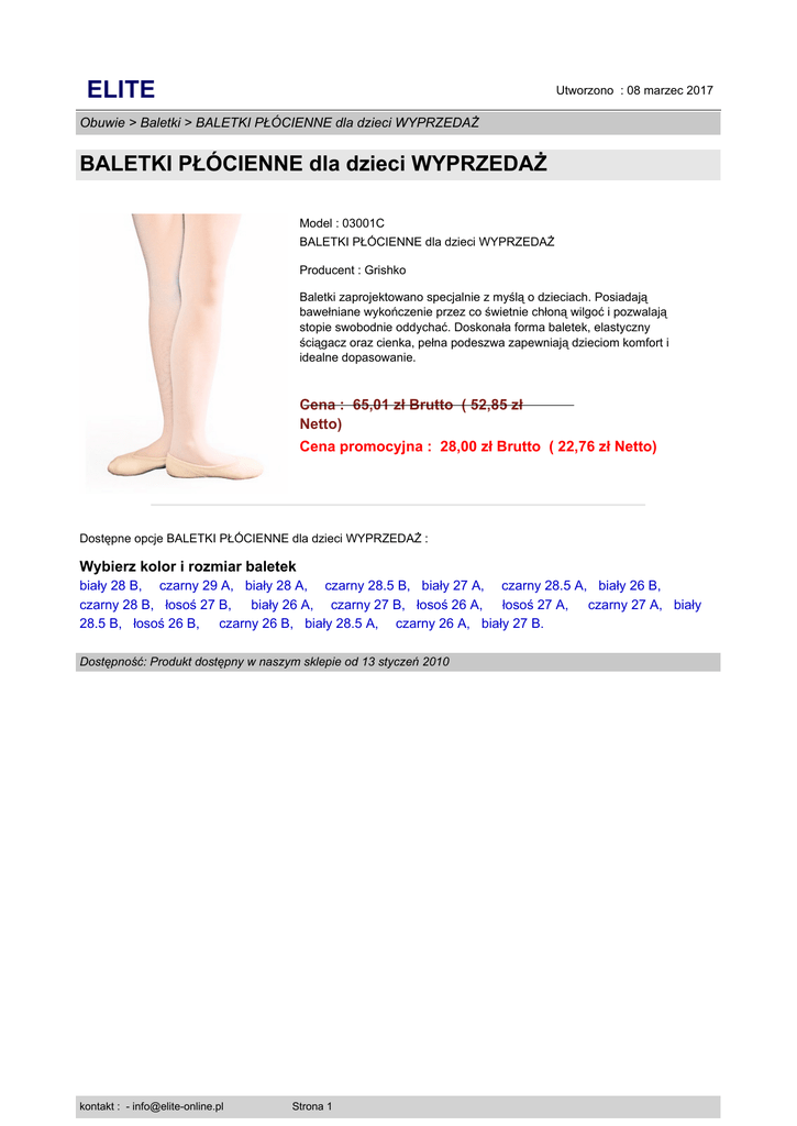 ELITE Utworzono : 08 marzec 2017 Obuwie > Baletki > BALETKI PŁÓCIENNE dla dzieci WYPRZEDAŻ BALETKI PŁÓCIENNE dla dzieci WYPRZEDAŻ Model : 03001C BALETKI PŁÓCIENNE dla dzieci WYPRZEDAŻ Producent : Grishko Baletki zaprojektowano specjalnie z myślą o dzieciach. Posiadają bawełniane wykończenie przez co świetnie chłoną wilgoć i pozwalają stopie swobodnie oddychać. Doskonała forma baletek, elastyczny ściągacz oraz cienka, pełna podeszwa zapewniają dzieciom komfort i idealne dopasowanie. Cena : 65,01 zł Brutto ( 52,85 zł Netto) Cena promocyjna : 28,00 zł Brutto ( 22,76 zł Netto) Dostępne opcje BALETKI PŁÓCIENNE dla dzieci WYPRZEDAŻ : Wybierz kolor i rozmiar baletek biały 28 B, czarny 29 A, biały 28 A, czarny 28.5 B, biały 27 A, czarny 28.5 A, biały 26 B, czarny 28 B, łosoś 27 B, biały 26 A, czarny 27 B, łosoś 26 A, łosoś 27 A, czarny 27 A, biały 28.5 B, łosoś 26 B, czarny 26 B, biały 28.5 A, czarny 26 A, biały 27 B. Dostępność: Produkt dostępny w naszym sklepie od 13 styczeń 2010 kontakt : - [email protected] Strona 1