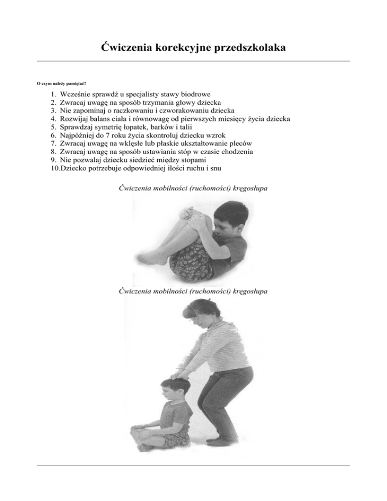 Ćwiczenia korekcyjne przedszkolaka O czym należy pamiętać? 1. Wcześnie sprawdź u specjalisty stawy biodrowe 2. Zwracaj uwagę na sposób trzymania głowy dziecka 3. Nie zapominaj o raczkowaniu i czworakowaniu dziecka 4. Rozwijaj balans ciała i równowagę od pierwszych miesięcy życia dziecka 5. Sprawdzaj symetrię łopatek, barków i talii 6. Najpóźniej do 7 roku życia skontroluj dziecku wzrok 7. Zwracaj uwagę na wklęsłe lub płaskie ukształtowanie pleców 8. Zwracaj uwagę na sposób ustawiania stóp w czasie chodzenia 9. Nie pozwalaj dziecku siedzieć między stopami 10.Dziecko potrzebuje odpowiedniej ilości ruchu i snu Ćwiczenia mobilności (ruchomości) kręgosłupa Ćwiczenia mobilności (ruchomości) kręgosłupa Ćwiczenia mobilności (ruchomości) kręgosłupa Cel: poprawa wysklepienia stopy, równowagi, korygowanie koślawości kolan Ryciny z książki Owczarek S. 2001 "Gimnastyka Przedszkolaka" WSiP Warszawa