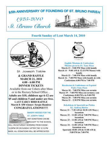 1925-2010 St. Bruno Church Fourth Sunday of Lent March 14, 2010 & GRAND RAFFLE MARCH 21, 2010 4:00 - 6:00 PM DINNER TICKETS Available from our Ushers after Mass or in the Rectory/School Office… Adults are $10, children age 6-12 are $5 and children 5 and under are free. LAST EARLY BIRD RAFFLE March 8- $50 winner: Sergio Ramirez CONGRATULATIONS!!!!! BAKERY NEEDED FOR THE ST. JOSEPH TABLE ANY DONATIONS CAN BE BROUGHT TO THE SCHOOL HALL ON SATURDAY MORNING FROM 9:00AM 12:00PM OR ON SUNDAY AFTER THE 12:15 PM MASS. ALL DONATIONS WILL BE APPRECIATED. English Missions & Confessions Mission given by Fr. Tony Pizzo March 13 – 5:00 PM Mass with homily March 14 – 9:00 AM & 12:15 PM Masses with homily March 15 – 7:00 PM Mass with homily March 16 – 7:00 PM Mass with homily & with Confessions 6:00 PM to 7:00 PM Recolecion & Confesiones en Espańol Padre Tony Pizzo Marzo 18 – 7:00 PM Misa con sermón Marzo 19 – 7:00 PM Misa con sermon y con Confesiones 8:00 PM a la 9:00 PM Marzo 20 – 7:00 PM Misa con sermón Marzo 21 – 2:30 PM Misa con sermón Rekolekcje & Spowiedź po Polsku Ks. Andrzej Bartos Marzec 21 – 7:30 AM & 10:30 AM Msze z kazaniem Marzec 22 – 11:00 AM & 7:00 PM Msze z kazaniem Marzec 23 – 11:00 AM & 7:00 PM Msze z kazaniem Marzec 24 – 11:00 AM & 7:00 PM Msze z kazaniem oraz Spowiedź 10:00 AM do 11:00 AM & 5:00 PM do 7:00 PM WEEK AT A GLANCE Sunday, March 14 12:15 PM Chords for the Lord 4:00 PM Gożkie Żale Monday, March 15 4:30 PM Choir Tuesday, March 16 6:00 PM Devotion to Our Lady of Guadalupe Stations of the Cross (Spanish) 7:00 PM Boy Scouts Wednesday, March 17 6:00 PM Religious Education 6:30 PM Bible Study (Spanish) 7:00 PM Devotions to Our Lady of Perpetual Help and Mass(Polish) Thursday, March 18 9:00 AM - 6:00 PM Eucharistic Adoration 3:00PM Seniors 3:00 PM - 4:00PM Confessions 5:00 PM - 6:00PM Confessions 3:00 PM Divine Mercy Devotion (Polish) 4:00 PM Divine Mercy Devotion (English) 5:00 PM Divine Mercy Devotion (Spanish) 5:00 PM Girl Scouts 6:00 PM Stations of the Cross (English) 7:00 PM CAPS Friday, March 19 2:00 PM Stations of the Cross (School Children) 6:00 PM Cub Scouts 6:45 PM BINGO Saturday, March 20 10:30 AM Brownies Coming Events: March 18- 21 Spanish Mission March 21 - St. Joseph Table March 21 - 24 Polish Mission March 30 - Living Stations ( School Children) March 31 - Confessions SUPPORT AND PRAY FOR OUR MILITARY MEN AND WOMEN SERVING IN OUR ARMED FORCES. Capt. Eric Henzler, USMC Lance Corp. Keith Emerson, USMC Lance Corp. Fernando Moctezuma, USMC Brian Espino, USMC Alex Chobot, USN E3 Airman Kelly Centrangalo, Air Force Lt. Robert Logisz, Army Sgt. Matt Michalski, USMC. Sgt. Christopher C. Garza, Army Pfc. Tyrus Hawkins, Army March 14, 2010 Budgeted Weekly Collection Goal $7,800.00 Sunday Collection 03-07-10 $6,624.05 THANK YOU FOR YOUR CONTINUED GENEROSITY. Please remember all the souls of the faithful departed especially: John Marszalek, Baby Victoria Komperda † Stations of the Cross Thursdays at 6:00 PM in English Fridays at 2:00 PM - School Children † Droga Krzyżowa Każdy Piątek – 7:00 PM po Polsku Każdy Piątek – 2:00 PM – Dzieci Szkolne (po Angielsku) Gożkie Żale w każdą Niedzielę 4:00PM † Via Crucis Cada Martes – 7:00 PM en Espańol Cada Viernes – 2:00 PM – La Escuela (en Inglés) LENTEN REGULATIONS Abstinence from meats is to be observed by all Catholics 14 years old and older on Ash Wednesday and on all the Fridays of Lent. PRZEPISY WIELKOPOSTNE Wstrzemięźliwość od potraw mięsnych musi być przestrzegana przez wszystkich Katolików, którzy ukończyli 14 rok źycia, w Środę Popielcowạ oraz we wszystkie Piạtki w okresie Wielkiego Postu. AS REGLAS CUARESMALES PARA La Iglesia nos llama en la estación de la Cuaresma a renovar nuestras vidas como discípulos de Jesús, y nos prepara para la celebración del Misterio Pascual en la Semana Santa. Las siguientes normas Cuaresmales vienen de la Iglesia universal y son aplicadas a toda la Arquidiócesis. Thoughts from our Pastor St. Paul says, "Whoever is in Christ is a new creation!" God doesn't want to just make a few cosmetic changes; he wants to renovate us inside and out… Many people have the idea that you get to heaven by doing good deeds. That was the attitude of the older son in today's parable. He thought he could demand his father's love: "Look at all the things I have done. How hard I worked! And I never got anything it return. I expect some credit."… But the older son had it wrong. No one can demand love. Nor can we earn love. In the same way, no one can "earn" heaven. People today tend to look at heaven as one more entitlement program - like Social Security. You pay something into it and when you retire, you get the benefits. Heaven does not work that way…. The younger son, he understood what heaven means. He said, "Father I have sinned against heaven and against you. I no longer deserve to be called you son." That boy knew he could not demand his father's love. He could only receive it as a free gift…. The new creation involves much more than touching up the exterior and sweeping out a few rooms. No, it is a complete renovation - a whole new interior. Heaven, after all, is a relationship with God - through Christ - in the Communion of Saints. It requires a humbled heart - like that younger son had, after he repented. Fr. Tony _________________________________________________________________________________ Według potocznej filozofii, ludzie dzielą się na dobrych i złych: dobrych trzeba szanować, chwalić i nagradzać; złych piętnować, potępiać i karać. Na pozór jest to zgodne z zasadami religii i postulatami sumienia, które mówi wyraźnie: czyń dobro, zła unikaj… Ale problem w tym, że utożsamia się w ten sposób zło z grzesznikiem, potępia się człowieka, a nie jego postępowanie. Poza tym, dzieląc ludzi zbyt łatwo potępiamy i przekreślamy innych, a usprawiedliwiamy siebie. A jeszcze na dodatek, przyklejaj