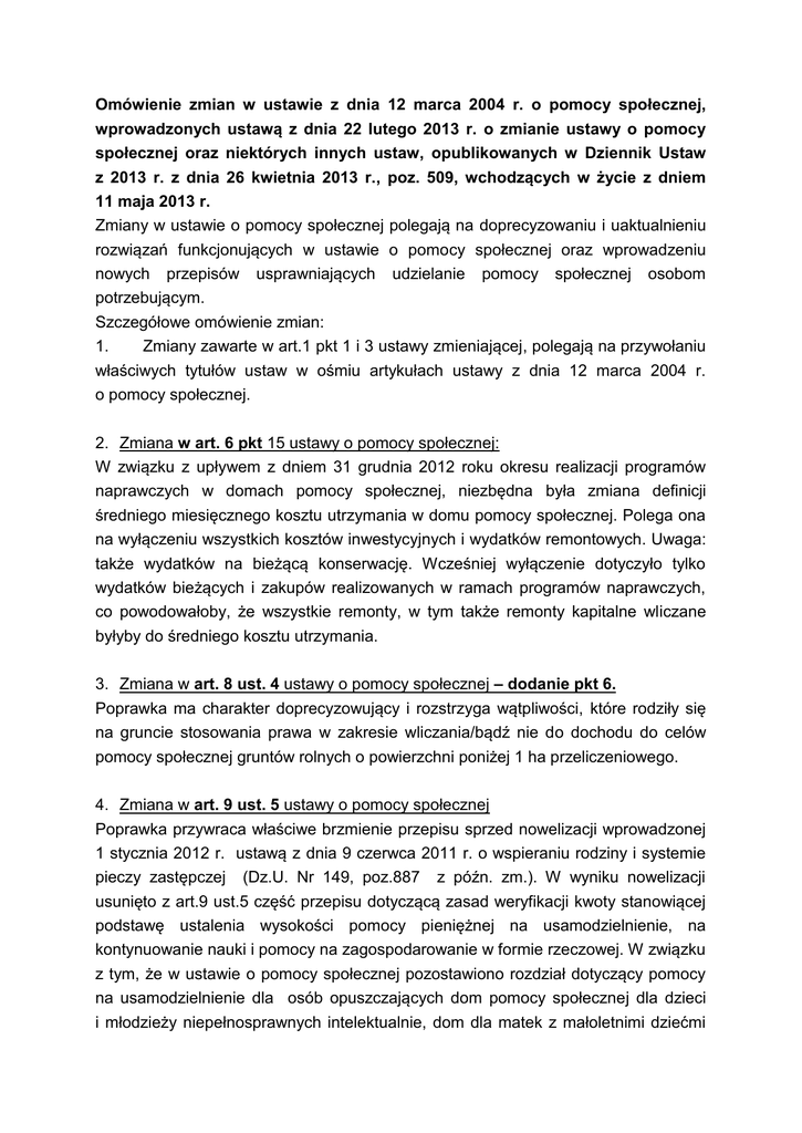 Omówienie zmian w ustawie z dnia 12 marca 2004 r. o pomocy społecznej, wprowadzonych ustawą z dnia 22 lutego 2013 r. o zmianie ustawy o pomocy społecznej oraz niektórych innych ustaw, opublikowanych w Dziennik Ustaw z 2013 r. z dnia 26 kwietnia 2013 r., poz. 509, wchodzących w życie z dniem 11 maja 2013 r. Zmiany w ustawie o pomocy społecznej polegają na doprecyzowaniu i uaktualnieniu rozwiązań funkcjonujących w ustawie o pomocy społecznej oraz wprowadzeniu nowych przepisów usprawniających udzielanie pomocy społecznej osobom potrzebującym. Szczegółowe omówienie zmian: 1. Zmiany zawarte w art.1 pkt 1 i 3 ustawy zmieniającej, polegają na przywołaniu właściwych tytułów ustaw w ośmiu artykułach ustawy z dnia 12 marca 2004 r. o pomocy społecznej. 2. Zmiana w art. 6 pkt 15 ustawy o pomocy społecznej: W związku z upływem z dniem 31 grudnia 2012 roku okresu realizacji programów naprawczych w domach pomocy społecznej, niezbędna była zmiana definicji średniego miesięcznego kosztu utrzymania w domu pomocy społecznej. Polega ona na wyłączeniu wszystkich kosztów inwestycyjnych i wydatków remontowych. Uwaga: także wydatków na bieżącą konserwację. Wcześniej wyłączenie dotyczyło tylko wydatków bieżących i zakupów realizowanych w ramach programów naprawczych, co powodowałoby, że wszystkie remonty, w tym także remonty kapitalne wliczane byłyby do średniego kosztu utrzymania. 3. Zmiana w art. 8 ust. 4 ustawy o pomocy społecznej – dodanie pkt 6. Poprawka ma charakter doprecyzowujący i rozstrzyga wątpliwości, które rodziły się na gruncie stosowania prawa w zakresie wliczania/bądź nie do dochodu do celów pomocy społecznej gruntów rolnych o powierzchni poniżej 1 ha przeliczeniowego. 4. Zmiana w art. 9 ust. 5 ustawy o pomocy społecznej Poprawka przywraca właściwe brzmienie przepisu sprzed nowelizacji wprowadzonej 1 stycznia 2012 r. ustawą z dnia 9 czerwca 2011 r. o wspieraniu rodziny i systemie pieczy zastępczej (Dz.U. Nr 149, poz.887 z późn. zm.). W wyniku nowelizacji usunięto z art.9 ust.5 część przepisu dotyczącą zasad weryfikacji kwoty stanowiącej podstawę ustalenia wysokości pomocy pieniężnej na usamodzielnienie, na kontynuowanie nauki i pomocy na zagospodarowanie w formie rzeczowej. W związku z tym, że w ustawie o pomocy społecznej pozostawiono rozdział dotyczący pomocy na usamodzielnienie dla osób opuszczających dom pomocy społecznej dla dzieci i młodzieży niepełnosprawnych intelektualnie, dom dla matek z małoletnimi dziećmi i kobiet w ciąży oraz schronisko dla nieletnich, zakład poprawczy, specjalny ośrodek szkolno-wychowawczy, specjalny ośrodek wychowawczy, młodzieżowy ośrodek socjoterapii zapewniający całodobową opiekę i młodzieżowy ośrodek wychowawczy zachodzi konieczność (tak jak to było dotychczas) okresowej weryfikacji kwoty stanowiącej podstawę ustalenia wysokości pomocy pieniężnej na usamodzielnienie, na kontynuowanie nauki i pomocy na zagospodarowanie w formie rzeczowej dla osób opuszczających ww. placówki. Brak okresowej weryfikacji tych kwot może spowodować z czasem powstanie dużych różnic pomiędzy kwotami otrzymywanymi na usamodzielnienie z systemu pomocy społecznej w stosunku do kwot otrzymywanych na usamodzielnienie z systemu wspierania rodziny i pieczy zastępczej. W konsekwencji brak nowelizacji w ww. zakresie naruszał konstytucyjną zasadę równości wobec prawa. 5. Zmiana w art. 13 ustawy o pomocy społecznej – ust. 1 i dodanie ust. 1a. Zmiany uporządkowują kwestie uprawnienia do świadczeń dla osób, które odbywają karę pozbawienia wolności w systemie dozoru elektronicznego. Ponadto zmiana w art. 2 ustawy zmieniającej – tj. w ustawie o rencie socjalnej, zrównuje w prawach do świadczeń rencistów socjalnych z osobami pobierającymi świadczenia z pomocy społecznej, które odbywają karę pozbawienia wolności w systemie dozoru elektronicznego. 6. Zmiana w art. 21 ustawy o pomocy społecznej oraz dodanie art. 21a Zmiana zmierza do zachowania ciągłości działań podejmowanych przez Regionalne Ośrodki Polityki Społecznej w kraju m.in. w obszarze ekonomii społecznej oraz diagnozowania problemów społecznych (w ramach działań OIS).W związku z tym rozszerzeniu uległy zadania samorządu województwa o zadania związane z koordynowaniem działań na rzecz rozwoju sektora ekonomii społecznej w regionie oraz diagnozowaniem i monitorowaniem wybranych problemów społecznych w regionie. 7. Zmiana w art. 22 ustawy o pomocy społecznej Zmiana polega na wykreślenie z zadania wojewody nadzoru nad standardami opieki i wychowania. Zmiana ta jest konsekwencją wejścia w życie ustawy o wspieraniu rodziny i systemie pieczy zastępczej . W związku z tym, że przepisy o pomocy społecznej w chwili obecnej nie regulują kwestii standardów opieki i wychowania w związku z tym nadzór nad nimi nie może się odbywać w oparciu o przepisy o pomocy społecznej. 8. Zmiana w art. 23 ustawy o pomocy społecznej – uchylenie ust. 2 W związku z wprowadzeniem 31 marca 2010 r. odrębnej szczegółowej regulacji w ustawie o pomocy społecznej w zakresie „trybu kierowania i przyjmowania do jednostek organizacyjnych pomocy społecznej prowadzonych w ramach wykonywania zadań z zakresu administracji rządowej, warunki i tryb ustalania i pobierania odpłatności, jak również warunki całkowitego lub częściowego zwalniania z odpłatności za pobyt w tych jednostkach i korzystanie z ich usług”, do ośrodków wsparcia dla osób z zaburzeniami psychicznymi (art.51a do art.51c) upoważnienie w tym zakresie nie może zostać wykonane. W związku z tym konieczne jest uchylenie z upoważnienia, który pokrywa się z materią już uregulowaną w ustawie. 9. Zmiana w art. 37 ustawy o pomocy społecznej – dodanie ust. 6 W ustawie o pomocy społecznej brak było jednoznacznej reguły stosowanej w przypadku zbiegu uprawnień do zasiłku stałego i za