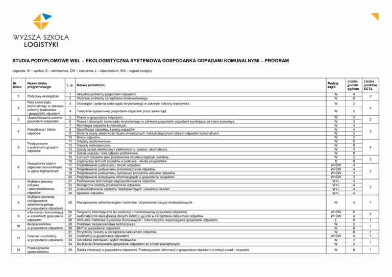 STUDIA PODYPLOMOWE WSL – EKOLOGISTYCZNA SYSTEMOWA GOSPODARKA ODPADAMI KOMUNALNYMI – PROGRAM Legenda: W – wykład, S – seminarium, ĆW – ćwiczenia, L – laboratorium, WS – wyjazd studyjny Nr bloku 1 2 3 Nazwa bloku programowego Podstawy ekologistyki Rola samorządu terytorialnego w zakresie ochrony środowiska i gospodarki odpadami Uwarunkowania prawne gospodarki odpadami 4 Klasyfikacja i bilans odpadów 5 Postępowanie z wybranymi grupami odpadów 6 Gospodarka stałymi odpadami komunalnymi w ujęciu logistycznym 7 8 9 10 Wybrane procesy odzysku i unieszkodliwiania odpadów Wybrane elementy postępowania administracyjnego w gospodarce odpadami Informacja i komunikacja w systemach gospodarki odpadami Bezpieczeństwo w gospodarce odpadami 11 Finanse i controlling w gospodarce odpadami 12 Przekazywanie społeczeństwu L. p. Nazwa przedmiotu Rodzaj zajęć Liczba godzin ogółem Liczba punktów ECTS 2 1 2 Aktualne problemy gospodarki odpadami. Wybrane problemy zarządzania środowiskowego. W W 4 6 3 Obowiązki i zadania samorządu terytorialnego w zakresie ochrony środowiska. W 2 4 Tworzenie systemowej gospodarki odpadami przez samorząd. W 2 5 6 7 8 9 10 11 12 13 14 15 16 17 18 19 20 21 22 23 24 Prawo w gospodarce odpadami. Prawa i obowiązki samorządu terytorialnego w zakresie gospodarki odpadami wynikające ze stanu prawnego. Morfologia odpadów komunalnych. Klasyfikacja odpadów, katalog odpadów. Kryteria oceny właściwości fizyko-chemicznych i toksykologicznych stałych odpadów komunalnych. Bilans odpadów. Odpady opakowaniowe. Odpady niebezpieczne. Zużyty sprzęt elektryczny i elektroniczny, baterie i akumulatory. Zużyte pojazdy i inne odpady problemowe. Łańcuch odpadów jako podstawowa struktura logistyki zwrotnej. Logistyczny łańcuch odpadów w praktyce - studia przypadków. Projektowanie podsystemu zbiórki odpadów. Projektowanie podsystemu przemieszczania odpadów. Projektowanie podsystemu dystrybucji produktów odzysku odpadów. Projektowanie przepływów informacyjnych w gospodarce odpadami. Podstawowe technologie zagospodarowania odpadów. Biologiczne metody przetwarzania odpadów. Unieszkodliwianie odpadów niebezpiecznych i likwidacja skażeń. Spalanie odpadów. W W W W W W W W W W W S W+ĆW W+ĆW W+ĆW W+ĆW W+L W+L W+L W+L 4 2 4 4 2 2 6 8 4 6 2 8 4 4 3 3 4 4 4 4 25 Postepowanie administracyjne i kontrolne. Uzyskiwanie decyzji środowiskowych. W 4 26 27 28 29 30 31 32 33 34 Programy informatyczne do ewidencji i monitorowania gospodarki odpadami. Automatyczna identyfikacja danych (AIDC) i jej rola w zarządzaniu łańcuchem odpadów. Wirtualna Platforma Systemów Biznesowych - informatyczne wspomaganie gospodarki odpadami. Podstawy bezpieczeństwa technicznego. BHP w gospodarce odpadami. Przychody i koszty w zarządzaniu łańcuchem odpadów. Controlling w gospodarce odpadami. Udzielanie zamówień i wybór dostawców. Możliwości finansowania gospodarki odpadami ze źródeł zewnętrznych. W+ĆW W+ĆW L W W W W+ĆW W W 6 4 8 2 6 6 4 2 2 35 Źródła informacji o gospodarce odpadami. Przekazywanie informacji o gospodarce odpadami w relacji urząd - obywatel. W 6 2 2 2 4 2 2 2 1 2 1 1 1 1 1 1 13 14 informacji o gospodarce odpadami Praktyczne doświadczenia dotyczące systemowej gospodarki odpadami 36 37 38 39 Funkcjonowanie Regionalnej Instalacji Przetwarzania Odpadów - wyjazd studyjny Funkcjonowanie Zakładu Zagospodarowania Odpadów i Punktów Selektywnej Zbiórki Odpadów - wyjazd studyjny Funkcjonowanie spalarni odpadów Gra zespołowa dotycząca gospodarki odpadami Seminarium dyplomowe 40 Seminarium dyplomowe WS WS WS ĆW 4 8 4 4 S 2 1 168 30 OGÓŁEM Warunki ukończenia studiów: 1. Zaliczenie (test, praca zaliczeniowa, inna forma wskazana przez prowadzącego zajęcia) wszystkich zajęć uwzględnionych w programie studiów. 2. Przygotowanie pracy dyplomowej i jej obrona podczas egzaminu dyplomowego. 2 1
