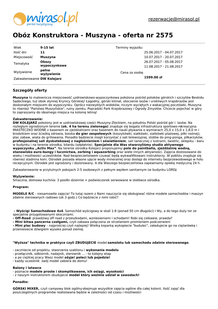 [email protected] Obóz Konstruktora - Muszyna - oferta nr 2575 Wiek 9-15 lat Ilość dni 11 Terminy wyjazdu: 25.06.2017 - 04.07.2017 Miejscowość Muszyna 10.07.2017 - 20.07.2017 Tematyka Obozy wypoczynkowe 26.07.2017 - 05.08.2017 Wyżywienie pełne wyżywienie 11.08.2017 - 21.08.2017 Cena za osobę Zakwaterowanie DW Kolejarz 1599.00 zł Szczegóły oferty Muszyna to malownicza miejscowość uzdrowiskowo-wypoczynkowa położona pośród potoków górskich i szczytów Beskidu Sądeckiego, tuż obok słynnej Krynicy Górskiej! Łagodny, górski klimat, otoczenie lasów i urokliwych krajobrazów jest doskonałym miejscem do wypoczynku. Oprócz niezwykłych widoków, niczym wyciętych z wakacyjnej pocztówki, Muszyna to również "Państwo Muszyńskie", ruiny zamku, Popradzki Park Krajobrazowy i Ogrody Zmysłów. Chcecie pojechać w góry to zapraszamy do idealnego miejsca na kolonię letnią! Zakwaterowanie: DW KOLEJARZ położony jest w uzdrowiskowej części Muszyny-Złockiem, na południu Polski pośród gór i lasów. Na rozległym ogrodzonym terenie (ok. 4 ha terenu zielonego) znajduje się bogata infrastruktura sportowo-rekreacyjna: MIASTECZKO WODNE z basenem ze zjeżdżalniami oraz basenem do nauki pływania o wymiarach 25,0 x 15,0 x 1,8,0 m i brodzikiem oraz ścieżką zdrowia, boiska do gier zespołowych (koszykówki, siatkówki, siatkówki plażowej, piłki nożnej), plac zabaw, wiata do grillowania. Ponadto będziecie mogli korzystać z sali telewizyjnej, stołów do ping-ponga, piłkarzyków, profesjonalnej sali dyskotekowej z nagłośnieniem i oświetleniem, sali tanecznej z lustrami, świetlic, sklepiku - baru w budynku i na terenie ośrodka, bilardu (odpłatnie). Specjalnie dla Was stworzyliśmy studio aktywnego wypoczynku „Activ Max”. Na terenie ośrodka Kolejarz proponujemy: pole do paintballa, zjeżdżalnię wodną, stanowisko euro-bungy i łucznictwa, zorbing i aquazorbing oraz wiele innych aktywności. Zajęcia dostosowane do wieku i możliwości uczestników. Nad bezpieczeństwem czuwać będą wykwalifikowani instruktorzy. W pobliżu znajduje się również stadnina koni. Ośrodek posiada własne ujęcie wody mineralnej oraz dostęp do internetu bezprzewodowego w holu recepcyjnym. Ośrodek jest ogrodzony i dozorowany. A dla Waszego bezpieczeństwa zapewniamy opiekę medyczną 24 h. Zakwaterowanie w przytulnych pokojach 2-5 osobowych z pełnym węzłem sanitarnym (w budynku LORD) . Wyżywienie: Smaczna, domowa kuchnia: 3 posiłki dziennie + podwieczorek serwowane w stołówce ośrodka. Program: MODELE R/C - niesamowite zajęcia! To tutaj razem z Nami nauczycie się obsługiwać różne modele samochodów i maszyn zdalnie sterowanych radiowo (ok 3 godz.) Co będziecie z nimi robić? - Wyścigi Samochodowe 4x4. Samochód wyścigowy w skali 1:8 (ponad 50 cm długości) i Wy, a do tego duży tor ze specjalnie przygotowanymi skoczniami. - Off-Road: prawdziwy off road z przeszkodami, wzniesieniami i schodami! Robi się ciekawie, prawda? - Mini bitwa pancerna czołgami, czyli zabawa połączona ze strzelaniem promieniem podczerwieni - Mini plac budowy - najprościej czyli najlepiej! Wielką koparką wykopiecie "budulec", załadujecie go na ciężarówkę i przeniesiecie dźwigiem wysoko ponad ziemię. "Wyższa" technika w praktyce czyli ZBUDUJECIE model samolotu lub samochodu zdalnie sterowanego. - zaczniecie od projektu, stworzenia szablonu i wykonania modelu przełącznik, odbiornik, nadajnik, sterownik ... - to kolejny etap a po ciężkiej pracy Wasz model ożyje! poleci lub pojedzie! każdy uczestnik swój model zabiera do domu! Balony i latawce - poznacie modele proste i skomplikowane, ich osiągi, wysokości - z naszym instruktorem zbudujecie model który weźmie udział w zawodach! Ponadto: GÓRSKI MIXER, czyli campowy blok ogólny obejmuje wszystkie zajęcia ogólne dla całej kolonii. Ilość zajęć dla poszczególnych programów realizowana będzie w zależności od czasu i możliwości WYCIECZKA AUTOKAROWA DO KRYNICY niepowtarzalna okazja aby: - poznać główne atrakcje Krynicy Górskiej (Park zdrojowy z Pijalnią Wód) - zdobyć najwyższe wzniesienie w mieście – Górę Parkową, ze szczytu którego, roztacza się przepiękna panorama Beskidu Sądeckiego, Beskidu Niskiego, a przy dobrej widoczności nawet Tatr. - na wszystkich czeka niespodzianka - „Rajska ślizgawka”, 2 super zjazdy torem bobslejowym w specjalnych saneczkach. MINI ACTIV PAKIET - euro-bun gy „podniebne szaleństwo”: akrobatyczne ewolucje i skoki powietrzne na specjalistycznej trampolinie z asekuracją. Nad bezpieczeństwem czuwać będzie wykwalifikowana obsługa. - przepychanie kuli zorbing: przypięci specjalnymi pasami wewnątrz kuli zorbing, będziecie „kulani” przez swoich kolegów/koleżanki - spodnie podwójne: oj będzie zabawa, będzie się działo... podczas wyścigu w podwójnych spodniach olbrzyma, w których utrudnieniem jest wspólna nogawka dla obu zawodników ;) - narty poczwórne: kilka osób na jednych nartach? Czemu nie! W tej konkurencji liczy się współpraca wszystkich członków grupy, bo bieg na 4-osobowych nartach to niezła gratka! - taśma wieloosobowa: zabawa przypominająca gąsienicę czołgu. Będąc w specjalnej gumowej taśmie, będziecie musieli dopasować tempo, aby się nie wywrócić i zwyciężyć. MIXER ROZMAITOŚCI - kąpiele na basenie - nocna gra terenowa z dreszczykiem -„Camp Muszyna pełen zagadek”: wcielicie się w postać detektywa i za pomocą wskazówek rozwiążecie zagadkę tajemniczego zniknięcia Kierownika obozu. - pocztówka z wakacji: każdy zrobi i wyślę własną pocztówkę z pozdrowieniami dla Rodziców, Dziadków lub Przyjaciela/Przyjaciółki - hand made i fabryka fantazji: dekoracje z pomysłem na prezenty, upominki i pamiątki z wakacji - teleturnieje: Mam Talent, Familiada, Kalambury i wiele innych - Campowe Kino pod Gwiazdami: ulubione filmy z nutką słodkości - wieczorna integracja przy ognisku z pieczen
