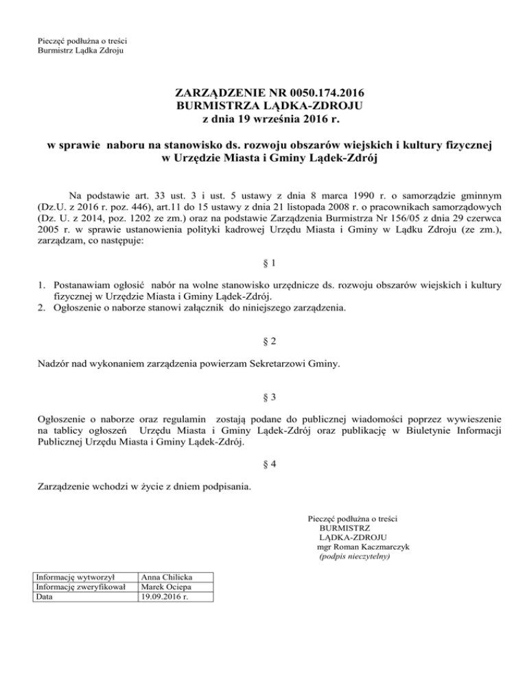 Pieczęć podłużna o treści Burmistrz Lądka Zdroju ądka Zdroju ZARZĄDZENIE NR 0050.174.2016 BURMISTRZA LĄDKA-ZDROJU z dnia 19 września 2016 r. w sprawie naboru na stanowisko ds. rozwoju obszarów wiejskich i kultury fizycznej w Urzędzie Miasta i Gminy Lądek-Zdrój Na podstawie art. 33 ust. 3 i ust. 5 ustawy z dnia 8 marca 1990 r. o samorządzie gminnym (Dz.U. z 2016 r. poz. 446), art.11 do 15 ustawy z dnia 21 listopada 2008 r. o pracownikach samorządowych (Dz. U. z 2014, poz. 1202 ze zm.) oraz na podstawie Zarządzenia Burmistrza Nr 156/05 z dnia 29 czerwca 2005 r. w sprawie ustanowienia polityki kadrowej Urzędu Miasta i Gminy w Lądku Zdroju (ze zm.), zarządzam, co następuje: §1 1. Postanawiam ogłosić nabór na wolne stanowisko urzędnicze ds. rozwoju obszarów wiejskich i kultury fizycznej w Urzędzie Miasta i Gminy Lądek-Zdrój. 2. Ogłoszenie o naborze stanowi załącznik do niniejszego zarządzenia. §2 Nadzór nad wykonaniem zarządzenia powierzam Sekretarzowi Gminy. §3 Ogłoszenie o naborze oraz regulamin zostają podane do publicznej wiadomości poprzez wywieszenie na tablicy ogłoszeń Urzędu Miasta i Gminy Lądek-Zdrój oraz publikację w Biuletynie Informacji Publicznej Urzędu Miasta i Gminy Lądek-Zdrój. §4 Zarządzenie wchodzi w życie z dniem podpisania. Pieczęć podłużna o treści BURMISTRZ LĄDKA-ZDROJU mgr Roman Kaczmarczyk (podpis nieczytelny) Informację wytworzył Informację zweryfikował Data Anna Chilicka Marek Ociepa 19.09.2016 r. Lądka-Zdroju RomaKaczmarczyk Załącznik do Zarządzenia nr 0050.174.2016 Burmistrza Lądka-Zdroju z dnia 19 września 2016 r. BURMISTRZ LĄDKA-ZDROJU OGŁASZA NABÓR NA WOLNE STANOWISKO URZĘDNICZE DS. ROZWOJU OBSZARÓW WIEJSKICH I KULTURY FIZYCZNEJ W URZĘDZIE MIASTA I GMINY LĄDEK-ZDRÓJ 1. Nazwa i adres jednostki: Urząd Miasta i Gminy Lądek-Zdrój ul. Rynek 31, 57-540 Lądek-Zdrój 2. Określenie stanowiska: stanowisko ds. rozwoju obszarów wiejskich i kultury fizycznej w Urzędzie Miasta i Gminy Lądek-Zdrój 3. Wymagania związane ze stanowiskiem - niezbędne: 1) Wykształcenie wyższe magisterskie lub inżynierskie; 2) Co najmniej 2 letni staż pracy (w ramach umowy o pracę lub prowadzonej działalności gosp.); 3) Dobry stan zdrowia pozwalający na zatrudnienie na stanowisku ds. rozwoju. obszarów wiejskich i kultury fizycznej; 4) Ukończony 18 rok życia i pełna zdolność do czynności prawnych oraz korzystanie w pełni z praw publicznych; 5) Niekaralność za przestępstwo ścigane z oskarżenia publicznego lub umyślne przestępstwo skarbowe; 6) Obywatelstwo polskie lub innego kraju Unii Europejskiej oraz obywatelstwo innego państwa, któremu na podstawie umów międzynarodowych lub przepisów prawa wspólnotowego przysługuje prawo do podjęcia zatrudnienia na terytorium RP (osoby nie będące obywatelami polskimi posiadające znajomość języka polskiego potwierdzoną dokumentem określonym w przepisach o służbie cywilnej); 7) Nieposzlakowana opinia. - dodatkowe: 1) Doświadczenie zawodowe związane z: pozyskiwaniem i rozliczaniem funduszów grantowych, prowadzeniem projektów ze środków Unii Europejskiej, współpracą z jednostkami administracji samorządowej; 2) Wykształcenie o kierunku : organizacja turystyki lub kultura fizyczna; 3) Znajomość i umiejętność praktycznego stosowania następujących przepisów: a) ustawa z dnia 11 lipca 2014 r. o zasadach realizacji programów w zakresie polityki spójności finansowanych w perspektywie finansowej 2014-2020 (Dz.U. z 2016, poz.217 ze zm.); b) ustawa z dnia 25 czerwca 2010 r. o sporcie. (Dz. U. z 2016 r. poz. 176 ze zm.); c) ustawa z dnia 18 stycznia 1996 r. o kulturze fizycznej. (Dz. U. z 2007 r. Nr 226, poz. 1675 ze zm.). d) ustawa z dnia 24 kwietnia 2003 r. o działalności pożytku publicznego i o wolontariacie. (Dz. U. z 2016 r. poz. 239 ze zm.). e) ustawa z dnia 29 stycznia 2004r. Prawo zamówień publicznych (Dz.U. z 2015 r., poz.2164 ze zm.); f) ustawa z dnia 8 marca 1990 r. o samorządzie gminnym (Dz. U. z 2016 r. poz.446 ze zm.); g) ustawa z dnia 27 sierpnia 2009 r. o finansach publicznych (Dz.U. z 2013 r., poz. 885 ze zm.); h) ustawa z dnia 29 sierpnia 1997 r. o ochronie danych osobowych (Dz.U. z 2016 r.,poz.922 ze zm.); i) ustawa z dnia 6 września 2001 r. o dostępie do informacji publicznej (Dz.U.z 2015r., poz.2058 ze zm.). 4) Znajomość zagadnień związanych z PROW 2014-2020 i funduszami grantowymi; 5) Znajomość zasad kwalifikowania wydatków na działania współfinansowane z funduszy unijnych i krajowych dokumentów programowych; 6) Znajomość zagadnień z zakresu projektów grantowych na każdym etapie; 7) Znajomość języka angielskiego lub niemieckiego w stopniu dobrym; 8) Bardzo dobra znajomość gminy Lądek-Zdrój; 2 9) Ukończone formy doskonalenia zawodowego z zakresu pozyskiwania funduszy zewnętrznych oraz kursy poświadczające dodatkowe umiejętności z zakresu obszarów wiejskich i kultury fizycznej 10) Umiejętności: obsługi komputera, w tym generatorów wniosków o dofinansowanie ze środków pozabudżetowych oraz wniosków o płatność, planowania, pracy w zespole, dzielenia się informacją, analizy i syntezy, szybkiego działania; 11) Pożądane cechy osobowościowe: odporność na stres, sumienność, dyspozycyjność, kreatywność, terminowość, samodzielność, wysoka kultura osobista, komunikatywność, swoboda w wystąpieniach publicznych; 12) Prawo jazdy kategorii „B” (preferowane posiadanie samochodu z możliwością używania do celów służbowych). 4. Zakres zadań wykonywanych na stanowisku: 1) Prowadzenie działań związanych z rozwojem obszarów wiejskich i mikroprojektów; 2) Opracowywanie programów, strategii, planów i wniosków związanych z rozwojem obszarów wiejskich, w tym realizacja inwestycji z udziałem środków zewnętrznych; 3) Analiza dostępnych programów i funduszy grantowych; 4) Samodzielne przygotowywanie, realizacja i rozliczanie wskazanych przez B