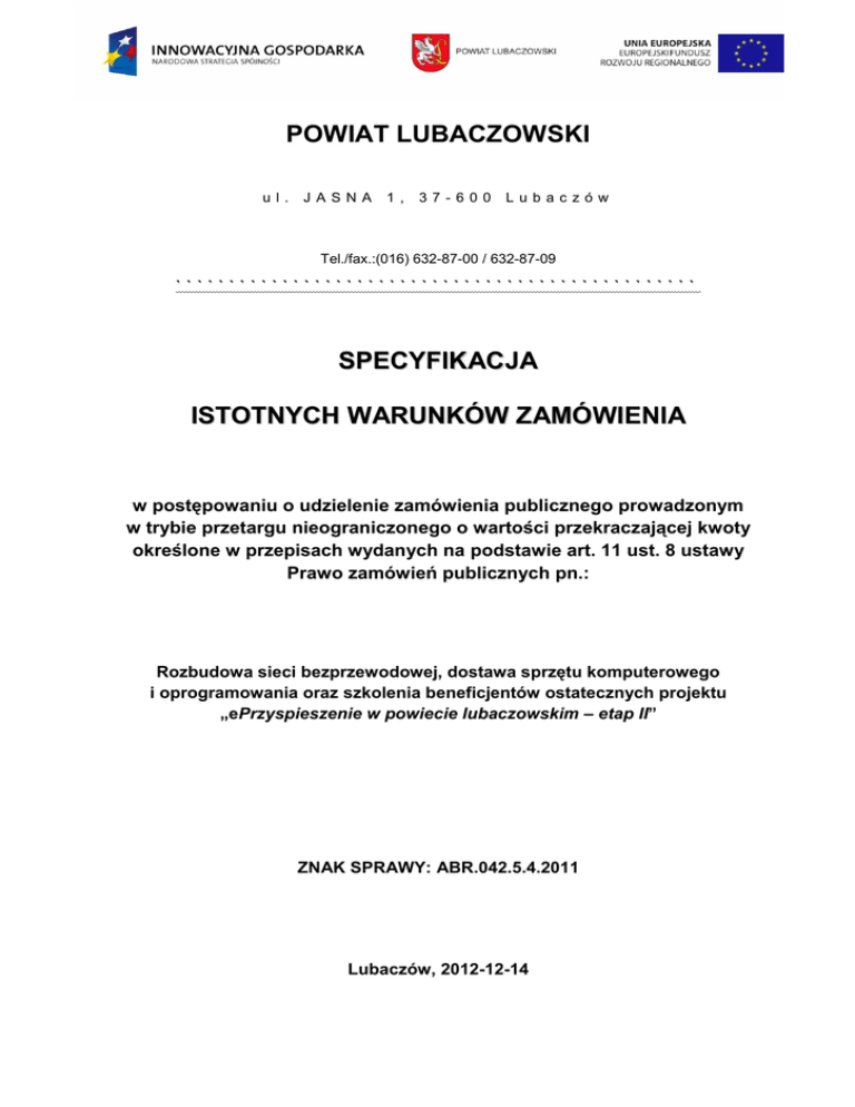 POWIAT LUBACZOWSKI ul. JASNA 1, 37-600 Lubaczów Tel./fax.:(016) 632-87-00 / 632-87-09 ````````````````````````````````````````````````` SPECYFIKACJA ISTOTNYCH WARUNKÓW ZAMÓWIENIA w postępowaniu o udzielenie zamówienia publicznego prowadzonym w trybie przetargu nieograniczonego o wartości przekraczającej kwoty określone w przepisach wydanych na podstawie art. 11 ust. 8 ustawy Prawo zamówień publicznych pn.: Rozbudowa sieci bezprzewodowej, dostawa sprzętu komputerowego i oprogramowania oraz szkolenia beneficjentów ostatecznych projektu „ePrzyspieszenie w powiecie lubaczowskim – etap II” ZNAK SPRAWY: ABR.042.5.4.2011 Lubaczów, 2012-12-14 SPECYFIKACJA ISTOTNYCH WARUNKÓW ZAMÓWIENIA (zwana dalej SIWZ) Zgodnie z ustawą z dnia 29 stycznia 2004 roku – Prawo zamówień publicznych (Dz. U. z 2010 r. Nr 113, poz. 759 z późn zm.) zwaną w dalszej części SIWZ „ustawą” i aktami wykonawczymi wydanymi na jej podstawie oraz innymi aktami prawnymi. I. Zamawiający: POWIAT LUBACZOWSKI ul. Jasna 1 37-600 Lubaczów nr tel. (0....16) 632-87-00 nr fax (0....16) 632-87-09 zaprasza do składania ofert w ramach postępowania prowadzonego w trybie przetargu nieograniczonego o wartości szacunkowej wartości przekraczającej kwoty w przepisach wydanych na podstawie art. 11 ust. 8 ustawy Prawo zamówień publicznych. II. Opis przedmiotu zamówienia 1. Przedmiotem zamówienia jest rozbudowa sieci bezprzewodowej, dostawa sprzętu komputerowego i oprogramowania oraz szkolenia beneficjentów ostatecznych projektu „ePrzyspieszenie w powiecie lubaczowskim – etap II”, na którą składa się: 1) Przygotowanie dokumentacji projektowej, harmonogramu prac oraz innej niezbędnej dokumentacji: a. Opracowanie projektu telekomunikacyjnego sieci szerokopasmowej, b. Opracowanie projektów budowlanych w zakresie budowy min. 1 wieży telekomunikacyjnej (branża konstrukcyjna i elektryczna) - lub więcej, jeśli tak będzie wynikać z projektu telekomunikacyjnego sporządzonego przez wykonawcę, c. Uzyskanie niezbędnych pozwoleń na budowę dla zaprojektowanej wieży telekomunikacyjnej (lub wież) masztów i wież, d. Inne konieczne dokumenty dla procesu administracyjnego PnB (m.in. wystąpienie do DWL i ULC, decyzje środowiskowe) - jeśli obiekty, których dotyczą odpowiednie wymagania wystąpią w projekcie sporządzonym przez wykonawcę (projekt telekomunikacyjny), 2) Budowa wieży telekomunikacyjnej (min. 1 szt.) 3) Budowa sieci szerokopasmowej, dostępu do Internetu z wykorzystaniem technologii bezprzewodowych - budowa minimum 5 węzłów dostępowych opartych o technologię WIMAX w częstotliwości z zakresu 3400 - 3600 MHz zgodnie z rezerwacją kanałów dokonaną przez Zamawiającego. 4) Budowa i uruchomienie infrastruktury sieci bezprzewodowej. 2 5) Wyposażenie i uruchomienie centrum zarządzania siecią (w tym wdrożenie systemu zarządzania siecią). 6) Opracowanie dokumentacji powykonawczej. 7) Instalacja i uruchomienie min. 200 urządzeń odbiorczych sieci bezprzewodowej. 8) Dostawa 100 zestawów komputerowych dla beneficjentów ostatecznych projektu. 9) Wyposażenie w sprzęt i uruchomienie 4 punktów publicznego dostępu do Internetu w jednostkach podległych Zamawiającego. 10) Przeprowadzenie szkoleń dla beneficjentów ostatecznych projektu. 11) Usługi serwisowania systemu sieci szerokopasmowej w okresie 2 lat. 12) Wsparcie techniczne i obsługa serwisowa urządzeń u beneficjentów ostatecznych w okresie 2 lat. 2. Szczegółowy opis i zakres robót budowlanych przewidzianych do wykonania w ramach zamówienia zawiera załącznik nr 9 do SIWZ. 3. Zamówienie jest współfinansowane ze środków Unii Europejskiej z Europejskiego Funduszu Rozwoju Regionalnego w ramach Programu Operacyjnego Innowacyjna Gospodarka, Oś priorytetowa 8. Społeczeństwo informacyjne – zwiększenie innowacyjności gospodarki, Działanie 8.3. Przeciwdziałanie wykluczeniu cyfrowemu - eInclusion. 4. Opis przedmiotu zamówienia wg Wspólnego Słownika Zamówień (CPV): CPV 71320000-7 - (Usługi inżynieryjne w zakresie projektowania) CPV 45100000-8 - (Przygotowanie terenu pod budowę) CPV 45232330-4 - (Wznoszenie masztów antenowych) CPV 44212200-1 - (Wieże, maszty kratowe, półmaszty i słupy stalowe) CPV 32260000-3 - (Urządzenia do przesyłu danych) CPV 32581000-9 - (Sprzęt do przesyłu danych) CPV 32571000-6 - (Infrastruktura komunikacyjna) CPV 32424000-1 - (Infrastruktura sieciowa) CPV 32523000-5 - (Urządzenia telekomunikacyjne) CPV 31682530-4 - (Awaryjne urządzenia energetyczne) CPV 31681400-7 - (Elektryczne elementy składowe) CPV 32420000-3 - (Urządzenia sieciowe) CPV 45312330-9 - (Montaż anten radiowych) CPV 45232332-8 - (Telekomunikacyjne roboty dodatkowe) CPV 45314000-1 - (Instalowanie urządzeń telekomunikacyjnych) CPV 32571000-6 - (Infrastruktura komunikacyjna) CPV 45310000-1 - (Roboty w zakresie instalacji elektrycznej) CPV 51300000-5 - (Usługi instalowania urządzeń komunikacyjnych) CPV 32422000-7 - (Elementy składowe sieci) CPV 32412110-8 - (Sieć internetowa) CPV 32418000-6 - (Sieć radiowa) CPV 48200000-0 - (Pakiet oprogramowania dla sieci, internetu i intranetu) CPV 45300000-0 - (Wykonywanie instalacji budowlanych) CPV 45400000-1 - (Roboty wykończeniowe w zakresie obiektów budowlanych) CPV 71317200-5 - (Usługi w zakresie ochrony zdrowia i bezpieczeństwa) CPV 50330000-7 - (Usługi w zakresie konserwacji sprzętu telekomunikacyjnego) CPV 50332000-1 - (Usługi w zakresie konserwacji infrastruktury telekomunikacyjnej) CPV 72700000-7 - (Usługi w zakresie sieci komputerowej) CPV 72720000-3 – (Usługi w zakresie rozległej sieci komputerowej) 3 CPV 72611000-6 – (Usługi w zakresie wsparcia technicznego) CPV 30213100-5 – (Komputery osobiste) CPV 80500000-9 – (Usługi szkoleniowe) CPV 80533100-0 – (Usługi szkolenia komputerowego) III. Termin wykonania zamówienia Termin wykonania zamówienia – do dnia 31.07.2015r., w tym termin realizacji etapów zamówienia: eta