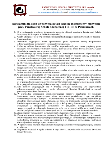 PAŃSTWOWA SZKOŁA MUZYCZNA I i II stopnia 95-200 PABIANICE, ul. Grobelna 6 tel./fax: (042) 215 55 39 www.muzyczna.pabianice.pl e-mail: [email protected] Regulamin dla osób wypożyczających szkolne instrumenty muzyczne przy Państwowej Szkole Muzycznej I i II st. w Pabianicach 1. O wypożyczenie szkolnego instrumentu mogą się ubiegać uczniowie Państwowej Szkoły Muzycznej I i II stopnia w Pabianicach (aneks*). 2. Osoby ubiegające się o wypożyczenie instrumentu składają do administracji szkoły podanie kwestionariusz. 3. Instrument wypożycza osoba upoważniona przez dyrektora szkoły bezpośrednio odpowiedzialna za instrumenty - po rozpatrzeniu podania. 4. Podstawą odbioru instrumentu dla uczniów niepełnoletnich jest rewers podpisany przez rodziców lub prawnych opiekunów ucznia, poświadczony przez dwóch żyrantów. Uczeń pełnoletni występuje sam we własnym imieniu. 5. Żyrantami mogą być osoby dorosłe niebędące w I stopniu pokrewieństwa z użytkownikiem. 6. Instrument zostaje wypożyczony na pełny okres nauki w tutejszej szkole, jednakże na życzenie szkoły wypożyczający zobowiązany jest zwrócić instrument. 7. Wymiana instrumentu na większy (dotyczy instrumentów smyczkowych) lub wyższej klasy (z fabrycznego na lutniczy) wymaga zawarcia nowej umowy. 8. Instrument podlega zwrotowi natychmiast po zakończeniu nauki w szkole lub w przypadku rezygnacji ucznia z dalszej nauki w szkole. 9. Instrument może być uczniowi odebrany w przypadku niewywiązywania się z obowiązków wobec szkoły lub obniżenia wyników w nauce. 10. O uszkodzeniu instrumentu lub wyposażenia użytkownik winien natychmiast zawiadomić osobę bezpośrednio odpowiedzialną za instrumenty, która w porozumieniu z dyrektorem szkoły i kierownikiem sekcji zdecyduje o sposobie naprawy i odpłatności: a) w przypadkach niezawinionych przez użytkownika koszt naprawy może ponieść szkoła, b) w przypadkach zawinionych koszt naprawy ponosi użytkownik. 11. Dla uczniów znajdujących się w trudnej sytuacji materialnej (po odpowiednim udokumentowaniu), w/w koszty może sfinansować Komitet Rodzicielski w ramach posiadanych środków finansowych. 12. W przypadku uszkodzenia uniemożliwiającego naprawę, zagubienia lub kradzieży instrumentu osoba wypożyczająca winna natychmiast powiadomić o tym na piśmie administrację szkoły i odkupić - w porozumieniu ze szkołą - analogiczny instrument po aktualnie obowiązującej cenie. Zamiennego przyjęcia instrumentu dokona protokolarnie komisja wyznaczona przez dyrektora szkoły, z którą należy konsultować się w sprawach związanych z odkupieniem instrumentu. W przypadku niewypłacalności osoby wypożyczającej, w odkupieniu instrumentu będą partycypować solidarnie żyranci, którzy swoimi podpisami na rewersie zobowiązali się do rzeczowego zwrotu instrumentu szkole. 13. Za zniszczony lub zaginiony instrument nie będą przyjmowane wpłaty gotówkowe. 14. Zwrot instrumentu następuje na podstawie danych identyfikacyjnych opisanych w rewersie. Po stwierdzeniu przez nauczyciela przedmiotu głównego, że instrument jest kompletny i nie uszkodzony, przyjmuje go osoba upoważniona i w obecności zwracającego instrument dokonuje odpowiedniego wpisu na rewersie. 15. W sprawach nie objętych regulaminem stosuje się aktualnie obowiązujące przepisy kodeksu cywilnego. 16. Regulamin wchodzi w życie z dniem 8 maja 1997 r. na podstawie zarządzenia Dyrektora Szkoły Nr 7/97. PAŃSTWOWA SZKOŁA MUZYCZNA I i II stopnia 95-200 PABIANICE, ul. Grobelna 6 tel./fax: (042) 215 55 39 www.muzyczna.pabianice.pl e-mail: [email protected] *ANEKS Nr 3 DO REGULAMINU dla osób wypożyczających instrumenty muzyczne 1. Otrzymuje brzmienie: O wypożyczenie szkolnego instrumentu mogą się ubiegać uczniowie Państwowej Szkoły Muzycznej I i II stopnia w Pabianicach. W szczególnych przypadkach: a) Uczniowie Towarzystwa Muzycznego im. Karola Nicze - za zgodą Dyrektora Szkoły b) Uczniowie innych szkół muzycznych na wniosek Dyrekcji macierzystej Szkoły - za zgodą Dyrektora Szkoły Wprowadza się opłaty za użytkowanie wypożyczonych instrumentów w wysokości: a) dla uczniów szkoły - 10 zł miesięcznie, b) dla uczniów Towarzystwa Muzycznego im. Karola Nicze - kwota zadeklarowana przez wypożyczającego, nie mniej niż w punkcie a), c) dla uczniów innych szkół muzycznych - w wysokości podwójnej stawki wskazanej w punkcie a). Aneks został wprowadzony w życie 1 września 2010 roku /- /Dyrektor Szkoły.