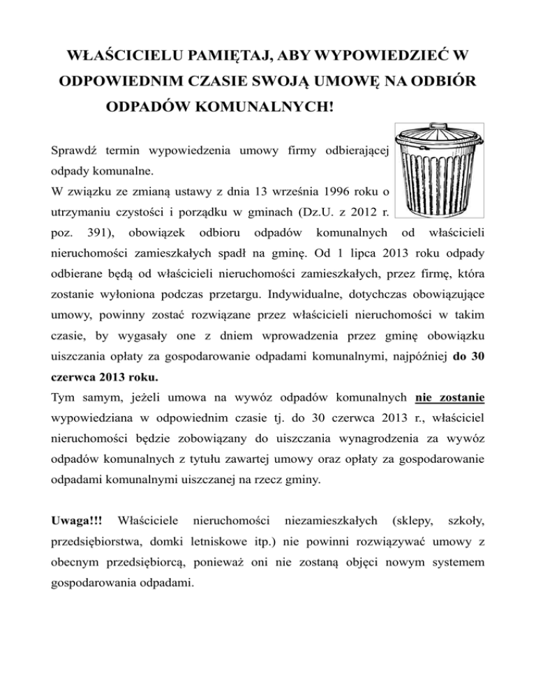 WŁAŚCICIELU PAMIĘTAJ, ABY WYPOWIEDZIEĆ W ODPOWIEDNIM CZASIE SWOJĄ UMOWĘ NA ODBIÓR ODPADÓW KOMUNALNYCH! Sprawdź termin wypowiedzenia umowy firmy odbierającej odpady komunalne. W związku ze zmianą ustawy z dnia 13 września 1996 roku o utrzymaniu czystości i porządku w gminach (Dz.U. z 2012 r. poz. 391), obowiązek odbioru odpadów komunalnych od właścicieli nieruchomości zamieszkałych spadł na gminę. Od 1 lipca 2013 roku odpady odbierane będą od właścicieli nieruchomości zamieszkałych, przez firmę, która zostanie wyłoniona podczas przetargu. Indywidualne, dotychczas obowiązujące umowy, powinny zostać rozwiązane przez właścicieli nieruchomości w takim czasie, by wygasały one z dniem wprowadzenia przez gminę obowiązku uiszczania opłaty za gospodarowanie odpadami komunalnymi, najpóźniej do 30 czerwca 2013 roku. Tym samym, jeżeli umowa na wywóz odpadów komunalnych nie zostanie wypowiedziana w odpowiednim czasie tj. do 30 czerwca 2013 r., właściciel nieruchomości będzie zobowiązany do uiszczania wynagrodzenia za wywóz odpadów komunalnych z tytułu zawartej umowy oraz opłaty za gospodarowanie odpadami komunalnymi uiszczanej na rzecz gminy. Uwaga!!! Właściciele nieruchomości niezamieszkałych (sklepy, szkoły, przedsiębiorstwa, domki letniskowe itp.) nie powinni rozwiązywać umowy z obecnym przedsiębiorcą, ponieważ oni nie zostaną objęci nowym systemem gospodarowania odpadami.