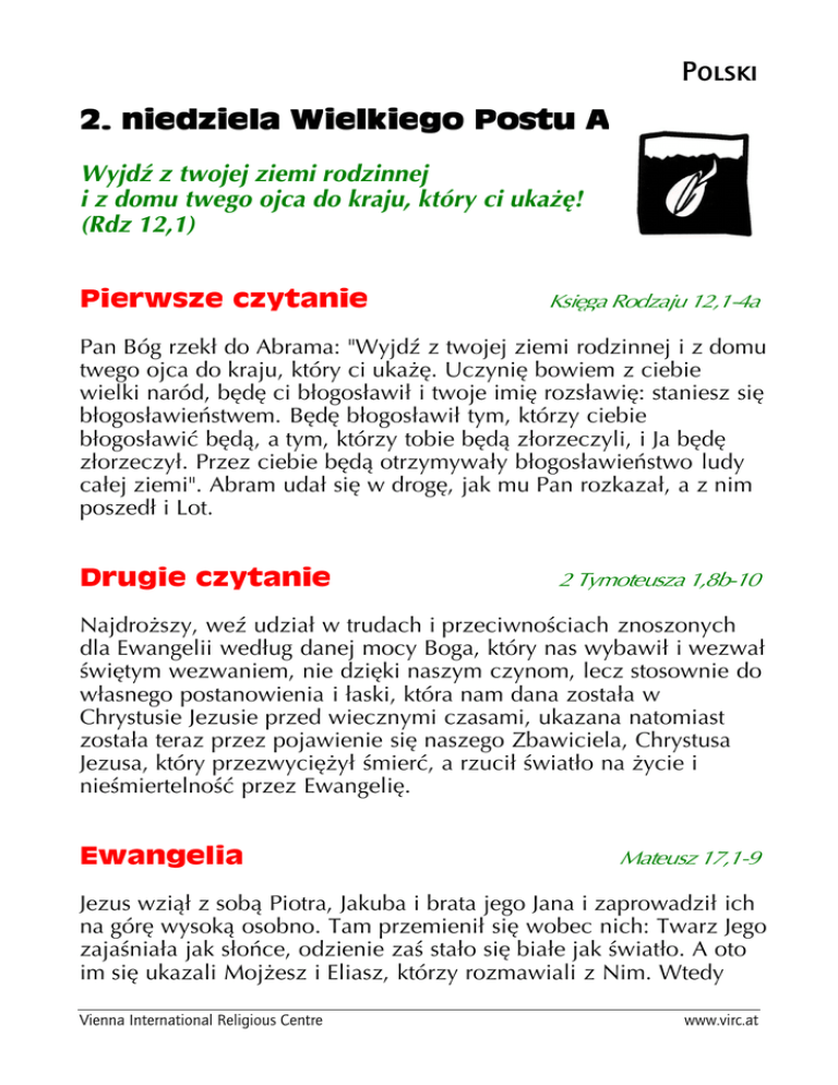 Polski Wyjdź z twojej ziemi rodzinnej i z domu twego ojca do kraju, który ci ukażę! (Rdz 12,1) Pan Bóg rzekł do Abrama: "Wyjdź z twojej ziemi rodzinnej i z domu twego ojca do kraju, który ci ukażę. Uczynię bowiem z ciebie wielki naród, będę ci błogosławił i twoje imię rozsławię: staniesz się błogosławieństwem. Będę błogosławił tym, którzy ciebie błogosławić będą, a tym, którzy tobie będą złorzeczyli, i Ja będę złorzeczył. Przez ciebie będą otrzymywały błogosławieństwo ludy całej ziemi". Abram udał się w drogę, jak mu Pan rozkazał, a z nim poszedł i Lot. Najdroższy, weź udział w trudach i przeciwnościach znoszonych dla Ewangelii według danej mocy Boga, który nas wybawił i wezwał świętym wezwaniem, nie dzięki naszym czynom, lecz stosownie do własnego postanowienia i łaski, która nam dana została w Chrystusie Jezusie przed wiecznymi czasami, ukazana natomiast została teraz przez pojawienie się naszego Zbawiciela, Chrystusa Jezusa, który przezwyciężył śmierć, a rzucił światło na życie i nieśmiertelność przez Ewangelię. Jezus wziął z sobą Piotra, Jakuba i brata jego Jana i zaprowadził ich na górę wysoką osobno. Tam przemienił się wobec nich: Twarz Jego zajaśniała jak słońce, odzienie zaś stało się białe jak światło. A oto im się ukazali Mojżesz i Eliasz, którzy rozmawiali z Nim. Wtedy Vienna International Religious Centre www.virc.at Piotr rzekł do Jezusa: "Panie, dobrze, że tu jesteśmy; jeśli chcesz, postawię tu trzy namioty: jeden dla Ciebie, jeden dla Mojżesza i jeden dla Eliasza". Gdy on jeszcze mówił, oto obłok świetlany osłonił ich, a z obłoku odezwał się głos: "To jest mój Syn umiłowany, w którym mam upodobanie, Jego słuchajcie". Uczniowie, słysząc to, upadli na twarz i bardzo się zlękli. A Jezus zbliżył się do nich, dotknął ich i rzekł: "Wstańcie, nie lękajcie się". Gdy podnieśli oczy, nikogo nie widzieli, tylko samego Jezusa. A gdy schodzili z góry, Jezus przykazał im, mówiąc: "Nie opowiadajcie nikomu o tym widzeniu, aż Syn Człowieczy zmartwychwstanie". W trakcie drugiego etapu przygotowania do Wielkanocy spotykamy na górze przemieniającego się Jezusa. Również w tym przypadku mniej chodzi o sprawozdanie z wydarzenia, a bardziej o obraz, który należy oglądać oczyma wiary. Dane nam jest rzucić krótkie spojrzenie w ten cudowny boski świat, który jest całkiem blisko, a zarazem bardzo daleko. Przed kilkoma dniami Jezus zapowiedział uczniom swoje cierpienie oraz rolę, którą będą w nim odgrywać. Teraz pozwala im wziąć udział w swoim przemienieniu. Wydaje się, jakoby miał na względzie wzmocnienie wiary trzech Apostołów, którzy będą bezpośrednimi świadkami Jego krwawego potu w Ogrodzie Oliwnym. Na górze widzą Jezusa po raz pierwszy takim, jakim on się stanie. Jego ludzkie, dotknięte cieniem śmierci, oblicze promieniuje, na krótki moment, jasnością świętości Wielkanocy. Jasność jednak jest zbyt piękna, aby przy niej pozostać, nawet wówczas, gdy Piotr próbuje ją zatrzymać. Nie jest ona ani udziałem w przyszłej chwale, ani przedmiotem nadziei. Obok przemienionego Jezusa stoją Mojżesz i Eliasz; obie wielkie postacie Starego Przymierza wyrażają przez swoją obecność to, że pojawił się ostatni wielki, długo oczekiwany Prorok, któremu bliskie są czasy ostateczne. Również Bóg Ojciec jest obecny w świecącej chmurze, a Jego głos odkrywa, jak to było przy chrzcie, tajemnicę tego Jezusa z Nazaretu: "to jest mój Syn umiłowany, którego miłuję; Jego powinniście słuchać!" Słuchać – oznacza: przyjąć poważnie Jego naukę, nawet wówczas, gdy ona wyrywa nas z dotychczasowych ram; dopuścić i przyjąć ścisły związek między cierpieniem i chwałą, między słabością i mocą, między śmiercią i zmartwychwstaniem. Uczniowie wzmocnieni doświadczeniem wiary przez krótki blask wspaniałości, powracają na równinę, aby kontynuować drogę służby, wpatrując się w przykład Jezusa. Wkrótce przemienione oblicze zostanie ponownie zakryte ciemnością krzyża: na krzyżu nic z tego nie będzie widoczne i według wszelkich objawów nie pozostaje żadna nadzieja. Jednakże światło nie było złudzeniem, a przemienienie marzeniem. Ze śmierci powstanie nowe życie – dla Jezusa i również dla nas. Vienna International Religious Centre [email protected]