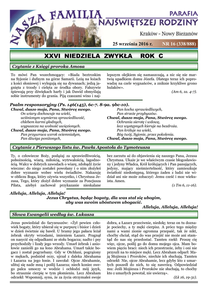 25 września 2016 r. XXVI NIEDZIELA ZWYKŁA NR 16 (338/888) ROK C Czytanie z Księgi proroka Amosa To mówi Pan wszechmogący: «Biada beztroskim na Syjonie i dufnym na górze Samarii. Leżą na łożach z kości słoniowej i wylegują się na dywanach; jedzą jagnięta z trzody i cielęta ze środka obory. Fałszywie śpiewają przy dźwiękach harfy i jak Dawid obmyślają sobie instrumenty do grania. Piją czaszami wino i naj- lepszym olejkiem się namaszczają, a nic się nie martwią upadkiem domu Józefa. Dlatego teraz ich poprowadzę na czele wygnańców, a zniknie krzykliwe grono hulaków». (Am 6, 1a. 4-7). Psalm responsoryjny (Ps. 146(145), 6c-7. 8-9a. 9bc-10). Chwal, duszo moja, Pana, Stwórcę swego. On wiary dochowuje na wieki, uciśnionym wymierza sprawiedliwość, chlebem karmi głodnych, wypuszcza na wolność uwięzionych. Chwal, duszo moja, Pana, Stwórcę swego. Pan przywraca wzrok ociemniałym, Pan dźwiga poniżonych, Pan kocha sprawiedliwych, Pan strzeże przybyszów. Chwal, duszo moja, Pana, Stwórcę swego. Ochrania sierotę i wdowę, lecz występnych kieruje na bezdroża. Pan króluje na wieki, Bóg twój, Syjonie, przez pokolenia. Chwal, duszo moja, Pana, Stwórcę swego. Czytanie z Pierwszego listu św. Pawła Apostoła do Tymoteusza Ty, o człowiecze Boży, podążaj za sprawiedliwością, pobożnością, wiarą, miłością, wytrwałością, łagodnością. Walcz w dobrych zawodach o wiarę, zdobądź życie wieczne: do niego zostałeś powołany i o nim złożyłeś dobre wyznanie wobec wielu świadków. Nakazuję w obliczu Boga, który ożywia wszystko, i Chrystusa Jezusa, Tego, który złożył dobre wyznanie za Poncjusza Piłata, ażebyś zachował przykazanie nieskalane bez zarzutu aż do objawienia się naszego Pana, Jezusa Chrystusa. Ukaże je we właściwym czasie błogosławiony i jedyny Władca, Król królujących i Pan panujących, jedyny, mający nieśmiertelność, który zamieszkuje światłość niedostępną, którego żaden z ludzi nie widział ani nie może zobaczyć: Jemu cześć i moc wiekuista. Amen. (1 Tm 6, 11-16). Alleluja, Alleluja, Alleluja! Jezus Chrystus, będąc bogaty, dla was stał się ubogim, aby was swoim ubóstwem ubogacić. Alleluja, Alleluja, Alleluja! Słowa Ewangelii według św. Łukasza Jezus powiedział do faryzeuszów: «Żył pewien człowiek bogaty, który ubierał się w purpurę i bisior i dzień w dzień świetnie się bawił. U bramy jego pałacu leżał żebrak okryty wrzodami, imieniem Łazarz. Pragnął on nasycić się odpadkami ze stołu bogacza; nadto i psy przychodziły i lizały jego wrzody. Umarł żebrak i aniołowie zanieśli go na łono Abrahama. Umarł także bogacz i został pogrzebany. Gdy w Otchłani, pogrążony w mękach, podniósł oczy, ujrzał z daleka Abrahama i Łazarza na jego łonie. I zawołał: Ojcze Abrahamie, ulituj się nade mną i poślij Łazarza; niech koniec swego palca umoczy w wodzie i ochłodzi mój język, bo strasznie cierpię w tym płomieniu. Lecz Abraham odrzekł: Wspomnij, synu, że za życia otrzymałeś swoje dobra, a Łazarz przeciwnie, niedolę; teraz on tu doznaje pociechy, a ty męki cierpisz. A prócz tego między nami a wami zionie ogromna przepaść, tak że nikt, choćby chciał, stąd do was przejść nie może ani stamtąd do nas się przedostać. Tamten rzekł: Proszę cię więc, ojcze, poślij go do domu mojego ojca. Mam bowiem pięciu braci: niech ich przestrzeże, żeby i oni nie przyszli na to miejsce męki. Lecz Abraham odparł: Mają Mojżesza i Proroków, niechże ich słuchają. Tamten odrzekł: Nie, ojcze Abrahamie, lecz gdyby kto z umarłych poszedł do nich, to się nawrócą. Odpowiedział mu: Jeśli Mojżesza i Proroków nie słuchają, to choćby kto z umarłych powstał, nie uwierzą». (Łk 16, 19-31). 2 NASZA FAMILIA, 25 września 2016 r., Nr 16 ZMIANA MODERATORA KRĘGÓW RODZIN W NOWYM BIEŻANOWIE Tak to już jest w kręgowej pracy formacyjnej, że co kilka lat trzeba nam żegnać naszego księdza Moderatora i witać nowego kapłana, który decyduje się na pracę z rodzinami (lub któremu taka posługa zostaje przydzielona). Patrząc wstecz, taki wspólny czas był niekiedy dłuższy (zdarzyło się i szczęśliwe 7 lat!), a czasem bardzo krótki, bo nawet jednoroczny, ale dziwnie mocno przeżyty i serdecznie zapamiętany. Tego lata, w sierpniu, żegnaliśmy ks. Janusza Kozioła, który pracował z bieżanowskimi kręgami przez 5 lat i był jednocześnie Moderatorem Rejonowym, czyli jeszcze poza naszą parafią pracował także z kręgami w parafii w Nowym Prokocimiu, na Rżące, w Niegowici, Niepołomicach i Kłaju. Szybko minęły te lata, przepłynęły w rzece zdarzeń i wspólnych przeżyć – głównie były to miesięczne spotkania kręgowe, kilkanaście diakonii, wspólne Eucharystie, opłatki, spotkanie wielkanocne, wyjazd do Gliczarowa i posługa na tematycznych rekolekcjach. Ks. Janusz poza pracą z rodzinami był szkolnym katechetą, przygotowywał dzieci do I Komunii Świętej, a poza duszpasterstwem także studiował, prowadził poradGliczarów 2012 r. nictwo psychologiczne ... i tort urodzinowy i ... namiętnie biegał! Każda zapowiedź zmiany kapłana - opiekuna niesie ze sobą jakiś cień smutku, że coś się kończy, że nie będzie już okazji lepiej się poznać nawzajem, że nie dojdzie już Z Parą Rejonową - czerwiec 2015 r. do skutku takie, czy inne planowane spotkanie lub wyjazd. Niesie też ze sobą niepokój, czy nowo przybyły ksiądz w nawale parafialnych obowiązków będzie mógł jeszcze przejąć pracę z rodzinami? A nam przecież tak bardzo potrzeba kapłana, Błogosławieństwo nowego Kręgu - styczeń 2014 r. kogoś, kto rozumie i czuje charyzmat naszego ruchu, kto zdaje sobie sprawę – jak O. Blachnicki – że wzajemne oddziaływanie dwóch sakramentów: kapłaństwa i małżeństwa jest bogatym źródłem łask, niesłychanie ubogaca obie strony, wiele uczy, rodzinom pomaga inaczej postrze