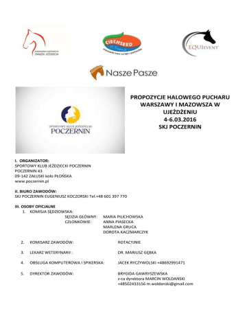 PROPOZYCJE HALOWEGO PUCHARU WARSZAWY I MAZOWSZA W UJEŻDŻENIU 4-6.03.2016 SKJ POCZERNIN I. ORGANIZATOR: SPORTOWY KLUB JEŹDZIECKI POCZERNIN POCZERNIN 43 09-142 ZAŁUSKI koło PŁOŃSKA www.poczernin.pl II. BIURO ZAWODÓW: SKJ POCZERNIN EUGENIUSZ KOCZORSKI Tel.+48 601 397 770 III. OSOBY OFICJALNE 1. KOMISJA SĘDZIOWSKA: SĘDZIA GŁÓWNY: CZŁONKOWIE: MARIA PILICHOWSKA ANNA PIASECKA MARLENA GRUCA DOROTA KACZMARCZYK 2. KOMISARZ ZAWODÓW: ROTACYJNIE 3. LEKARZ WETERYNARII : DR. MARIUSZ GĘBKA 4. OBSŁUGA KOMPUTEROWA I SPIKERSKA: JACEK RYCZYWOLSKI +48692991471 5. DYREKTOR ZAWODÓW: BRYGIDA GAWRYSZEWSKA z-ca dyrektora MARCIN WOLDAŃSKI +48502433156 [email protected] IV. WARUNKI OGÓLNE - Regulamin rozgrywania Mistrzostw Warszawy i Mazowsza oraz Halowego Pucharu Warszawy i Mazowsza - Przepisy Ogólne PZJ - Przepisy Weterynaryjne PZJ - Przepisy antydopingowe i kontroli leczenia koni PZJ - Przepisy Dyscypliny Ujeżdżenia - Regulamin Rozgrywania Krajowych Zawodów w Ujeżdżeniu - Nagrody rzeczowe będą przyznawane za każdy konkurs, bezpośrednio po jego zakończeniu. Obowiązuje łączna klasyfikacja zawodników startujących w danym konkursie w ramach ZR i HPWiM - Zawodnicy startujący w ramach ZR nie będą klasyfikowani w ramach rund HPWiM - Zawodników startujących w ZR obowiązuje Regulamin i zasady HPWiM - Zawodnicy chcący wystartować w programach dowolnych w ramach ZR muszą uzyskać minimum 60% w jednym z konkursów kwalifikacyjnych. Konkursami kwalifikacyjnymi są konkursy zarówno pierwszego i drugiego dnia - W HPWiM AMATORÓW mają prawo startu zawodnicy nie posiadający obecnie ani w przeszłości licencji sportowej A (zawody towarzyskie) V. ZGŁOSZENIA: - Wyłącznie na oficjalnych drukach pzj na adres: [email protected] - W zgłoszeniu należy podać rangę zawodów: HPWiM, ZR, ZT - Do zgłoszenia należy dołączyć potwierdzenie wniesienia opłaty za boksy z informacją o planowanym terminie przyjazdu - Informację o potrzebie zapewnienia podłączenia prądu dla koniowozu - Termin zgłoszeń ostatecznych 29.02.2016 - Obowiązują numerki startowe VI. BOKSY Organizator dysponuje ograniczoną ilością boksów. Decyduje kolejność zgłoszeń. Pierwszeństwo dla uczestników Halowego Pucharu Warszawy i Mazowsza. VII. OPŁATY: - Wpisowe: 300 pln za rundę HPWiM od pary 300 pln za trzy konkursy w Zawodach Regionalnych od pary, 120 pln pojedynczy konkurs - Boksy: w stajni polowej, murowanej, angielskie w cenie 300 pln za całe zawody (boksy gotowe będą od czwartku od godziny 10:00). Boks za jeden dzień zawodów 100pln. Organizator zapewnia pierwszą ściółkę (słoma). Prosimy pamiętać o zabraniu wiader i żłobów. - Istnieje możliwość dokupienia na miejscu: słomy (10 pln), siana (15 pln). - Podłączenie koniowozu do prądu 100 pln za całe zawody (prosimy zaznaczyć w zgłoszeniu potrzebę podłączenia koniowozu). Opłaty na nr rachunku bankowego: 85 8241 0009 0008 9715 2000 0001 Poczernin 43 09-142 Załuski koło Płońska VIII. ŚWIADCZENIA DODATKOWE I TOWARZYSZĄCE: - Przez cały czas trwania zawodów czynna będzie restauracja na terenie zawodów. IX. SPRAWY WETERYNARYJNE: Szczepienia ochronne przeciwko grypie koni. Obowiązuje następujący schemat szczepień: A) szczepienie podstawowe: -pierwsze szczepienie – w dniu rozpoczęcia szczepień -drugie szczepienie – nie wcześniej niż 21-go dnia i nie później niż 92 dnia od pierwszego szczepienia. B) szczepienie przypominające: -co 6 miesięcy od ostatniego szczepienia (jest dopuszczalny 21 dniowy okres karencji) -żadne szczepienie przypominające nie może się odbyć później niż na 7 dni przed przybyciem na zawody. X. WARUNKI TECHNICZNE: - Hala konkursowa 64m x 28m z podłożem kwarcowym - Rozprężalnia: hala 48m x 20m z podłożem kwarcowym XI. PROGRAM ZAWODÓW: HALOWY PUCHAR WARSZAWY I MAZOWSZA (HPWiM) I dzień II dzień III dzień Klasa Nr Program Nr Program Nr Młodzicy 1 L-1 10 L-3 19 (kuce) Juniorzy Młodsi 2 L-4 11 P-3 20 (kuce) Juniorzy 3 P-3 12 P-4 21 (kuce) Juniorzy 4 D-1 13 D-2 22 Młodsi Juniorzy 5 D-3 14 D-4 23 Młodzi 6 N-4 15 N-5 24 Jeźdźcy Seniorzy 7 C-1 16 C-2 25 Klasa CC 8 CC-1 17 CC-3 26 Klasa CS 9 CS-1A 18 CS-1 27 ZAWODY REGIONALNE (ZR) I dzień Klasa Nr Program Klasa L 1 L-1* Klasa D 4 D-1* Klasa N 6 N-4* Klasa C 7 C-1* II dzień Nr 10 13 15 16 Program L-3* D-2* N-5* C-2* III dzień Nr 19 22 24 25 Program Uwagi L-5 czworobok 20x40 P-5 czworobok 20x40 P-5 czworobok 20x40 P-5 czworobok 20x60 N-7 czworobok 20x60 N-7 czworobok 20x60 C-4 CC-6 CS-5 czworobok 20x60 Runda otwarta, czworobok 20x60 Runda otwarta, czworobok 20x60 Program L-5 P-5 N-7 C-4 Uwagi czworobok 20x40 czworobok 20x60 czworobok 20x60 czworobok 20x60 HALOWY PUCHAR WARSZAWY I MAZOWSZA AMATORÓW I dzień II dzień III dzień Klasa Uwagi Nr Program Nr Program Nr Program Amatorzy czworobok 20x40, 1T L-1* 2T L-2* 3T L-5 ZAWODY TOWARZYSKIE *konkursy kwalifikacyjne Obowiązują programy edycja 2015. Listy startowe i wyniki będą dostępne na stronach: www.htezawody.pl, www.swiatkoni.pl XII. NAGRODY: - Gwarantowana minimalna pula nagród w zawodach: 15 000 pln - W HPWiM nagrody finansowe i rzeczowe - Dla finalistów HPWiM nagrody finansowe za rundy - Dla zwycięzców HPWiM floot’s, medale, puchary i derki - Do dekoracji rundy HPWiM zaproszeni są wszyscy zawodnicy, którzy ukończyli Puchar bez względu na uzyskany wynik - Dla uczestników ZR wyłącznie nagrody rzeczowe i floot’s - W ZR floot’s dla 25% najlepszych koni w każdym konkursie - W HPWiM AMATORÓW (ZT) wyłącznie nagrody rzeczowe - Planowana wysokość nagród pieniężnych w poszczególnych rundach HPWiM w pln (ŁĄCZNIE 5600 PLN): NAGRODY I MIEJSCE II MIEJSCE III MIEJSCE IV MIEJSCE SUMA FINANSOWE w rundach z podziałem na kategorie wiekowe Młodzicy kuce 150 100 50 300 Juniorzy Młodsi kuce 200 150 100 500 Juniorzy kuce 250 200 150 600 Juniorzy Młodsi 200 150 100 500 Juniorzy 250 200 150 600 Młodzi Jeźdźcy 250 200 150 600 Seniorzy 500 400 300 100