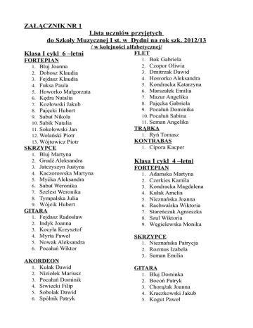 ZAŁĄCZNIK NR 1 Lista uczniów przyjętych do Szkoły Muzycznej I st. w Dydni na rok szk. 2012/13 / w kolejności alfabetycznej/ FLET Klasa I cykl 6 –letni 1. Bok Gabriela FORTEPIAN 2. Czopor Oliwia 1. Bluj Joanna 3. Dmitrzak Dawid 2. Dobosz Klaudia 4. Howorko Aleksandra 3. Fejdasz Klaudia 5. Kondracka Katarzyna 4. Fuksa Paula 6. Marszałek Emilia 5. Howorko Małgorzata 7. Mazur Angelika 6. Kędra Natalia 8. Pajęcka Gabriela 7. Kozłowski Jakub 9. Pocałuń Dominika 8. Pajęcki Hubert 10. Pocałuń Sabina 9. Sabat Nikola 11. Seman Angelika 10. Sabik Natalia TRĄBKA 11. Sokołowski Jan 1. Ryń Tomasz 12. Wolański Piotr KONTRABAS 13. Wójtowicz Piotr 1. Cipora Kacper SKRZYPCE 1. Bluj Martyna 2. Grudź Aleksandra Klasa I cykl 4 –letni 3. Jatczyszyn Justyna FORTEPIAN 4. Kaczorowska Martyna 1. Adamska Martyna 5. Myćka Aleksandra 2. Czerkies Kamila 6. Sabat Weronika 3. Kondracka Magdalena 7. Szelest Weronika 4. Kułak Amelia 8. Tympalska Julia 5. Nieznańska Joanna 9. Wójcik Hubert 6. Rachwalska Wiktoria GITARA 7. Stareńczak Agnieszka 1. Fejdasz Radosław 8. Szul Wiktoria 2. Indyk Joanna 9. Węgielewska Monika 3. Kocyła Krzysztof 4. Myrta Paweł SKRZYPCE 5. Nowak Aleksandra 1. Nieznańska Patrycja 6. Pocałuń Wiktor 2. Rozmus Izabela 3. Seman Emilia AKORDEON 1. Kułak Dawid GITARA 2. Niziołek Mariusz 1. Bluj Dominka 3. Pocałuń Dominik 2. Bocoń Patryk 4. Siwiecki Filip 3. Chorążak Joanna 5. Sobolak Dawid 4. Kraczkowski Jakub 6. Spólnik Patryk 5. Kogut Paweł 6. Pobidyński Krystian AKORDEON 1. Czopor Michał 2. Rachwalska Gabriela 3. Sokołowski Michał 4. Szul Adrian 5. Tyczka Dawid FLET 1. Ćwian Patrycja 2. Grudź Monika 3. Folta Martyna 4. Kafara Kinga 5. Zdybek Emilia 6. Zimoń Natalia KLARNET 1. Frydryk Monika 2. Miksiewicz Mirosław 3. Skawiński Jakub SAKSOFON 1. Ryń Monika 2. Rzeszut Martyna 3. Wójcik Karol TRĄBKA 1. Rysz Radosław KONTRABAS 1. Rozmus Seweryn 2. Tabisz Kamila Klasa II cykl 4 –letni FORTEPIAN 1. Nieznańska Weronika 2. Preisner Gabriela GITARA 1. Adamska Natalia 2. Kot Katarzyna 3. Kot Paulina 4. Kwiatkowska Alicja 5. Malawska Natalia 6. Sokołowska Diana 7. Szelest Katarzyna AKORDEON 1. Brodzicki Krystian 2. Fejdasz Tobiasz 3. Indyk Przemysław 4. Malawski Jan 5. Malawski Michał FLET 1. Czopor Aleksandra 2. Kułak Aleksandra 3. Kwiatkowska Aneta 4. Pocałuń Karolina 5. Wójcik Justyna KLARNET 1. Kozłowska Dominika 2. Mazur Izabela 3. Malawski Karol 4. Milczanowska Aleksandra 5. Rozmus Natalia 6. Stadnik Anna SAKSOFON 1. Nowak Katarzyna 2. Ryń Anna 3. Sidor Przemysław 4. Siwiecki Tobiasz TRĄBKA 1. Nieznański Piotr 2. Pałys Radosław 3. Serafin Sławomir 4. Szuba Piotr KONTRABAS 1. Czurzydło Szymon 2. Janowicz Jan ZAŁĄCZNIK NR 2 Lista kandydatów rezerwowych do Szkoły Muzycznej Ist. w Dydni na rok szk. 2012/13 3. Dmitrzak Kamila Klasa I cykl 6 –letni FORTEPIAN 1. Kłodawska Aleksandra 2. Kucharska Julia 3. Oleniacz Oliwia SKRZYPCE 1. Fejdasz Aleksandra 2. Kondracka Aleksandra GITARA 1. Chorążak Kacper 2. Jatczyszyn Mikołaj 3. Truchan Jarosław 4. Wójcik Natalia AKORDEON 1. Bluj Jakub 2. Gaworecki Wojciech 3. Szewczyk Karol FLET 1. Florczak Michalina 2. Pelc Fabian PERKUSJA 1. Koczarga Adrian Howorko Zuzanna Indyk Tomasz Nieznańska Marta Szałyga Wiktor Żak Jakub AKORDEON 1. Bok Daniel 2. Klimowicz Karol 3. Szmyd Maksymilian FLET 1. Krowiak Kamila 2. Czerkies Dominika KLARNET 1. Chorążak Gabriela 2. Kraczkowski Dawid 3. Krowiak Zuzanna SAKSOFON 1. Dobosz Marta 2. Milczanowska Emilia 3. Sokołowski Damian PERKUSJA 1. Tyczka Simona 4. 5. 6. 7. 8. Klasa II cykl 4 –letni Klasa I cykl 4 –letni FORTEPIAN 1. Węgrzyńska Monika GITARA 1. Baran Dawid 2. Bluj Martyna GITARA 1. Pocałuń Natalia 2. Szul Klaudia FLET 1. Drozd Magdalena