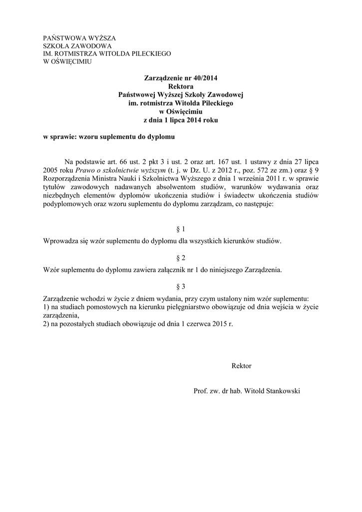 Zarządzenie nr 40/2014 Rektora Państwowej Wyższej Szkoły
