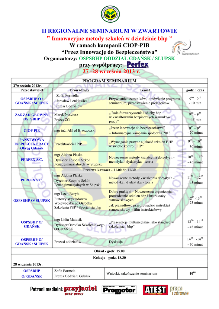 II REGIONALNE SEMINARIUM W ZWARTOWIE ” Innowacyjne metody szkoleń w dziedzinie bhp ” W ramach kampanii CIOP-PIB “Przez Innowację do Bezpieczeństwa” Organizatorzy: OSPSBHP ODDZIAŁ GDAŃSK / SŁUPSK przy współpracy: 27 -28 września 2013 r. PROGRAM SEMINARIUM 27września 2013r. Przedstawiciel OSPSBHP O / GDAŃSK / SŁUPSK ZARZAD GŁÓWNY OSPSBHP CIOP PIB PANSTWOWA INSPEKCJA PRACY Okręg Gdańsk PERFEX S.C. Prowadzący - Zofia Formella - Jarosław Lenkiewicz Prezesi Oddziałów Temat godz. i czas Przywitanie uczestników, omówienie programu seminarium, przedstawienie prelegentów. 900 - 910 - 10 min Marek Nościusz Prezes ZG „ Rola Stowarzyszenia i służby bhp w kształtowaniu bezpiecznych warunków pracy” 910 – 925 - 15 min mgr inż. Alfred Brzozowski „Przez innowacje do bezpieczeństwa” – Informacyjna kampania społeczna 2013 925 – 945 - 20 minut Przedstawiciel PIP „Wymagania prawne a jakość szkoleń BHP w świetle kontroli PIP” 945 – 1015 - 30 minut mgr Aldona Pląska Dyrektor Zespołu Szkół Ponadgimnazjalnych w Słupsku Nowoczesne metody kształcenia dorosłych metodyka i dydaktyka - teoria 1015 – 1100 - 45 minut Przerwa kawowa - 11.00 do 11.30 PERFEX S.C. mgr Aldona Pląska Dyrektor Zespołu Szkół Ponadgimnazjalnych w Słupsku Nowoczesne metody kształcenia dorosłych metodyka i dydaktyka - teoria 1130 – 1215 - 45 minut OSPSBHP O/ SŁUPSK mgr Lech Boryła Etatowy Wykładowca Wojewódzkiego Ośrodka Szkolenia PSP / Specjalista bhp Dobre praktyki – Nowoczesna organizacja, prowadzenie szkoleń bhp i instruktaży stanowiskowych. Jak prawidłowo przeprowadzić instruktaż stanowiskowy – film instruktażowy 1215 -1330 - 75 minut mgr Lidia Matusik Dyrektor Ośrodka Szkoleniowego O/GDAŃSK „Prezentacje multimedialne jako standard w szkoleniach bhp” 1330 – 1415 - 45 minut Prezesi oddziałów Dyskusja 1415 -1445 - 30 minut OSPSBHP O/ GDAŃSK OSPSBHP O/ GDAŃSK / SŁUPSK Obiad - godz. 15.00 Kolacja - godz. 18.30 28 września 2013r. OSPSBHP O/ GDAŃSK Zofia Formela Prezes Oddziału Gdańsk Patroni medialni: Wnioski, zakończenie seminarium 1000