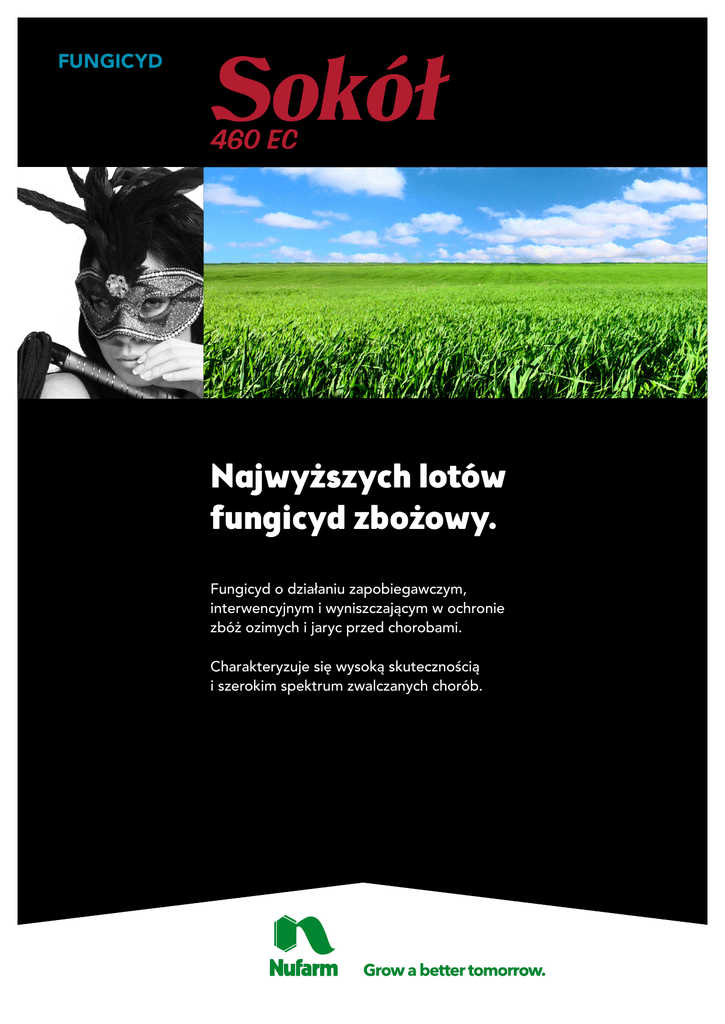 FUNGICYD Najwyższych lotów fungicyd zbożowy. Fungicyd o działaniu zapobiegawczym, interwencyjnym i wyniszczającym w ochronie zbóż ozimych i jaryc przed chorobami. Charakteryzuje się wysoką skutecznością i szerokim spektrum zwalczanych chorób. Najwyższych lotów fungicyd zbożowy. Skuteczność (%) działania fungicydu Sokół 460 EC w pszenicy ozimej, IOR Sośniowice 2006 • preparat porównawczy • Sokół 0,6 l/ha 100 90 zabieg 6.06, BBCH 45-47 70 60 mączniak prawdziwy septorioza plew (liście) septorioza paskowana liści rdza brunatna brunatna plamistość liści septorioza plew Skuteczność (%) działania fungicydu Sokół 460 EC w pszenżycie ozimym, IOR Sośniowice 2006 • preparat porównawczy • Sokół 0,6 l/ha 100 90 Systemy dwuzabiegowe • pszenica jara – na średnich i słabszych glebach mączniak, rdza brunatna i żółta, septoriozy liści i plew, brunatna plamistość liści • pszenica ozima późno siana, po dobrych przedplonach (nie zbożowych) • żyto populacyjne – na średnich i słabszych glebach mączniak, rdza brunatna, rynchosporioza Pierwsze zabiegi należy wykonać w fazie BBCH 30-31, czyli na początku strzelania w źdźbło lub w fazie 1. kolanka, najlepiej fungicydem jednocześnie zwalczającym choroby podstawy źdźbła, mączniaka, septoriozę liści. • pszenżyto – na średnich i słabszych glebach mączniak, rdza brunatna, septoriozy liści i plew 80 50 Systemy jednozabiegowe Zabieg w fazie BBCH 39-49, czyli na wykształcony już całkowicie liść flagowy ale jeszcze przed pojawieniem się kłosa. Sokół 460 SC 0,5 l/ha zabieg 5.06, BBCH 45-47 80 70 60 50 mączniak prawdziwy septorioza plew (liście) rynchosporioza zbóż rdza brunatna brunatna plamistość liści fuzarioza kłosów Wpływ stosowania fungicydu Sokół na wzrost plonu ziarna • kontrola • Sokół 460 EC 160 % kontroli 80 60 warunki silnego porażenia roślin Pierwsze zabiegi należy wykonać w fazie BBCH 30-31, czyli na początku strzelania w źdźbło lub w fazie 1. kolanka, najlepiej fungicydem jednocześnie zwalczającym w życie: choroby podstawy źdźbła, mączniaka i rynchosporiozę; w pszenżycie na: choroby podstawy źdźbła, mączniaka i septoriozę. Drugie zabiegi zalecamy wykonać w fazie BBCH 55-59, czyli od pełni do końca kłoszenia (na kłos): Sokół 460 EC w dawce 0,6 l/ha (szczególnie rdza brunatna, rynchosporioza (na życie) i septorioza liści i plew (na pszenżycie) oraz fuzarioza kłosów na obu gatunkach). inny fungicyd Sokół 460 SC 0,5 l/ha • jęczmień jary browarniany – na dobrych glebach Zabieg w fazie BBCH 37-39, czyli widoczny ale nierozwinięty jeszcze liść flagowy lub też w pełni wykształcony liść. Pierwsze zabiegi należy wykonać w fazie BBCH 30-31, czyli na samym początku strzelania w źdźbło do fazy 1. kolanka, najlepiej fungicydem jednocześnie zwalczającym choroby podstawy źdźbła, mączniaka, rynchosporiozę i plamistość siatkową. inny fungicyd 100 % powierzchni asymilacyjnej 80 60 40 20 0 i jęczmień ozimy Drugie zabiegi zalecamy wykonać w fazie BBCH 45-49, czyli na wykształcony już liść flagowy ale jeszcze przed pojawieniem się kłosa (wypuszczanie ości): Sokół 460 EC w dawce 0,6 l/ha (mączniak, rdzę karłowa, rynchosporioza i plamistość siatkowa). warunki słabego porażenia roślin Wpływ stosowania fungicydu Sokół na powierzchnię asymilacyjną liścia flagowego • kontrola • preparat porównawczy • Sokół 0,6 l/ha Sokół 460 SC 0,5 l/ha • jęczmień jary i ozimy – na średnich i słabszych glebach mączniak, rdza karłowa, rynchosporioza, plamistość siatkowa Sokół 460 SC 0,5 l/ha 100 Drugie zabiegi zalecamy wykonać: – przy deszczowej pogodzie w fazie BBCH 39-49, czyli na całkowicie wykształcony już liść flagowy, ale jeszcze przed pojawieniem się kłosa. Sokół 460 EC w dawce 0,6 l/ha (mączniak, rdza brunatna i żółta, septorioza liści, plew i brunatna plamistość liści). – natomiast gdy w okresie 2-3 tygodni po pierwszym zabiegu jest sucha i ciepła pogoda, to zabiegi należy opóźnić i wykonać w fazie BBCH 51-59, czyli od początku do końca fazy kłoszenia (na kłos). Sokół 460 EC w dawce 0,6 l/ha (mączniak, rdza brunatna i żółta, septorioza liści i plew, brunatna plamistość liści oraz dodatkowo fuzarioza kłosów). inny fungicyd 140 120 • pszenica jara uprawiana na dobrych glebach lub też siana wcześnie (np. w trzeciej dekadzie marca) • żyto mieszańcowe i pszenżyto – na dobrych glebach Sokół 460 SC 0,5 l/ha kłos Substancje aktywne liść 1 – flagowy spiroksamina – 250 g w 1 litrze środka (25,25%) tebukonazol – 167 g w 1 litrze środka (16,86%) triadimenol – 43 g w 1 litrze środka (4,34%) liść 2 – podflagowy liść 3 Formulacje i działanie liść 4 Środek grzybobójczy w formie koncentratu do sporządzania emulsji wodnej o działaniu układowym, do stosowania zapobiegawczego, interwencyjnego oraz wyniszczającego w ochronie zbóż ozimych i jarych oraz przed chorobami grzybowymi. Zakres stosowania • pszenica ozima, pszenica jara mączniak prawdziwy zbóż i traw, rdza brunatna, brunatna plamistość liści, septorioza paskowana liści, septorioza plew, fuzarioza kłosów • pszenżyto ozime, pszenżyto jare mączniak prawdziwy zbóż i traw, septorioza paskowana liści, brunatna plamistość liści, septorioza plew, fuzarioza kłosów, rynchosporioza zbóż • jęczmień ozimy, jęczmień jary mączniak prawdziwy zbóż i traw, rdza karłowa, rynchosporioza zbóż, plamistość siatkowa liści jęczmienia • żyto ozime mączniak prawdziwy zbóż i traw, rdza brunatna, rdza źdźbłowa, rynchosporioza zbóż, septorioza plew Zalecana dawka: 0,6 l/ha Środek stosować zapobiegawczo lub z chwilą wystąpienia pierwszych objawów chorób: – pszenica, pszenżyto, jęczmień: od fazy 3 kolanka znajdującego się co najmniej 2 cm nad 2 kolankiem do końca fazy kwitnienia, BBCH 33-69; – żyt