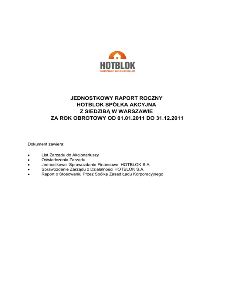 JEDNOSTKOWY RAPORT ROCZNY HOTBLOK SPÓŁKA AKCYJNA Z SIEDZIBĄ W WARSZAWIE ZA ROK OBROTOWY OD 01.01.2011 DO 31.12.2011 Dokument zawiera: List Zarządu do Akcjonariuszy Oświadczenia Zarządu Jednostkowe Sprawozdanie Finansowe HOTBLOK S.A. Sprawozdanie Zarządu z Działalności HOTBLOK S.A. Raport o Stosowaniu Przez Spółkę Zasad Ładu Korporacyjnego List Zarządu HOTBLOK S.A. do Akcjonariuszy Spółki Szanowni Państwo, Drodzy Akcjonariusze, Rok 2011 to rok trudnej sytuacji ekonomicznej Spółki oraz rok dalszych spadków w sektorze budownictwa mieszkaniowego, co w pełni odzwierciedlają zaprezentowane przez nas wyniki finansowe. W roku 2011 zaszły istotne zmiany organach zarządczych Spółki. Zmienił się skład Zarządu Spółki i liczebność jego członków. Zmiany te zaowocowały podjęciem prac nad opracowaniem nowej strategii rozwoju dla HOTBLOK S.A. w długoterminowej perspektywie czasowej. Pisząc te słowa jako wstęp do przedkładanego Państwu Raportu Rocznego zapewniamy Państwa, że dzięki podjętym przez Zarząd działaniom restrukturyzacyjnym dotychczasowa zła koniunktura zostanie w najbliższym czasie przezwyciężona. Zmiany czynione przez Zarząd przyniosą w konsekwencji stabilizację w Spółce i naprawę jej ekonomiki. W wyniku podjętych działań restrukturyzacyjnych, Zarząd zdecydował o całkowitej likwidacji zakładu produkcyjnego w Dąbrowie Górniczej oraz przeniesieniu produkcji systemu HOTBLOK do Spółki zależnej z siedzibą w Chrośnicy, która posiada doskonale przygotowaną do realizacji zadań produkcyjnych infrastrukturę. Zlokalizowanie produkcji w Spółce zależnej pozwoli Spółce zwiększyć zdolność produkcyjną oraz poprawić parametry jakościowe wyrobów. Dzięki nowej technologii w sposób znaczący obniży się koszt wytworzenia bloczków, co wpłynie na poprawę rentowności. Opracowane przez Zarząd zamierzenia strategiczne Spółki zakładają aktywność w trzech głównych obszarach : Sprzedaż bloczków HOTBLOK: na terenie Polski, na terenie Unii Europejskiej oraz poza Unią Europejską - zamierzeniu temu sprzyja uzyskanie przez Spółkę w maju 2011r. Certyfikatu Domów Pasywnych w Darmstadt w Niemczech. Spółka weszła w rok 2012 z bogatym portfelem zamówień, czego przykładem jest podpisany w lutym b.r. kontrakt z włoskim partnerem firmą V7Group z siedzibą w Iserni. Sprzedaż licencji oraz technologii produkcji bloczków HOTBLOK – Zarząd prowadzi obecnie finalne rozmowy ze Spółką Elitstroy z terenu Federacji Rosyjskiej na temat sprzedaży licencji i technologii produkcji. Zarząd przewiduje podpisanie umowy na przełomie II oraz III kwartału br. Ponadto prowadzone są rozmowy z trzema potencjalnymi partnerami na terenie Polski. Zwiększenie mocy produkcyjnych bloczków HOTBLOK w Spółce zależnej – najważniejszym celem obecnie jest zwiększenie produkcji (docelowej) z ok. 1 400 sztuk dziennie do 3 000 sztuk. Zostanie to zrealizowane poprzez pozyskanie nowoczesnych linii technologicznych, które spowodują obniżenie kosztów produkcyjnych łącznie z kosztami robocizny. Podjęte w ostatnich miesiącach działania polegające na uporządkowaniu spraw Spółki, pozyskaniu kapitału rozwojowego poprzez emisję obligacji oraz silne partnerstwo organizacyjno – finansowe ze Spółką zależną pozwalają z optymizmem spoglądać w przyszłość. Jesteśmy przekonani, że rok 2011 był rokiem ostatecznego rozliczenia z pochodnymi kryzysu finansowego i recesji gospodarczej, a oczekiwane wzrosty, pozwolą zredukować straty poniesione przez Spółkę w latach ubiegłych. Zamierzeniom tym sprzyjają projektowane uregulowania prawne: NFOŚiGW opracowuje nowy ogólnopolski program dopłat do kredytów na domy energooszczędne, zarówno jednorodzinne jak i wielorodzinne. Program „Dopłaty do kredytów na budowę domów energooszczędnych” ma ruszyć od początku 2013 roku. Ponieważ system HOTBLOK idealnie wpisuje się standardy powyższego projektu, istnieje ogromne prawdopodobieństwo szybkiego wzrostu zainteresowania naszym produktem. Przedkładając Państwu niniejszy raport pragniemy serdecznie podziękować za zaufanie, którym obdarzyliście Spółkę i markę HOTBLOK. Zapewniamy Państwa, że dołożymy wszelkich starań, aby nasze ambitne plany na najbliższe lata, przełożyły się na wzrost wartości Spółki HOTBLOK S.A. Z wyrazami szacunku, Prezes Zarządu Robert Flak Wiceprezes Zarządu Krzysztof Szymański OŚWIADCZENIE ZARZĄDU Oświadczamy, że: według naszej najlepszej wiedzy, roczne jednostkowe sprawozdanie finansowe i dane porównywalne sporządzone zostały zgodnie z obowiązującymi zasadami rachunkowości i odzwierciedlają w sposób prawdziwy, rzetelny i jasny sytuacje majątkową i finansową HOTBLOK S.A. oraz wynik finansowy, a także zawierają prawdziwy obraz rozwoju i osiągnięć oraz sytuacji Spółki, w tym opis podstawowych ryzyk i zagrożeń. Warszawa, 1 czerwca 2012r. Prezes Zarządu Wiceprezes Zarządu Robert Flak Krzysztof Szymański OŚWIADCZENIE ZARZĄDU Oświadczamy, że: podmiot uprawniony do badania sprawozdania finansowego za 2011 rok tj. Biuro Biegłego Rewidenta Dorota Kowalska z siedzibą w Częstochowie przy ulicy Stanisławy 11, wpisana przez Krajową Radę Biegłych Rewidentów na listę podmiotów uprawnionych do badania sprawozdań finansowych pod numerem 2333 został wybrany zgodnie z przepisami prawa oraz że podmiot ten i biegły rewident dokonujący badania tego sprawozdania, spełnił warunki do wyrażenia bezstronnej i niezależnej opinii o badaniu, zgodnie z właściwymi przepisami prawa. Warszawa, 1 czerwca 2012r. Prezes Zarządu Wiceprezes Zarządu Robert Flak Krzysztof Szymański Hotblok S.A. ul. Sienna 64 00-825 Warszawa NIP 634-24-63-031 Warszawa 07.05.2012 r. SPRAWOZDANIE FINASOWE HOTBLOK SPÓŁKA AKCYJNA za okres od 01.01.2011 do 31.12.2011 Sprawozdanie finansowe obejmuje: Wprowadzenie do sprawozdania finansowego. Bilans na dzień 31.12.2011 r.