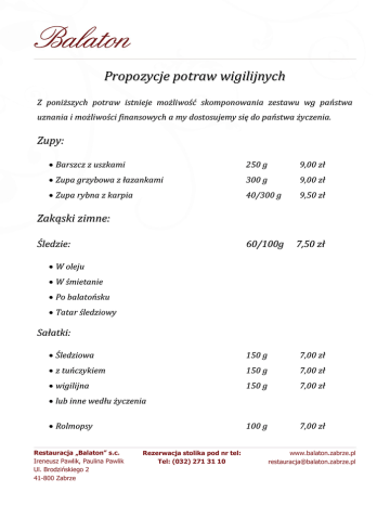 Propozycje potraw wigilijnych - Restauracja Balaton