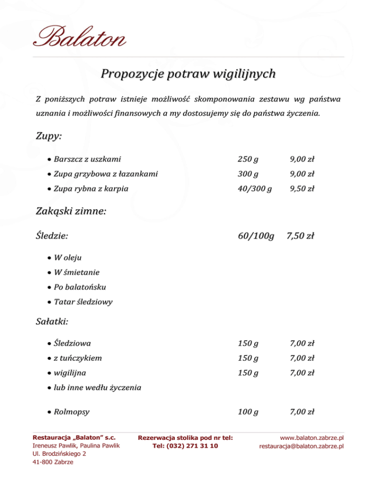 Propozycje potraw wigilijnych Z poniższych potraw istnieje możliwość skomponowania zestawu wg państwa uznania i możliwości finansowych a my dostosujemy się do państwa życzenia. Zupy: Barszcz z uszkami 250 g 9,00 zł Zupa grzybowa z łazankami 300 g 9,00 zł Zupa rybna z karpia 40/300 g 9,50 zł 60/100g 7,50 zł Zakąski zimne: Śledzie: W oleju W śmietanie Po balatońsku Tatar śledziowy Sałatki: Śledziowa 150 g 7,00 zł z tuńczykiem 150 g 7,00 zł wigilijna 150 g 7,00 zł 100 g 7,00 zł lub inne wedłu życzenia Rolmopsy Restauracja „Balaton” s.c. Ireneusz Pawlik, Paulina Pawlik Ul. Brodzińskiego 2 41-800 Zabrze Rezerwacja stolika pod nr tel: Tel: (032) 271 31 10 www.balaton.zabrze.pl [email protected] Kulki rybne na ostro 100 g 7,00 zł Karp po żydowsku 100 g 14,50 zł Karp w galarecie + sos tatarski 100 g 13,50 zł Pstrąg w sosie winno – koperkowym 100 g 10,50 zł Karp faszerowany (roladka) 100 g 13,20 zł Łosoś w sosie ćwikłowym 100/200 g 15,00 zł Sandacz lub łosoś w galarecie 80 g 15,20 zł Stek z łososia zapiekany w sosie z cytrusów 100 g 14,50 zł Pstrąg w migdałach wg wagi 100 g 11,60 zł Łosoś zapiekany w sosie maślanym 100 g 17,00 zł Mintaj panierowany 150 g 15,50 zł Filet z karpia pieczony w piekarniku wg wagi 100 g 13,80 zł Filet z karp soute z pieczarkami wg wagi 100 g 13,80 zł Filet z karpia panierowany wg wagi 100g 12,50 zł Pierogi z kapustą i grzybami 5 szt. 7,50 zł Filet z dorsza zapiekany w jarzynach 100/200 g 16,50 zł Gołąbki z grzybami + sos 150 g Dania gorące: Restauracja „Balaton” s.c. Ireneusz Pawlik, Paulina Pawlik Ul. Brodzińskiego 2 41-800 Zabrze Rezerwacja stolika pod nr tel: Tel: (032) 271 31 10 8,00 zł www.balaton.zabrze.pl [email protected] Dodatki: Kapusta z grzybami lub grochem 150 g 7,80 zł Surówka z kapusty kiszonej z orzechami i winogronami100 g 6,50 zł Krokiety ziemniaczane 150 g 7,00 zł Ziemniaki w ziołach 150 g 4,00 zł Makowiec 100 g 6,00 zł Makówki śląskie 150 g 8,50 zł Piernik świąteczny 100 g 6,00 zł Surówka z brzoskwini i gruszek 100 g 9,50 zł Surówka z jabłek i bakali 100 g 8,50 zł Kompot z owoców suszonych 150 g 4,80 zł Kawa z mlekiem 12 g/150g 7,00 zł Herbata 200 g 4,50 zł Wino 100 ml 6,00 zł Desery: Napoje: Restauracja „Balaton” s.c. Ireneusz Pawlik, Paulina Pawlik Ul. Brodzińskiego 2 41-800 Zabrze Rezerwacja stolika pod nr tel: Tel: (032) 271 31 10 www.balaton.zabrze.pl [email protected] Zestawy obiadowe (do każdego dania zupa do wyboryu): Ryba po marynarsku (dorsz, ziemniaki, jarzyny) 200 g 30,00, zł Filet z mintaja panierowany , ziemniaki, kapusta kiszona 150 g 32,00 zł Karp pieczony, ziemniaki, kapusta z grzybami 200 g 40,00 zł Uszka z grzybami 100 g 5,00 zł Karp w galarecie 80/130 g 9,50 zł Karp po żydowsku 100/250 g 10,00 zł Wynosy: Restauracja „Balaton” s.c. Ireneusz Pawlik, Paulina Pawlik Ul. Brodzińskiego 2 41-800 Zabrze Rezerwacja stolika pod nr tel: Tel: (032) 271 31 10 www.balaton.zabrze.pl [email protected]