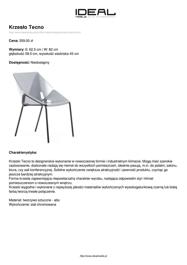 Krzesło Tecno http://www.idealmeble.pl/pl/offer/meble/krzesla/krzeslo-tecno.html/ Cena: 359.00 zł Wymiary: S: 62,5 cm | W: 82 cm głębokość 58.5 cm, wysokość siedziska 45 cm Dostępność: Niedostępny Charakterystyka: Krzesło Tecno to designerskie wykonanie w nowoczesnej formie i industrialnym klimacie. Mogą mieć szerokie zastosowanie, doskonale nadają się niemal do wszystkich pomieszczeń, idealnie pasują, m.in. do jadalni, salonu, biura, czy sali konferencyjnej. Solidne wykończenie zwiększa atrakcyjność i pewność produktu, czyniąc go jeszcze bardziej atrakcyjnym. Forma krzesła zapewniająca niepowtarzalny charakter wyrobu, nadająca odpowiedni styl i klimat pomieszczeniom o nowoczesnym wnętrzu. Krzesło wygodne i wykonane z najwyższej jakości materiałów wykończonych wysokogatunkową czarną lub białą farbą tworzą trwałe połączenie. Materiał: tworzywo sztuczne - abs Wykończenie: stal chromowana http://www.idealmeble.pl Dostępne wersje produktu: nazwa produktu Krzesło Tecno warianty kolor szary cena 359.00zł http://www.idealmeble.pl dostępne Zapytaj Zdjęcia produktu: http://www.idealmeble.pl Powered by TCPDF (www.tcpdf.org)
