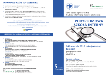 INFORMACJE WAŻNE DLA UCZESTNIKA Towarzystwo Internistów Polskich Uczestnictwo w Sympozjum nie wymaga wcześniejszego potwierdzenia Warunkiem otrzymania certyfikatu jest rejestracja przy stoisku firmy SYMPOSION do godz. 10.00 oraz obecność na wykładach Lekarz uczestniczący w Sympozjum uzyska 5 punktów edukacyjnych zgodnie z Rozporządzeniem Ministra Zdrowia w sprawie sposobów dopełnienia obowiązków doskonalenia zawodowego lekarzy i lekarzy dentystów z dnia 10.06.2004 r. zał. nr 3 Mamy zaszczyt zaprosić Państwa do udziału w Konferencji Naukowo-Szkoleniowej Na zakończenie Sympozjum wśród osób, które wypełnią ankietę i będą znajdować się na sali obrad, zostaną rozlosowane atrakcyjne nagrody Szanowni Państwo, PODYPLOMOWA SZKOŁA INTERNY wśród naszych Drogich Gości–Uczestników Podyplomowej Szkoły Interny zostaną rozlosowane bardzo atrakcyjne nagrody rzeczowe w postaci m.in. vouchera o wartości 1000 zł do zrealizowania w biurze podróży Rainbow Tours. Bardzo serdecznie zapraszamy do udziału w Konferencji i do wypróbowania swojego szczęścia podczas losowania nagród. SERDECZNIE ZAPRASZAMY PAŃSTWA DO UDZIAŁU W SPOTKANIACH SZCZECIN 26 czerwca 2010 PODYPLOMOWA SZKOŁA POLSKIEGO TOWARZYSTWA ALERGOLOGICZNEGO Patronat Naukowy: Prof. dr hab. n. med. Barbara Rogala, Prof. zw. dr hab. n. med. Piotr Kuna 23 października 2010 PODYPLOMOWA SZKOŁA POLSKIEGO TOWARZYSTWA PEDIATRYCZNEGO Patronat Naukowy: Prof. dr hab. n. med. Mieczysława Czerwionka-Szaflarska SZCZECIN 24 kwietnia 2010 roku (sobota) Szczecin WISŁA 27-29 maja 2010 JUBILEUSZOWY ZJAZD POLSKIEGO TOWARZYSTWA MEDYCYNY RODZINNEJ Przewodniczący: Prof. dr hab. n. med. Andrzej Steciwko Hotel Radisson Blu (I piętro) Plac Rodła 10 godz. 8.20-14.00 WARSZAWA 9-11 września 2010 VIII ZJAZD POLSKIEGO TOWARZYSTWA MEDYCYNY RODZINNEJ ‘’MEDYCYNA RODZINNA – PASJA I POWOŁANIE” Przewodniczący: Prof. dr hab. med. Andrzej Wardyn, Prof. dr hab. med. Andrzej Steciwko SZCZECIN POZNAŃ Patronat naukowy: 11-13 czerwca 2010 XIV KONGRES POLSKIEGO TOWARZYSTWA GASTROENTEROLOGII Patronat Naukowy: Prof. dr hab. n. med. Teresa Starzyńska 22-23 października 2010 III JESIENNE SPOTKANIE KARDIOLOGÓW Przewodniczący: Prof. dr hab. med. Stefan Grajek Pełen Kalendarz spotkań firmy Symposion na stronie www.symposion.pl ul. Obornicka 229, 60-650 Poznań tel. 061 66 28 170, fax 061 66 28 171 [email protected], www.symposion.pl 5 prof. dr hab. n. med. Jacek Musiał Prezes Zarządu Głównego Towarzystwa Internistów Polskich prof. dr hab. n. med. Andrzej Szczeklik Prezes Elekt Zarządu Głównego Towarzystwa Internistów Polskich punktÓW edukacyjnYCH dr hab. n. med. Andrzej Wojtarowicz Przewodniczący Oddziału Zachodniopomorskiego Towarzystwa Internistów Polskich ORGANIZATORZY PROGRAM 8.20-8.50 Rejestracja uczestników Zwiedzanie wystawy medycznej Towarzystwo Internistów Polskich Partnerzy Konferencji astellas pharma az medica glaxosmithkline herba studio herbapol poznań herbapol wrocław perffarma polfa warszawa valeant PATRONAT MEDIALNY 8.45-9.00 Powitanie Gości. Rozpoczęcie Konferencji Prof. dr hab. n. med. Zdzisława Kornacewicz-Jach, Małgorzata Hein 9.00-10.00 SESJA I Kardiologia Przewodnicząca: Prof. dr hab. n. med. Zdzisława Kornacewicz-Jach Kardiomiopatie: kiedy rozpoznawać, jak postępować. Dr hab. n. med. Andrzej Wojtarowicz Aktualne standardy postępowania w infekcyjnym zapaleniu wsierdzia. Dr hab. n. med. Małgorzata Peregud-Pogorzelska Dyskusja 10.00-10.05 10.05-11.30 Prezentacja produktów firmy Perffarma/przedstawiciel firmy Perffarma SESJA II Onkologia i gastrologia Przewodniczący: prof. dr hab. n. med. Jan Lubiński Możliwości endoskopowego leczenia raka żołądka. Prof. dr hab. n. med. Dariusz Bielicki Postępy w genetyce klinicznej nowotworów. Prof. dr hab. n. med. Jan Lubiński Chemoprewencja raka jelita grubego u chorych na nieswoiste zapalenie jelit. Dr n.med. Katarzyna Karolewska-Bochenek Dyskusja 11.30-11.50 Przerwa 11.50-12.50 SESJA III Nefrologia Przewodniczący: prof. dr hab. n. med. Kazimierz Ciechanowski Gospodarka wodno-elektrolitowa – jak zlecać “kroplówki”? Prof. dr hab. n. med. Kazimierz Ciechanowski Kłębuszkowe zapalenie nerek – co powinien wiedzieć internista? Prof. dr hab. n. med. Leszek Domański Dyskusja 12.50-13.50 SESJA IV Endokrynologia Przewodniczący: dr hab. n. med. Tomasz Miazgowski Współczesne metody leczenia osteoporozy. Dr hab. n. med. Tomasz Miazgowski Guzki nadnerczy – kiedy obserwować, kiedy operować? Dr n. med. Henryk Fuchs Dyskusja 13.50-14.00 Zamknięcie Sympozjum Losowanie nagród. Wręczanie certyfikatów uczestnictwa.