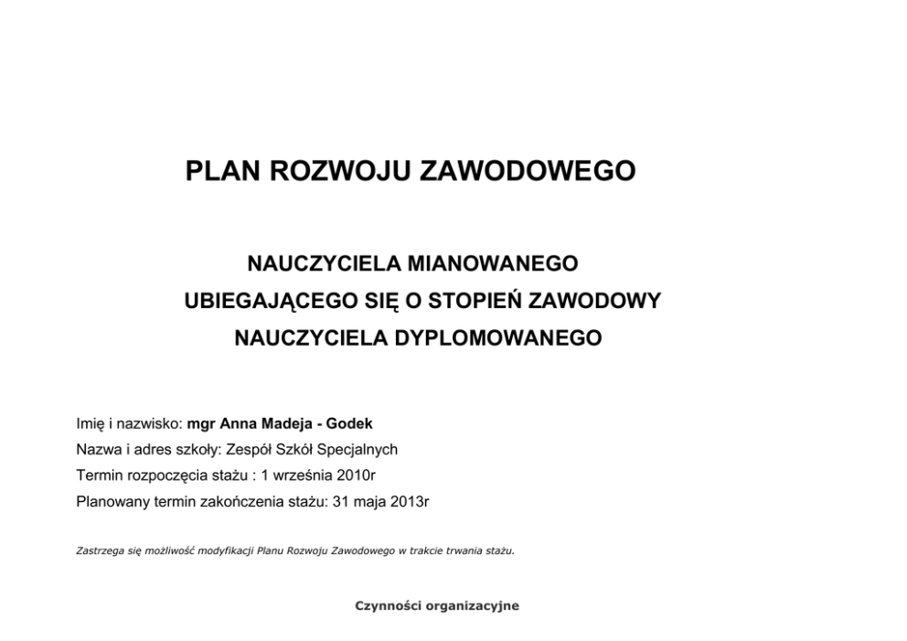 PLAN ROZWOJU ZAWODOWEGO NAUCZYCIELA MIANOWANEGO UBIEGAJĄCEGO SIĘ O STOPIEŃ ZAWODOWY NAUCZYCIELA DYPLOMOWANEGO Imię i nazwisko: mgr Anna Madeja - Godek Nazwa i adres szkoły: Zespół Szkół Specjalnych Termin rozpoczęcia staŜu : 1 września 2010r Planowany termin zakończenia staŜu: 31 maja 2013r Zastrzega się moŜliwość modyfikacji Planu Rozwoju Zawodowego w trakcie trwania staŜu. Czynności organizacyjne Lp. 1. Zadania Poznanie procedury awansu zawodowego i przygotowanie projektu planu rozwoju. Formy realizacji • • • • 2. Dokumentowanie realizacji planu rozwoju zawodowego. • • 3. Opracowanie projektu sprawozdania z realizacji planu rozwoju zawodowego. • • Zapoznanie się ze stosownymi przepisami prawa oświatowego dotyczącymi awansu zawodowego nauczycieli. Śledzenie zmian dokonywanych w Karcie Nauczyciela oraz prawie oświatowym Opracowanie planu rozwoju zawodowego. Sformułowanie wniosku o otwarcie staŜu . Termin Sposób dokumentowania IX 2010 - wniosek - projekt planu rozwoju zawodowego Zbieranie informacji o realizacji zadań, gromadzenie dokumentów, zaświadczeń o ukończeniu róŜnych form doskonalenia zawodowego, opracowań, kserokopii i innych materiałów Uzyskanie oceny dorobku zawodowego cały okres staŜu Przygotowanie projektu sprawozdania z realizacji zatwierdzonego planu rozwoju ZłoŜenie wniosku o podjęcie postępowania kwalifikacyjnego. Maj 2013 - świadectwa, zaświadczenia itp. - ocena dorobku zawodowego dokonana przez dyrektora szkoły - sprawozdanie § 8 ust.2 pkt 1 Uzyskanie pozytywnych efektów 2 w pracy dydaktycznej, wychowawczej lub opiekuńczej na skutek wdroŜenia działań mających na celu doskonalenie pracy własnej i podniesienie jakości pracy szkoły. Lp. 1. Zadania Poszerzanie wiedzy i umiejętności w procesie aktywnego udziału w wewnątrzszkolnym i zewnętrznym doskonaleniu • • • Współpraca z rodzicami • 2. • Termin Samodzielne studiowanie literatury pedagogicznej. Udział w szkoleniowych Radach Pedagogicznych Uczestniczenie w róŜnych formach doskonalenia zawodowego, szkoleniach, warsztatach adekwatnych do potrzeb własnych i szkoły. cały okres staŜu Włączenie rodziców do prac na rzecz dzieci Pomoc ze strony rodziców w organizowaniu imprez klasowych i uroczystości szkolnych. cały okres staŜu cały okres staŜu Przygotowywanie artykułów do prasy z imprez i uroczystości prowadzonych przez siebie Podnoszenie kultury pedagogicznej rodziców. • Referaty o określonej tematyce podczas zebrań z rodzicami Dbanie o bezpieczeństwo uczniów • Nauka bezpiecznego , samodzielnego Okres staŜu poruszanie się po ulicach Spotkanie z policjantem Bezpieczne przebywanie na terenie szkoły Bezpieczne poruszanie się środkami lokomocji . • • • -Zestawienie bibliografii. zdjęcia Zapisy w dzienniku lekcyjnym • 6. Sposób dokumentowania - zaświadczenia - notatki z udziału w szkoleniach Promocja szkoły w środowisku 3. 4. Formy realizacji zdjęcia, notatki w prasie Okres staŜu Wpis do dziennika 3 WdraŜanie uczniów do samodzielności i zaradności Ŝyciowej Zajęcia w sklepach samoobsługowych i zwykłych, na poczcie , na dworcu PKP, PKS itp. Przygotowywanie róŜnego rodzaju posiłków Przygotowywanie pomocy dydaktycznych , kart pracy Poszukiwanie nowości wydawniczych dotyczących wychowania i pracy z dziećmi Okres staŜu niepełnosprawnymi a w szczególności upośledzonych umysłowo w stopniu umiarkowanym i znacznym. Gromadzenie gotowych pomocy dydaktycznych przydatnych w pracy : układanki , puzzle itp. Wpis do dziennika • Zbiórka grosików wśród uczniów na karmę dla psiaków ze schroniska dla zwierząt w Brzegu Poświadczenie z zakładu higieny komunalnej w Brzegu • Organizacja wycieczek klasowych np.; Zamek Piastów Śląskich , Muzeum wsi opolskiej w Bierkowicach • • Rozwijanie i doskonalenie własnego • 7. warsztatu pracy • • 8. Udział w akcjach : ,, Grosik dla psiaka” 9. Rozwijanie zainteresowań młodzieŜy dziedzictwem kulturowym miasta i regionu Okres staŜu Okres staŜu wpis do dziennika ,Karty wycieczki § 8 ust.2 pkt.2 4 Wykorzystywanie w pracy technologii informacyjnej i komunikacyjnej. Lp. 1. Zadania Zastosowanie technologii komputerowej i informacyjnej w pracy wychowawczej i dydaktycznej, oraz w organizacji warsztatu pracy . Formy realizacji • • • • • • • 2. 3. WdraŜanie uczniów do sprawnego i bezpiecznego posługiwania się komputerem podczas zajęć rewalidacji komputerowej Stosowanie TI i komunikacyjnej w pracy zawodowej i Ŝyciu codziennym • • • • 4. Organizacja warsztatu pracy przy uŜyciu technik komputerowych • Termin Sposób dokumentowania Wykonywanie materiałów dekoracyjnych - wykaz serwisów cały okres staŜu na tablice klasowe. edukacyjnych Pisanie pism do rodziców i innych - przykładowe instytucji pomoce Pisanie sprawozdań z pracy dydaktycznodydaktyczne wychowawczej Pisanie świadectw Wykonywanie pomocy dydaktycznych dla uczniów Pisanie programów indywidualnych i planów tematycznych Opracowanie planu rozwoju zawodowego , oraz analiza materiałów przebiegu staŜu . Stosowanie aktywnych metod podczas Okres prowadzenia Zapisy w dzienniku zajęć aby zainteresować , zachęcić zajęć ,, rewalidacji uczniów do korzystania z komputera komputerowej” Korzystanie z multimedialnych programów edukacyjnych i Internetu na lekcjach rewalidacji komputerowej i w Ŝyciu codziennym Korzystanie z wiedzy i doświadczenia innych nauczycieli Śledzenie zmian w przepisach prawa oświatowego , korzystanie ze stron MEN i KO Wykorzystanie pakietu MS Office do opracowywania dokumentacji oraz wszelkich pomocy dydaktycznych okres staŜu okres staŜu - potwierdzenie dyrektora szkoły Dokumentacja zawodowa § 8 ust.2 pkt.3 5 Umiejętność dzielenia się wiedzą i doświadczeniem z innymi nauczycielami, w tym przez prowadzenie otwartych zajęć, w szczególności dla nauczycieli staŜystów i kontraktowych, prowadzenie zajęć dl