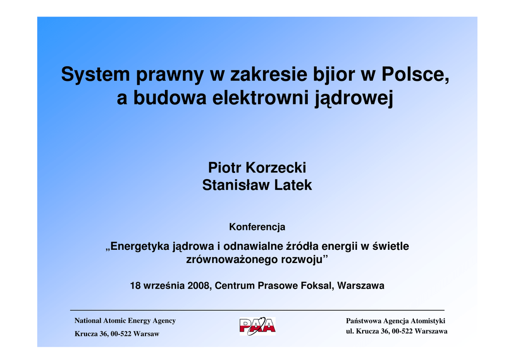 System prawny w zakresie bjior w Polsce, a budowa elektrowni jądrowej Piotr Korzecki Stanisław Latek Konferencja „Energetyka jądrowa i odnawialne źródła energii w świetle zrównoważonego rozwoju” 18 września 2008, Centrum Prasowe Foksal, Warszawa National Atomic Energy Agency Krucza 36, 00-522 Warsaw Państwowa Agencja Atomistyki ul. Krucza 36, 00-522 Warszawa Elektrownia jądrowa różni się od wszelkich innych instalacji przemysłowych, gdyż jej eksploatacja: • • ma wpływ na środowisko liczony w setkach tysięcy lat ewentualna awaria EJ może mieć skutki globalne PRZEPISY NARODOWE MUSZĄ BYĆ ZHARMONIZOWANE W SKALI ŚWIATOWEJ stąd wynika potrzeba stworzenia możliwie uniwersalnego międzynarodowego systemu prawnego National Atomic Energy Agency Krucza 36, 00-522 Warsaw Państwowa Agencja Atomistyki ul. Krucza 36, 00-522 Warszawa Przepisy międzynarodowe, których Polska jest stroną: • Traktat o ustanowieniu Europejskiej Wspólnoty Energii Atomowej, • Konwencje i inne umowy międzynarodowe, w tym umowy bilateralne z państwami sąsiadującymi, • Prawo pochodne UE – w tym najważniejsze dyrektywy i rozporządzenia National Atomic Energy Agency Krucza 36, 00-522 Warsaw Państwowa Agencja Atomistyki ul. Krucza 36, 00-522 Warszawa RP jest stroną następujących umów międzynarodowych: • • • • • • • • • • Konwencji o wczesnym powiadamianiu o awarii jądrowej Konwencji o pomocy w przypadku awarii jądrowej Konwencji bezpieczeństwa jądrowego Wspólnej konwencji bezpieczeństwa w postępowaniu z wypalonym paliwem jądrowym i bezpieczeństwa w postępowaniu z odpadami promieniotwórczymi Konwencji o ochronie fizycznej materiałów jądrowych i obiektów jądrowych Konwencji wiedeńskiej o odpowiedzialności cywilnej za szkody jądrowe Wspólnego protokołu dotyczącego stosowania Konwencji wiedeńskiej i Konwencji paryskiej Układu o nierozprzestrzenianiu broni jądrowej Porozumienia o zabezpieczeniach materiałów jądrowych i Protokołu dodatkowego do tego Porozumienia Konwencji dotyczącej ochrony pracowników przed promieniowaniem jonizującym Podstawą prawa krajowego jest Ustawa z dnia 29 listopada 2000 r. – Prawo atomowe National Atomic Energy Agency Krucza 36, 00-522 Warsaw Państwowa Agencja Atomistyki ul. Krucza 36, 00-522 Warszawa Dyrektywy Unii Europejskiej • dyrektywa Rady 96/29/Euratom z dnia 13 maja 1996 r. ustanawiającej podstawowe normy bezpieczeństwa w zakresie ochrony zdrowia pracowników i ogółu społeczeństwa przed zagrożeniami wynikającymi z promieniowania jonizującego (Dz.Urz. WE L 159 z 29.06.1996, str. 1; Dz.Urz. UE Polskie wydanie specjalne, rozdz. 5, t. 2, str. 291); • dyrektywa Rady 89/618/Euratom z dnia 27 listopada 1989 r. w sprawie informowania ogółu społeczeństwa o środkach ochrony zdrowia, które będą stosowane oraz działaniach, jakie należy podjąć w przypadku pogotowia radiologicznego (Dz.Urz. WE L 357 z 07.12.1989, str. 31; Dz.Urz. UE Polskie wydanie specjalne, rozdz. 15, t. 1, str. 366); • dyrektywa Rady 90/641/Euratom z dnia 4 grudnia 1990 r. w sprawie praktycznej ochrony pracowników zewnętrznych, narażonych na promieniowanie jonizujące podczas pracy na terenie kontrolowanym (Dz.Urz. WE L 349 z 13.12.1990, str. 21, z późn. zm.; Dz.Urz. UE Polskie wydanie specjalne, rozdz. 5, t. 1, str. 405, z późn. zm.); • dyrektywa Rady 92/3/Euratom z dnia 3 lutego 1992 r. w sprawie nadzoru i kontroli przesyłania odpadów radioaktywnych między Państwami Członkowskimi oraz do Wspólnoty i poza jej obszar (Dz. Urz. WE L 35 z 12.02.1992, str. 24; Dz. Urz. UE Polskie wydanie specjalne, rozdz. 15, t. 2, str. 90). National Atomic Energy Agency Krucza 36, 00-522 Warsaw Państwowa Agencja Atomistyki ul. Krucza 36, 00-522 Warszawa Dyrektywy Unii Europejskiej (c.d.) • dyrektywa Rady 97/43/Euratom z dnia 30 czerwca 1997 r. w sprawie ochrony zdrowia osób fizycznych przed niebezpieczeństwem wynikającym z promieniowania jonizującego związanego z badaniami medycznymi oraz uchylającej dyrektywę 84/466/Euratom (Dz.Urz. WE L 180 z 09.07.1997, str. 22, z późn. zm.; Dz.Urz. UE Polskie wydanie specjalne, rozdz. 15, t. 3, str. 332, z późn. zm.); • dyrektywa Rady 2003/122/Euratom z dnia 22 maja 2003 r. w sprawie kontroli wysoce radioaktywnych źródeł zamkniętych i odpadów radioaktywnych (Dz.Urz. UE L 346 z 31.12.2003, str. 57; Dz.Urz. UE Polskie wydanie specjalne, rozdz. 15, t. 7, str. 694).; • dyrektywa Rady 2006/117/EURATOM z dnia 20 listopada 2006 r. w sprawie nadzoru oraz kontroli nad przemieszczaniem odpadów promieniotwórczych i wypalonego paliwa jądrowego (Dz. Urz. UE L 337 z 5.12.2006 s. 21) National Atomic Energy Agency Krucza 36, 00-522 Warsaw Państwowa Agencja Atomistyki ul. Krucza 36, 00-522 Warszawa Najważniejsze Rozporządzenia UE • Rozporządzenie Rady (EURATOM) NR 1493/93 z dnia 8 czerwca 1993 r. w sprawie przesyłania substancji radioaktywnych między Państwami Członkowskimi • Rozporządzenie Komisji (Euratom) Nr 302/2005 z dnia 8 lutego 2005 r. w sprawie stosowania zabezpieczeń przyjętych przez Euratom • Rozporządzenie 737/90/EWG z dnia 22 marca 1990 r. w sprawie warunków regulujących przywóz produktów rolnych pochodzących z państw trzecich w następstwie wypadku w elektrowni jądrowej w Czarnobylu • Rozporządzenie 3954/87/Euratom z dnia 22 grudnia 1987 r. ustanawiające maksymalne dozwolone poziomy skażenia radioaktywnego środków spożywczych oraz pasz po wypadku jądrowym lub w każdym innym przypadku pogotowia radiologicznego Państwowa Agencja Atomistyki •National Atomic Energy Agency Krucza 36, 00-522 Warsaw ul. Krucza 36, 00-522 Warszawa USTAWA z dnia 29 listopada 2000 r. – Prawo atomowe (Dz. U. z 2007 r. Nr 42, poz. 276 oraz z 2008 r. Nr 93, poz. 583) National Atomic Energy Agency Krucza 36, 00-522 Warsaw Państwowa Agencja Atomistyki ul. Krucza 36, 00-522 Warszawa Postanowienia ogólne Ustawa określa m.in.: 1) działalność