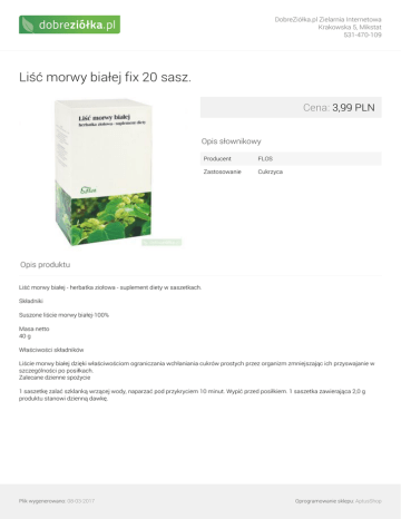 DobreZiółka.pl Zielarnia Internetowa Krakowska 5, Mikstat 531-470-109 Liść morwy białej fix 20 sasz. Cena: 3,99 PLN Opis słownikowy Producent FLOS Zastosowanie Cukrzyca Opis produktu Liść morwy białej - herbatka ziołowa - suplement diety w saszetkach. Składniki Suszone liście morwy białej-100% Masa netto 40 g Właściwości składników Liście morwy białej dzięki właściwościom ograniczania wchłaniania cukrów prostych przez organizm zmniejszając ich przyswajanie w szczególności po posiłkach. Zalecane dzienne spożycie 1 saszetkę zalać szklanką wrzącej wody, naparzać pod przykryciem 10 minut. Wypić przed posiłkiem. 1 saszetka zawierająca 2,0 g produktu stanowi dzienną dawkę. Plik wygenerowano: 08-03-2017 Powered by TCPDF (www.tcpdf.org) Oprogramowanie sklepu: AptusShop