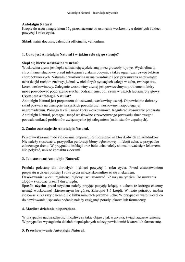 Antotalgin Natural – instrukcja używania Antotalgin Natural Krople do uszu z nagietkiem 15g przeznaczone do usuwania woskowiny u dorosłych i dzieci powyżej 1 roku życia. Skład: natrii docusas, calendula officinalis, vehiculum. 1. Co to jest Antotalgin Natural i w jakim celu się go stosuje? Skąd się bierze woskowina w uchu? Woskowina uszna jest lepką substancją wydzielaną przez gruczoły łojowe. Wydzielina ta chroni kanał słuchowy przed infekcjami i ciałami obcymi, a także ogranicza rozwój bakterii chorobotwórczych. Naturalnie woskowina uszna twardnieje i jest przesuwana na zewnątrz ucha dzięki ruchom żuchwy, jednak w niektórych sytuacjach zalega w uchu, tworząc tzw. korek woskowinowy. Zaleganie woskowiny usznej jest powszechnym problemem, który może powodować pogorszenie słuchu, podrażnienie, ból, szum w uszach lub zawroty głowy. Czym jest Antotalgin Natural? Antotalgin Natural jest preparatem do usuwania woskowiny usznej. Odpowiednio dobrany skład pozwala na usunięcie wszystkich pozostałości woskowiny i zapobiega jej nagromadzeniu. Pomaga także usunąć korki woskowinowe. Regularne stosowanie preparatu Antotalgin Natural, pomaga usunąć woskowinę z zewnętrznego przewodu słuchowego i pozwala uniknąć problemów związanych z jej zaleganiem (m.in. stanów zapalnych). 2. Zanim zastosuje się Antotalgin Natural. Przeciwwskazaniem do stosowania preparatu jest uczulenie na którykolwiek ze składników. Nie należy stosować w przypadku perforacji błony bębenkowej, infekcji ucha, w przypadku założonego drenu. W przypadku infekcji oraz bólu ucha należy skonsultować się z lekarzem. Nie połykać, unikać kontaktu z oczami. 3. Jak stosować Antotalgin Natural? Produkt polecany dla dorosłych i dzieci powyżej 1 roku życia. Przed zastosowaniem preparatu u dzieci poniżej 1 roku życia należy skonsultować się z lekarzem. Dawkowanie: w celu regularnej higieny uszu stosować 1-2 razy na tydzień. Do usuwania złogów stosować przez 3 dni z rzędu. Sposób użycia: przed użyciem należy przyjąć pozycję leżącą, z uchem (z którego chcemy usunąć woskowinę) skierowanym ku górze. Zakropić 3-5 kropli. W razie potrzeby można stosować kilka razy dziennie. Po kilku minutach przemyć ucho. W przypadku wątpliwości co do dawkowania i sposobu podania należy zasięgnąć porady lekarza lub farmaceuty. 4. Możliwe działania niepożądane. W przypadku nadwrażliwości możliwe są takie objawy jak wysypka, świąd, zaczerwienienie. W przypadku wystąpienia działań niepożądanych należy powiadomić lekarza lub farmaceutę. 5. Przechowywanie Antotalgin Natural. Antotalgin Natural – instrukcja używania Nie należy stosować preparatu po upływie terminu ważności określonego na etykiecie i opakowaniu zewnętrznym. Przechowywać w miejscu niedostępnym i niewidocznym dla dzieci. W celu uzyskania bardziej szczegółowych informacji należy zwrócić się do producenta: FARMINA SP. Z O.O. UL. LIPSKA 44 30- 721 KRAKÓW tel. 12 290 90 00 fax. 12 290 90 50 e-mail: [email protected]